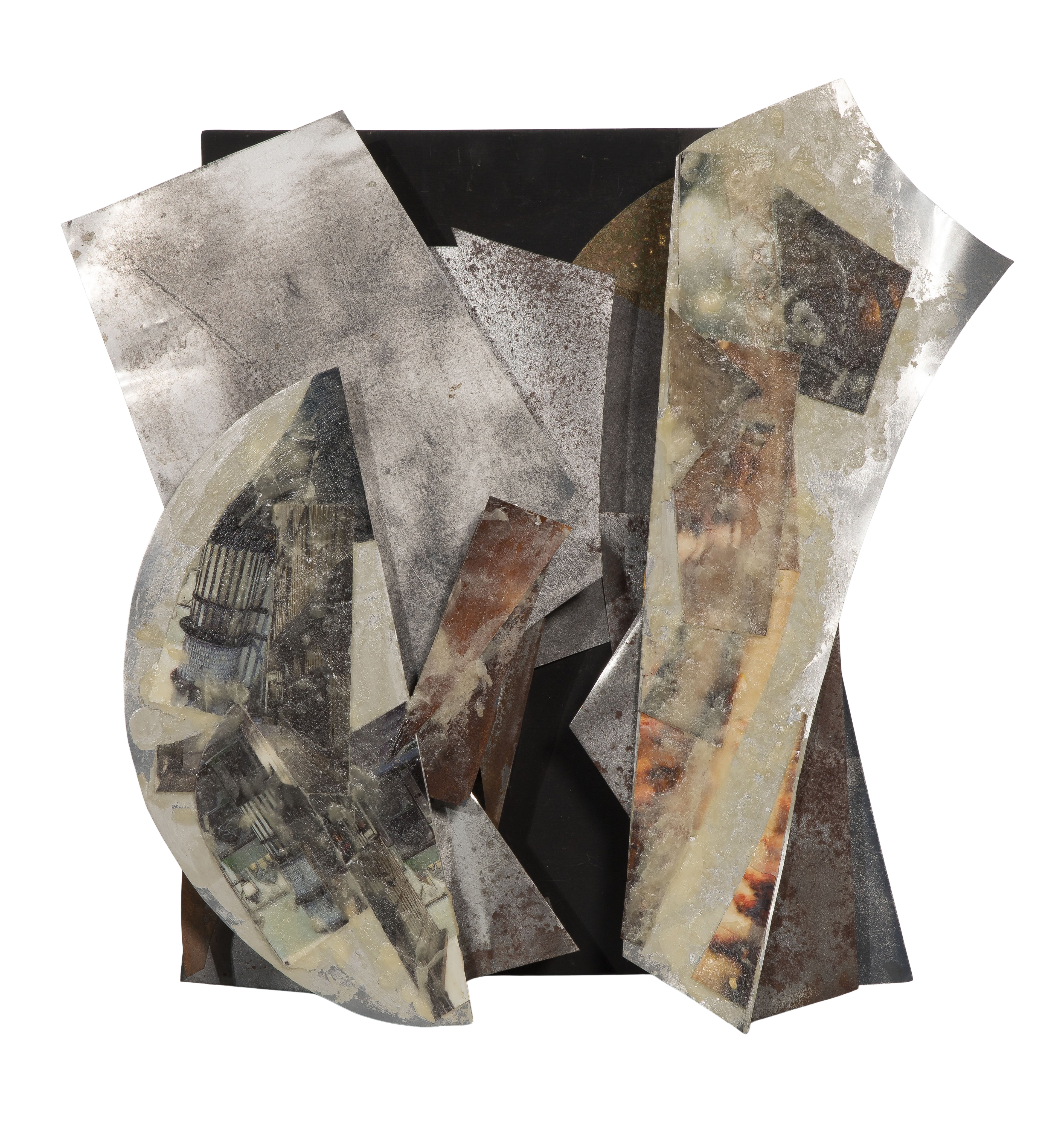 Undated, unsigned, identifying label verso, painted metal sheets attached to a painted wood box support using double-faced tape