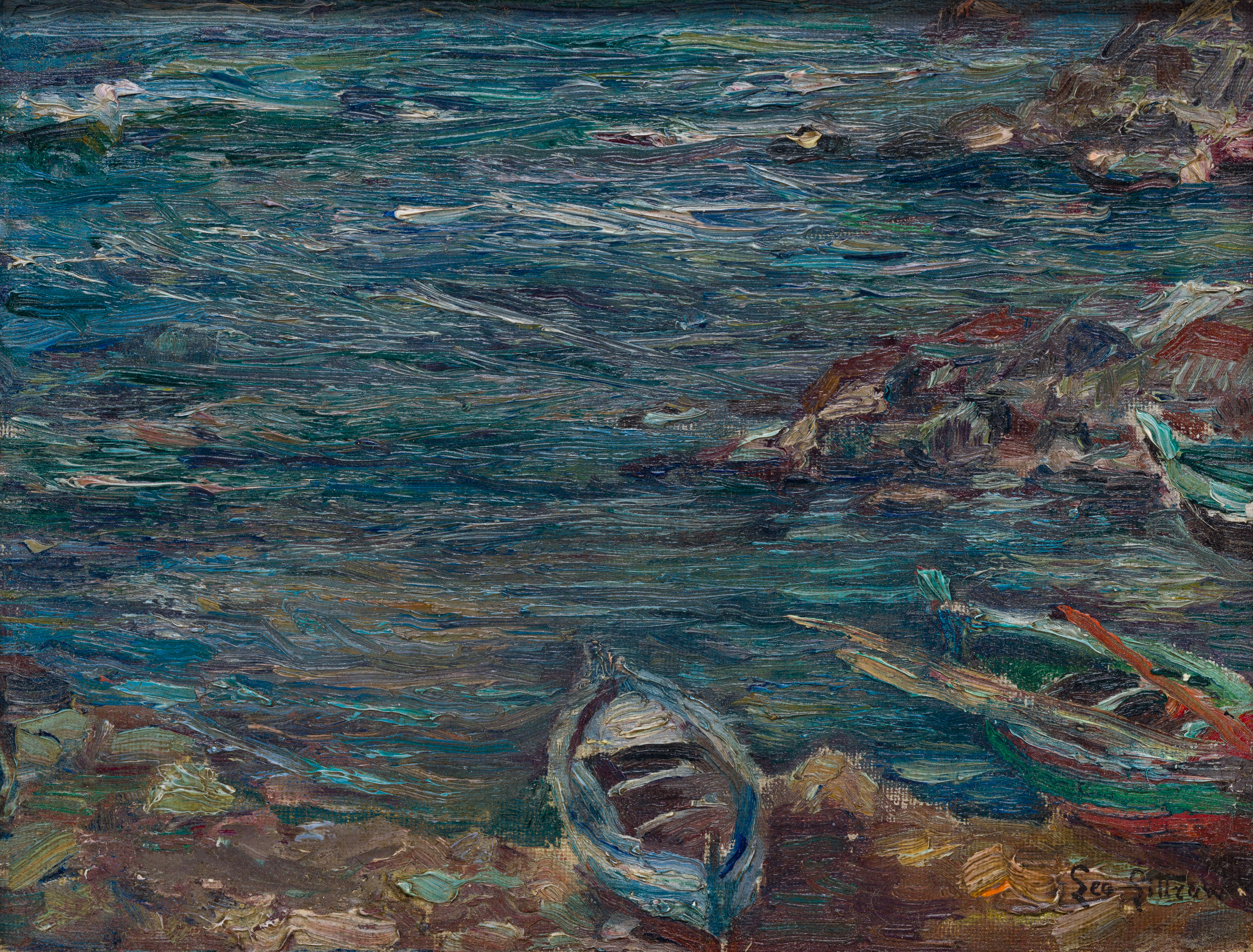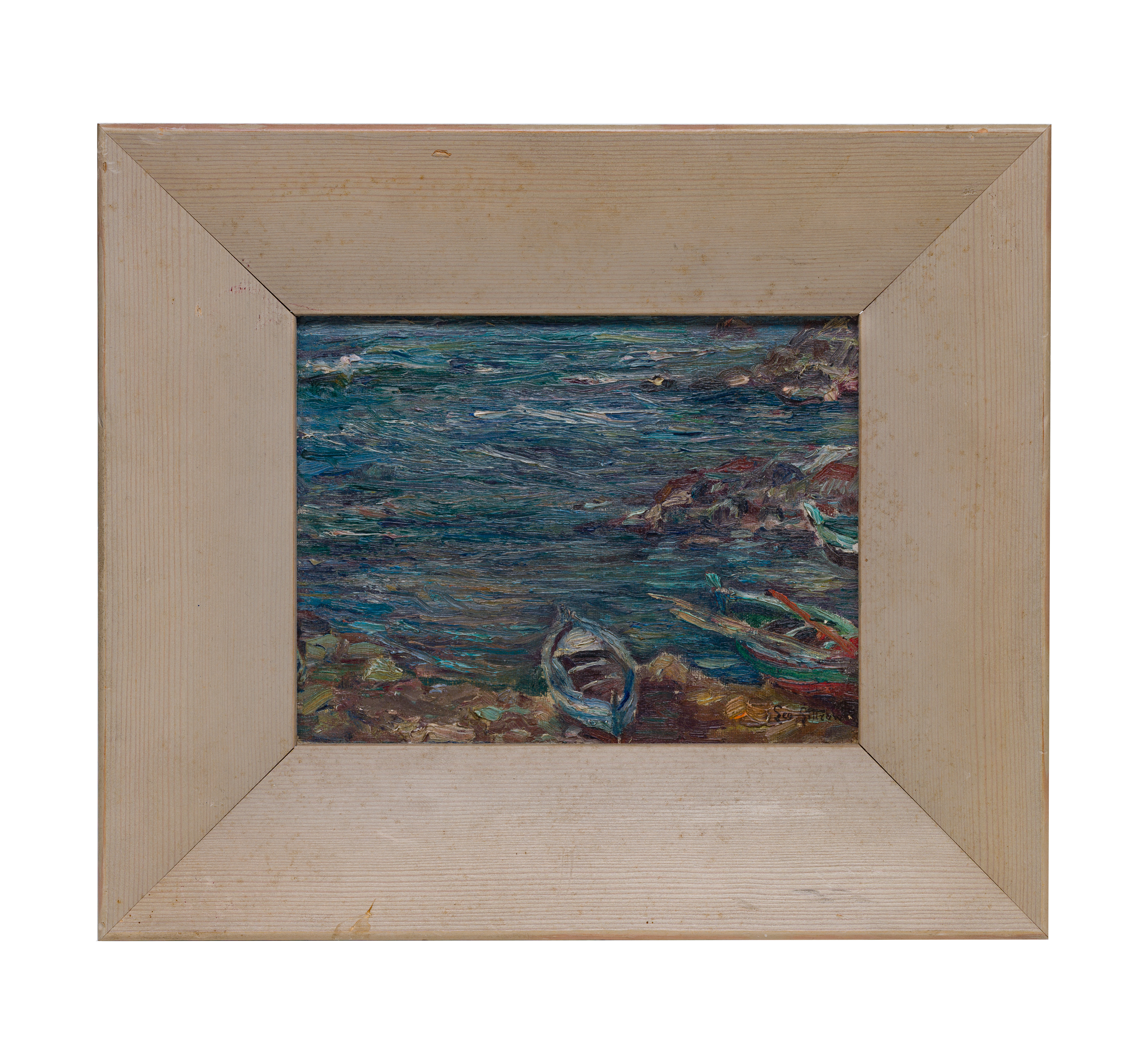 Undated, signed lower right, depicting a rocky seashore and boats, in a wood frame