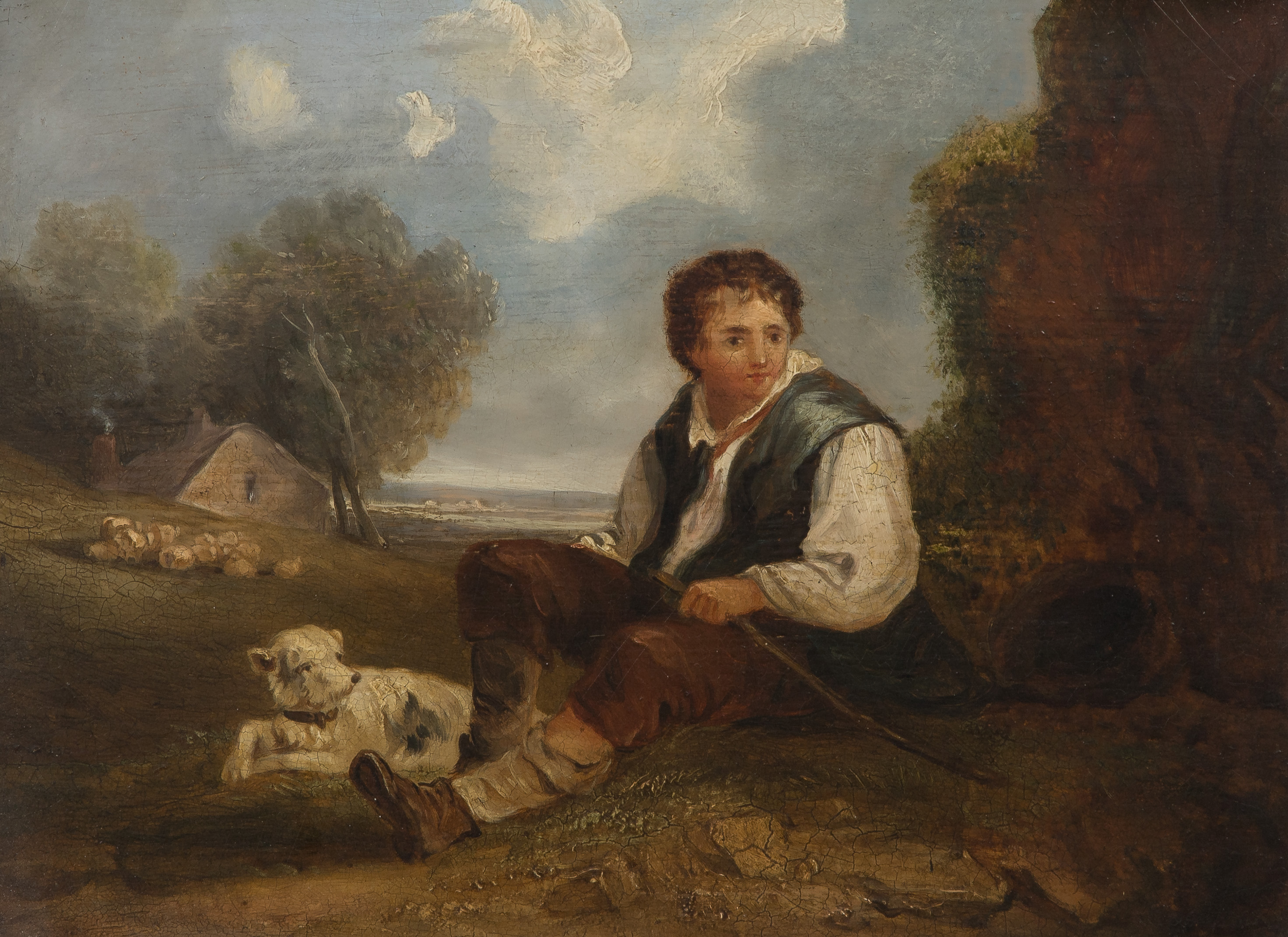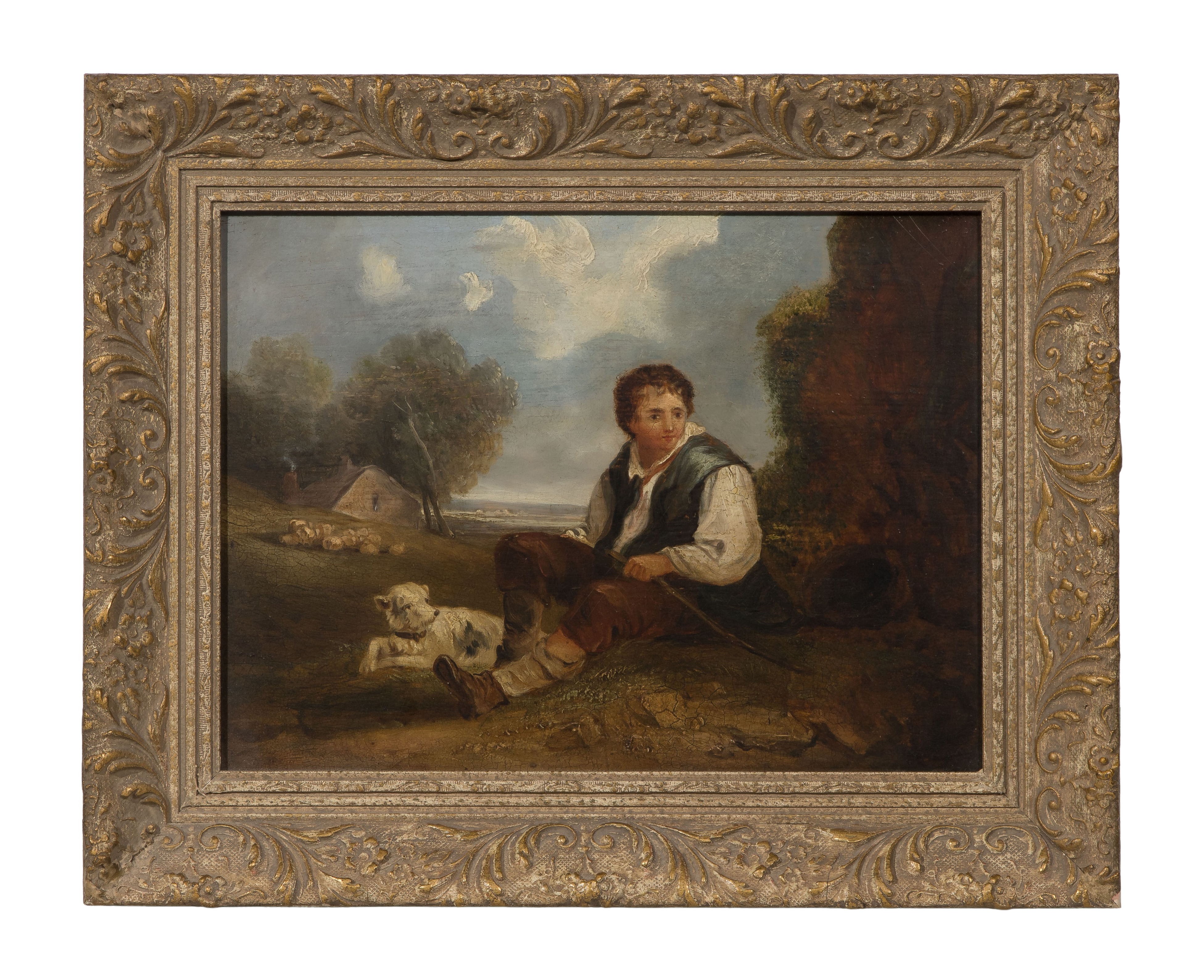Undated, illegibly signed, depicting a young boy sitting in a pastoral landscape alongside his dog, in a painted gold-tone frame