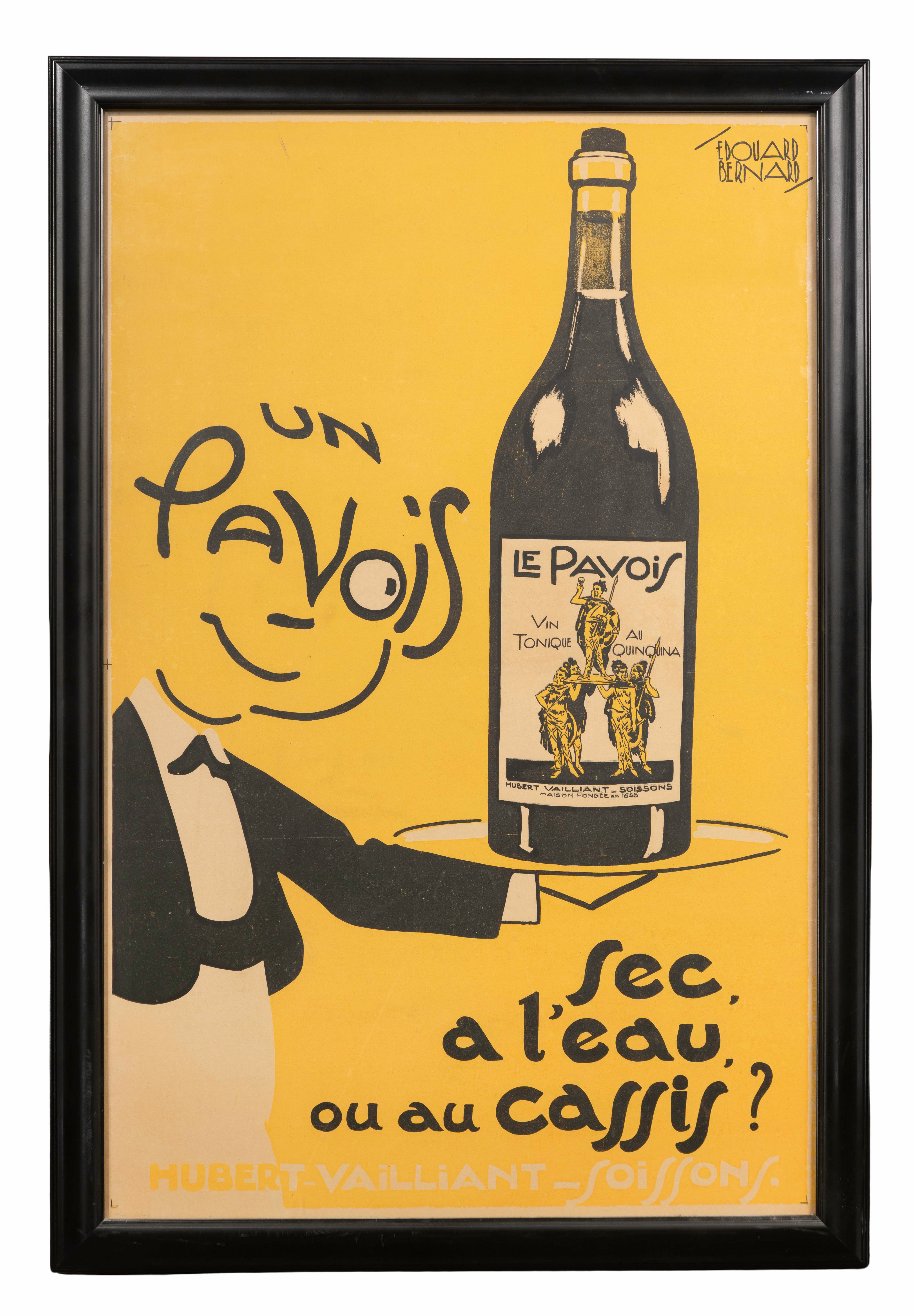 c.1934, depicting a smiling waiter holding a lage bottle on a tray his face containing the words ‘Un Pavois’ against a yellow background, mounted on linen, under acrylic in a black wood frame, including COA