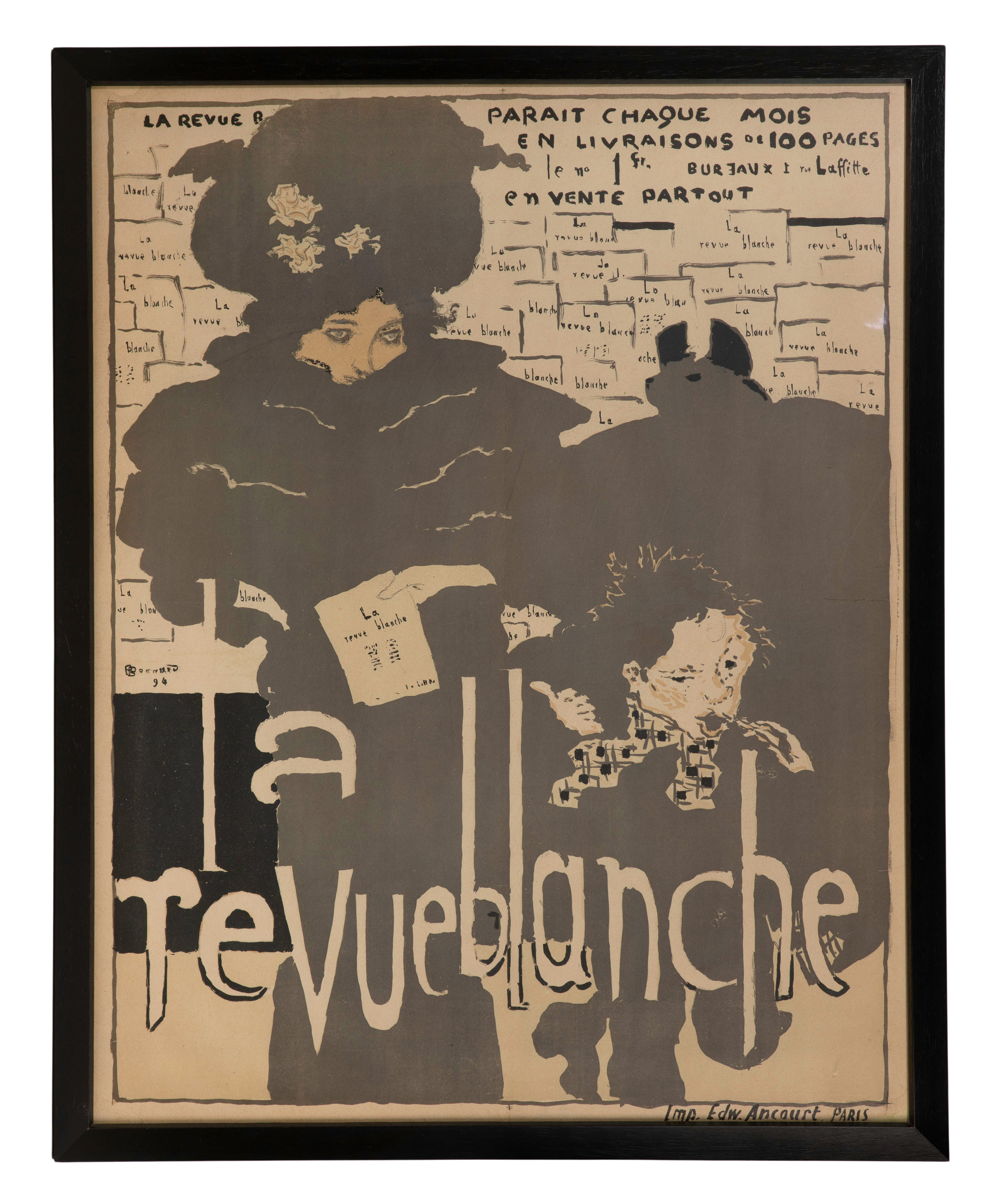 1884, an advertisement for the French art and literary magazine ‘La Revue Blanche’ depicting a woman holding the magazine and a newsboy, printed by Edward Ancourt, under glass in a black wood frame