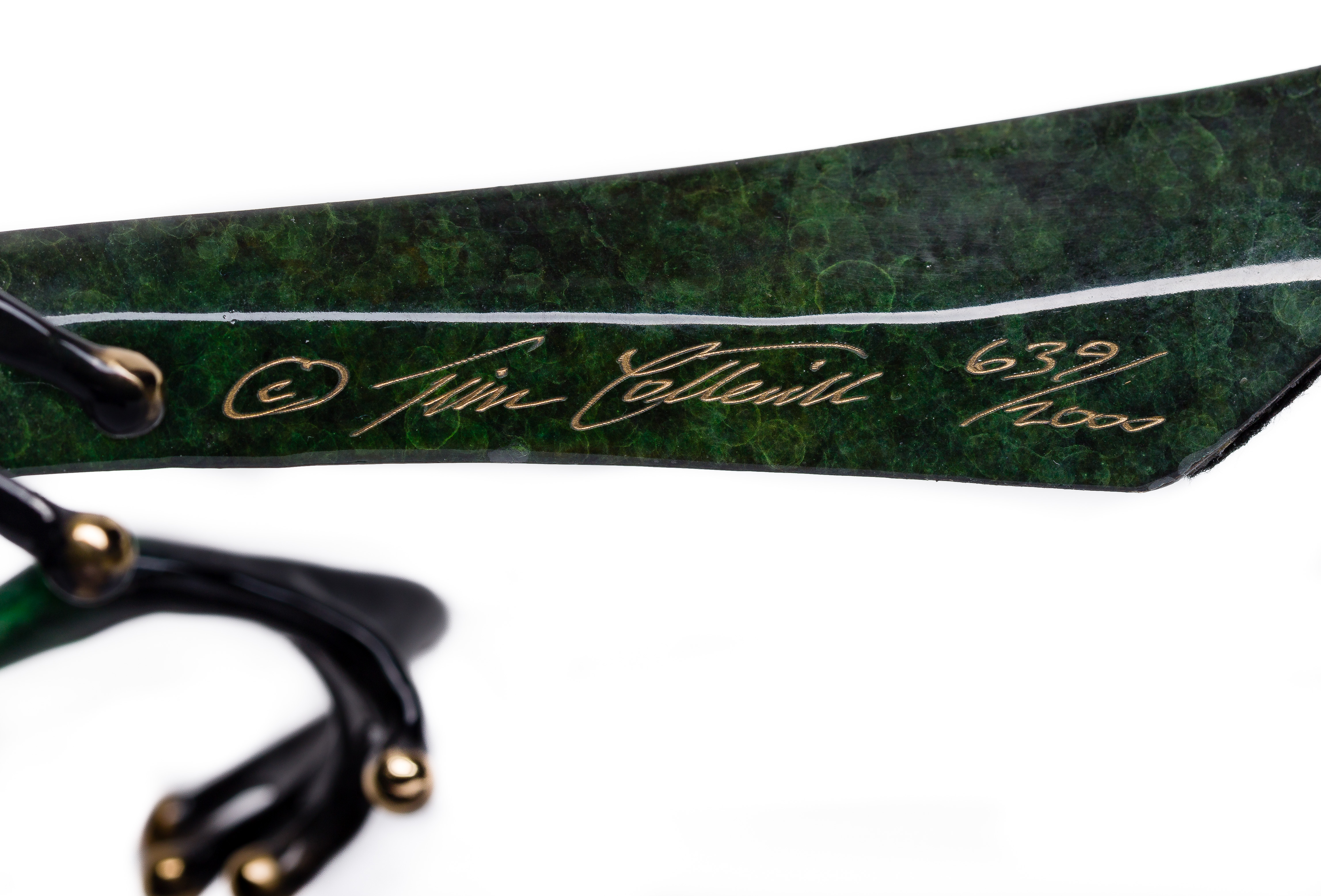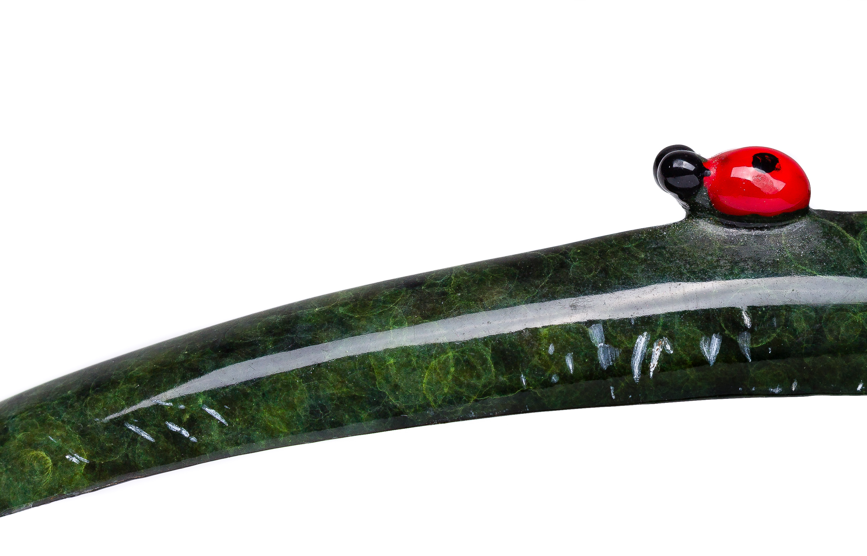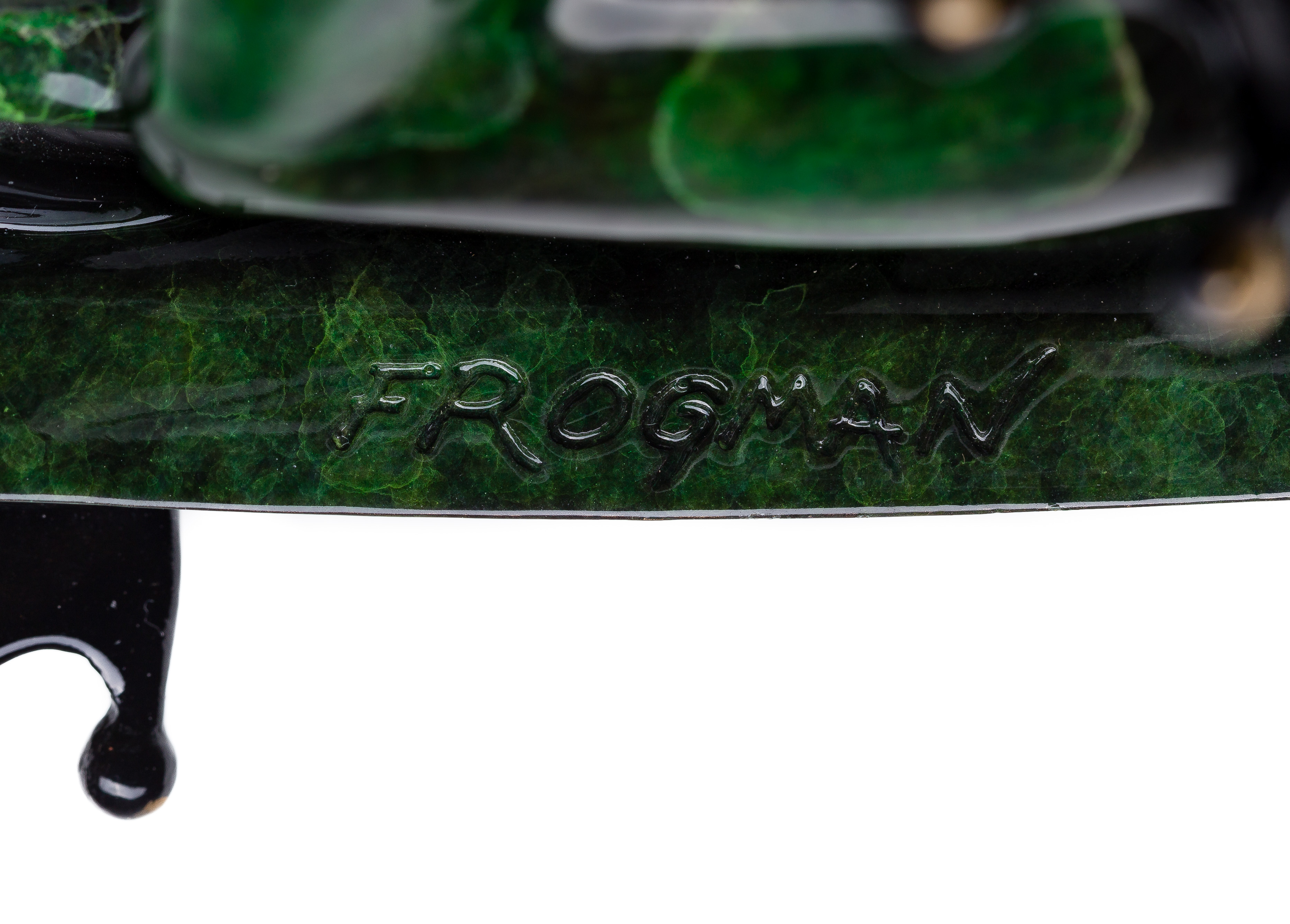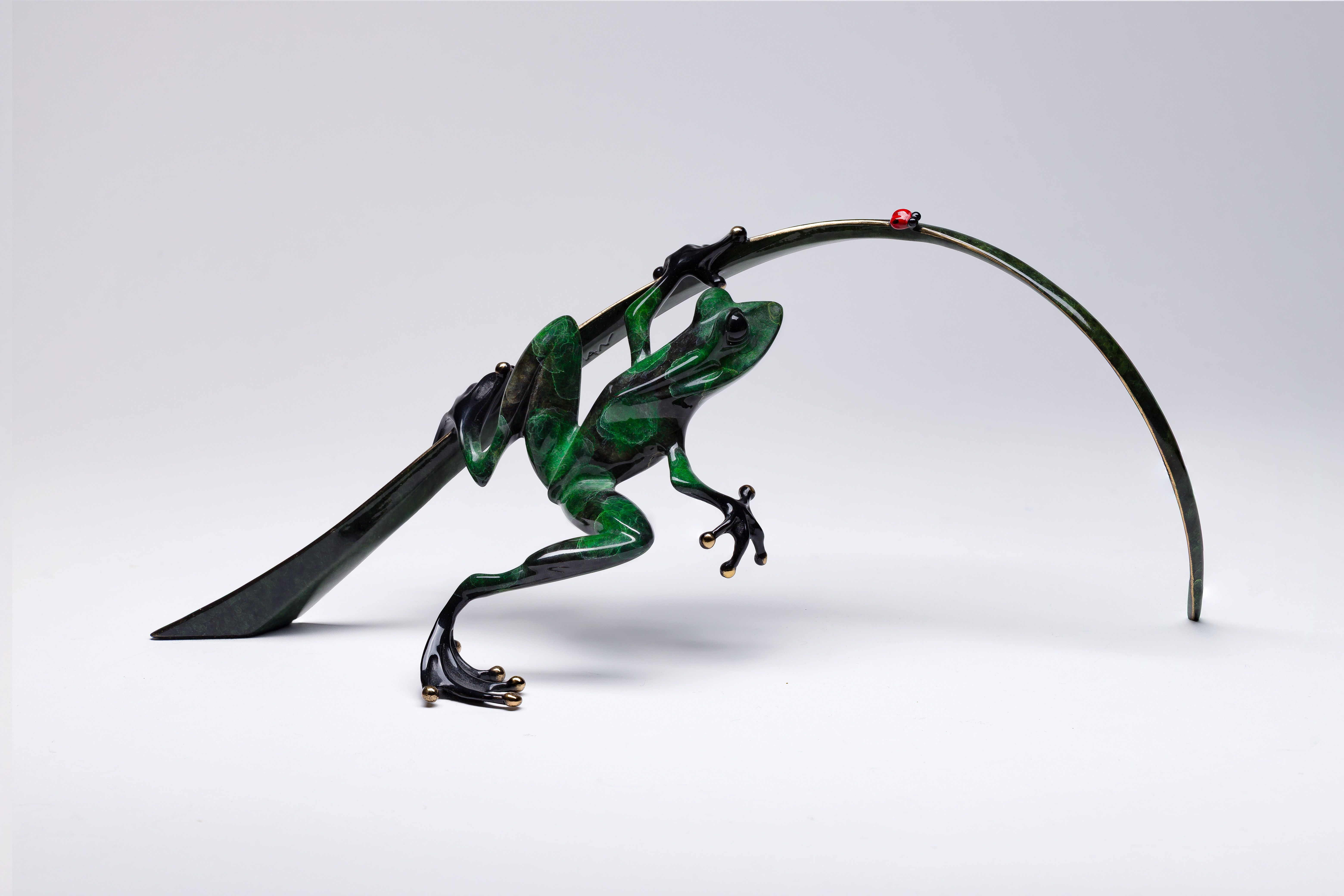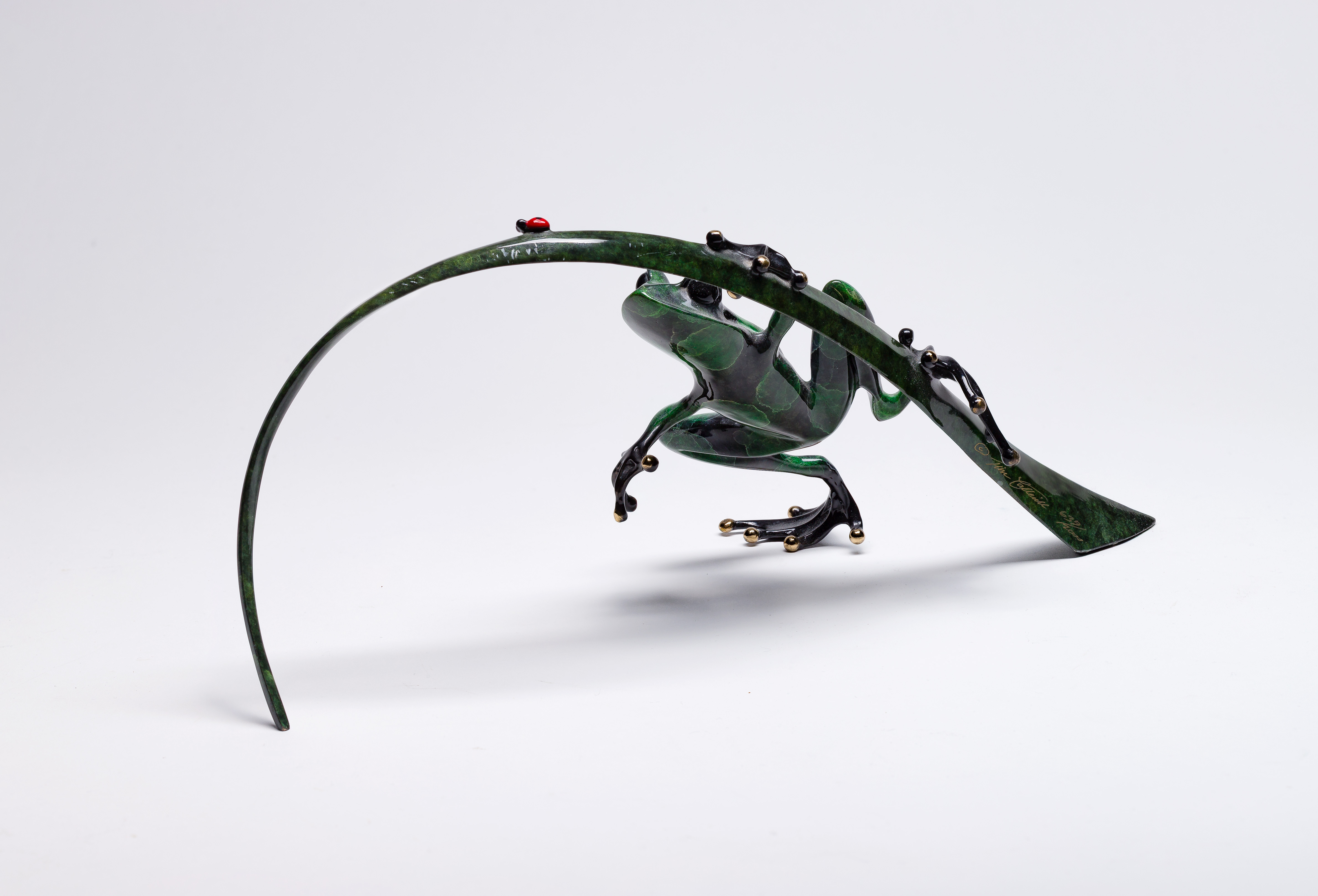1999, signed, #639/2000, depicting a green frog having gold-tone tipped toes on a green leaf, chasing a ladybug