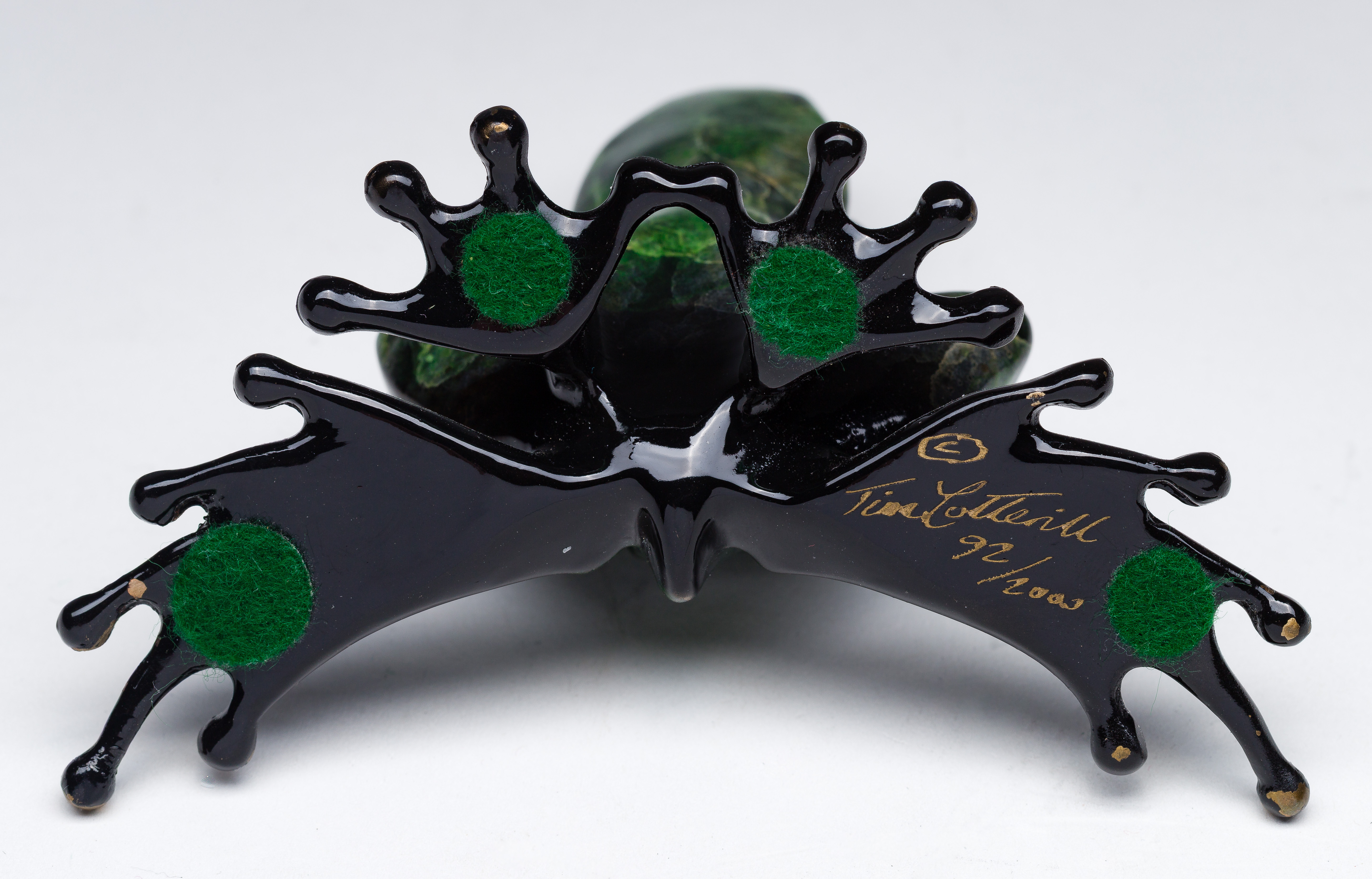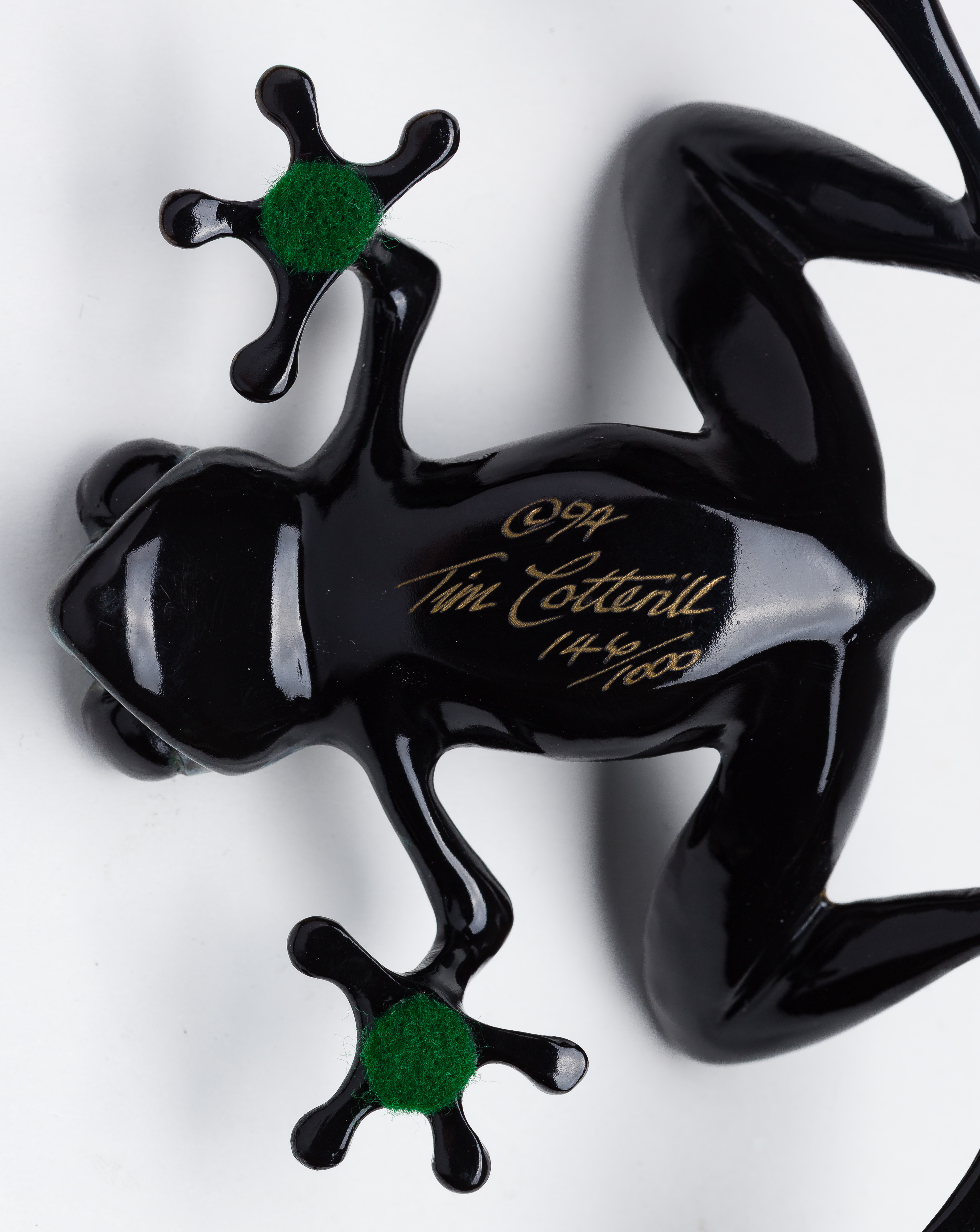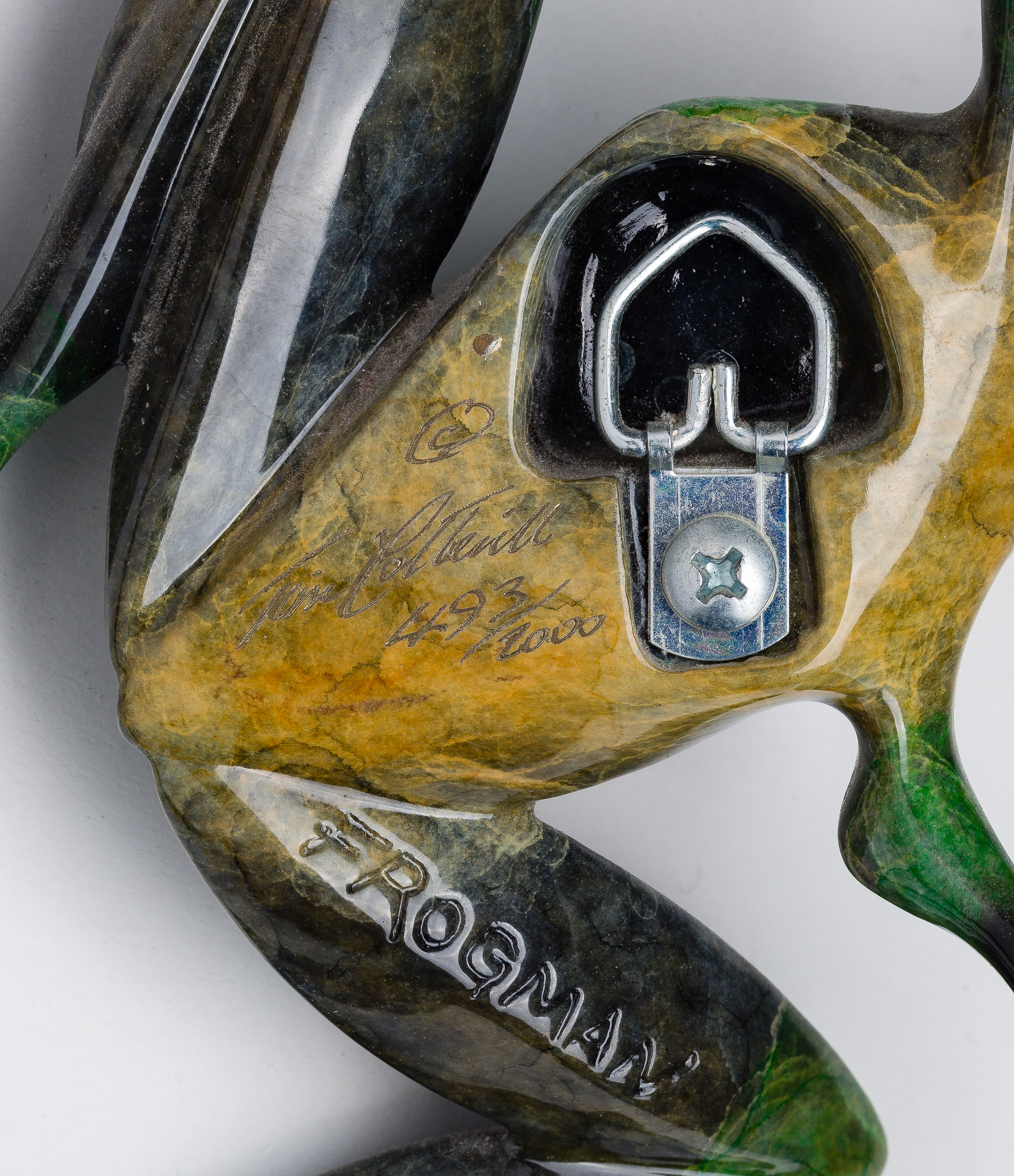 (7) enameled frogs in various sizes, poses and similar shades of green, all signed underside, some having cast ‘Frogman’ mark, the largest having a D-ring hanger for mounting