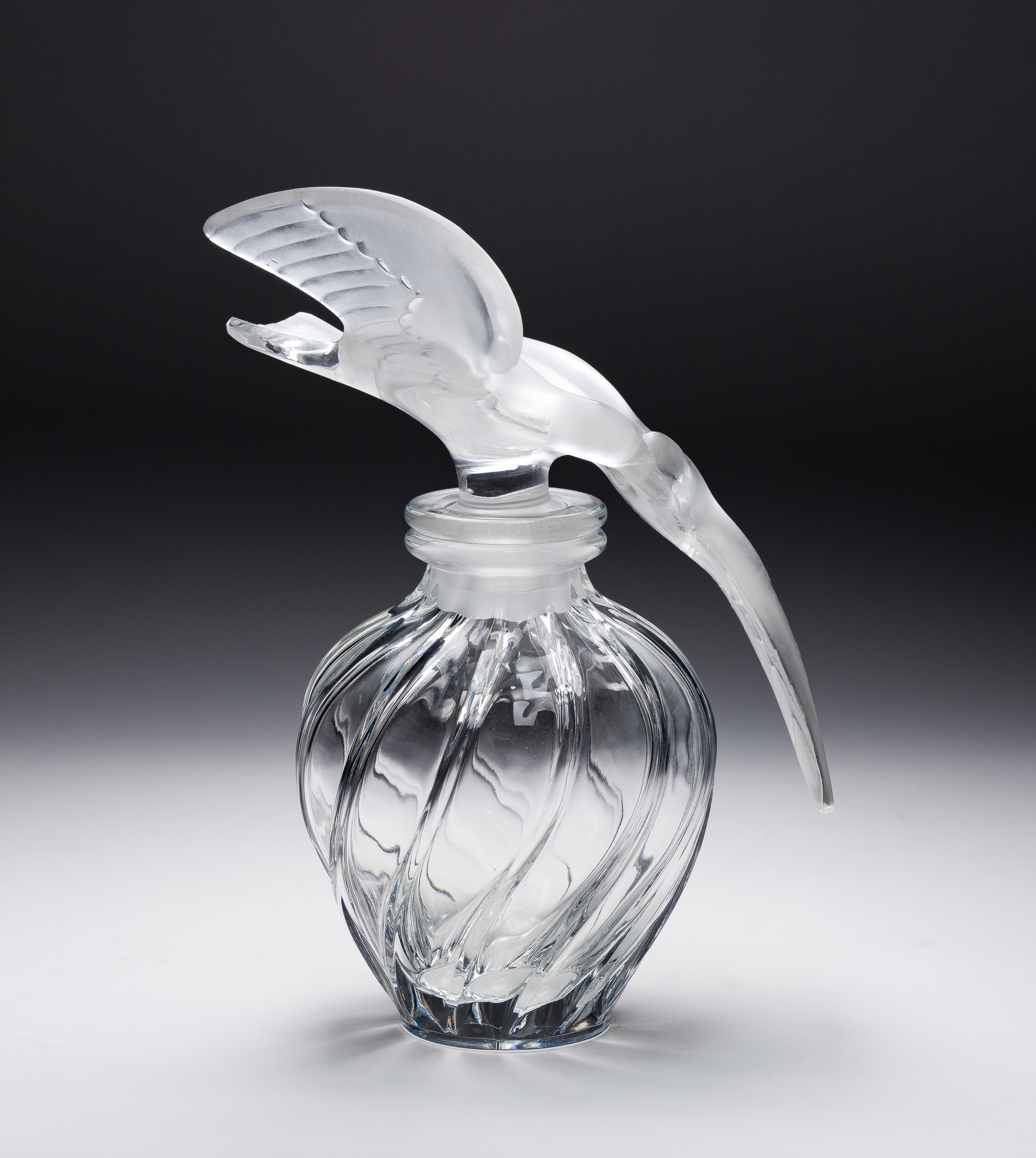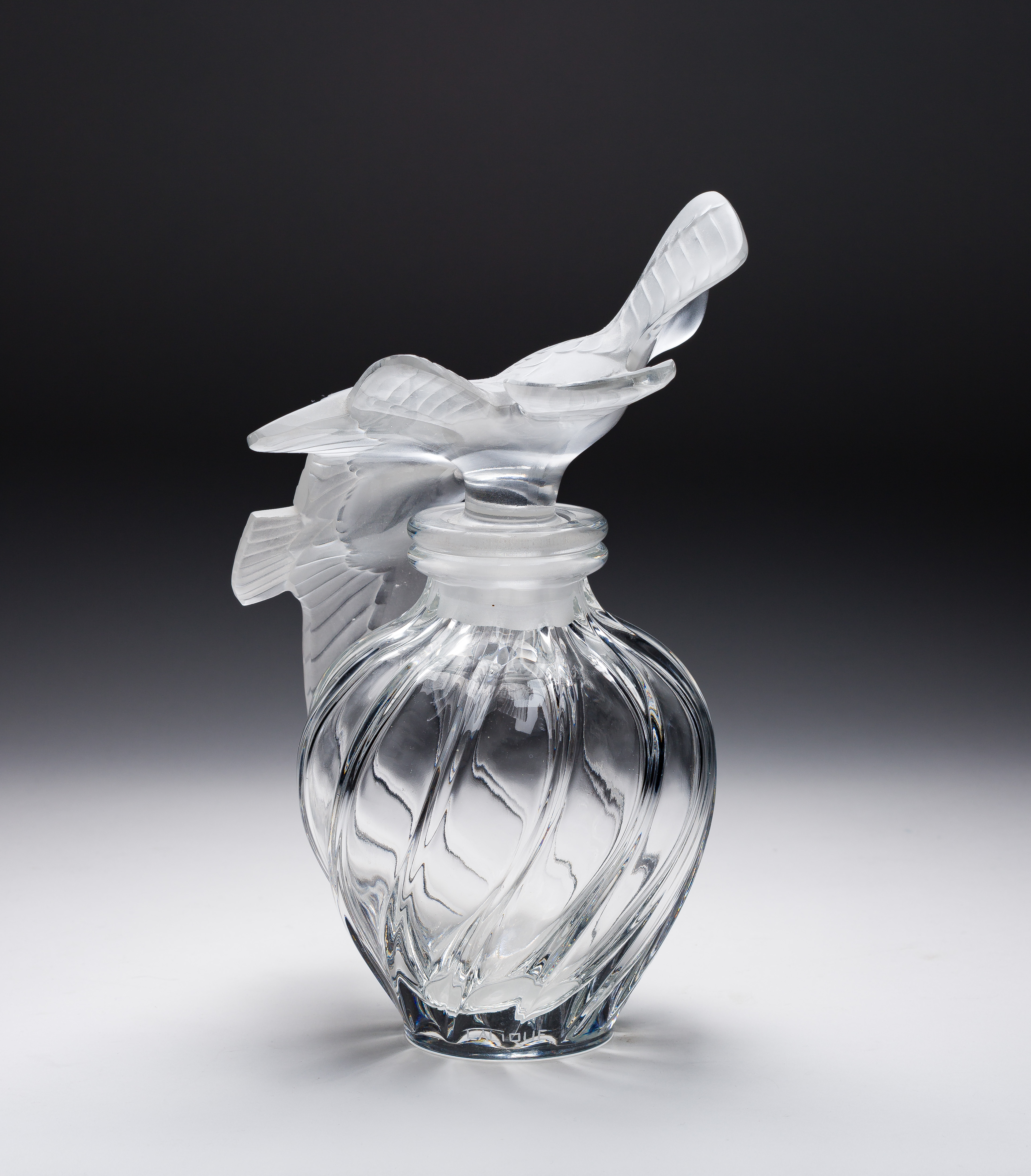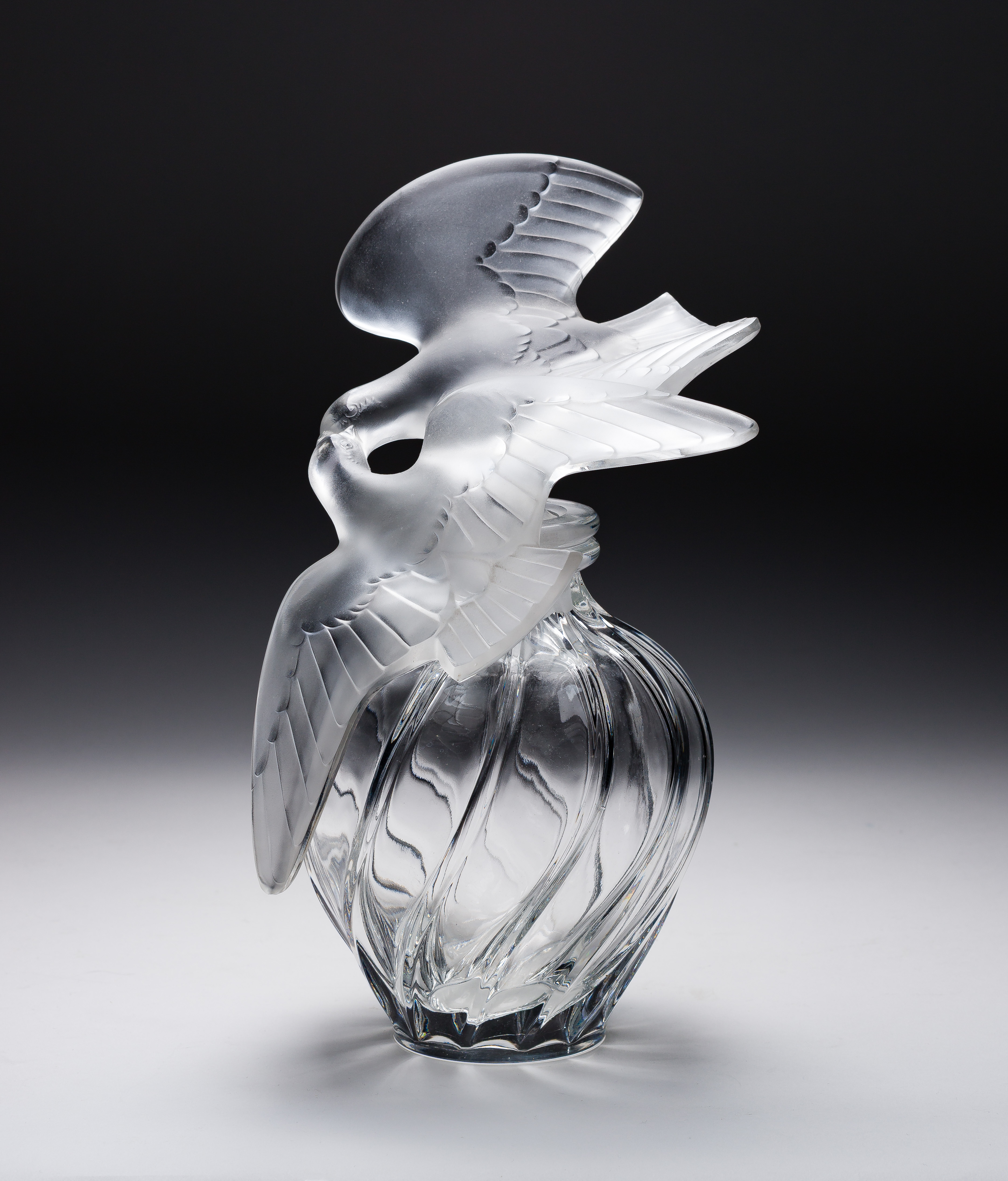 Having a dual frosted and clear conjoined doves stopper with twisted clear crystal body, marked on lower rim of bottle