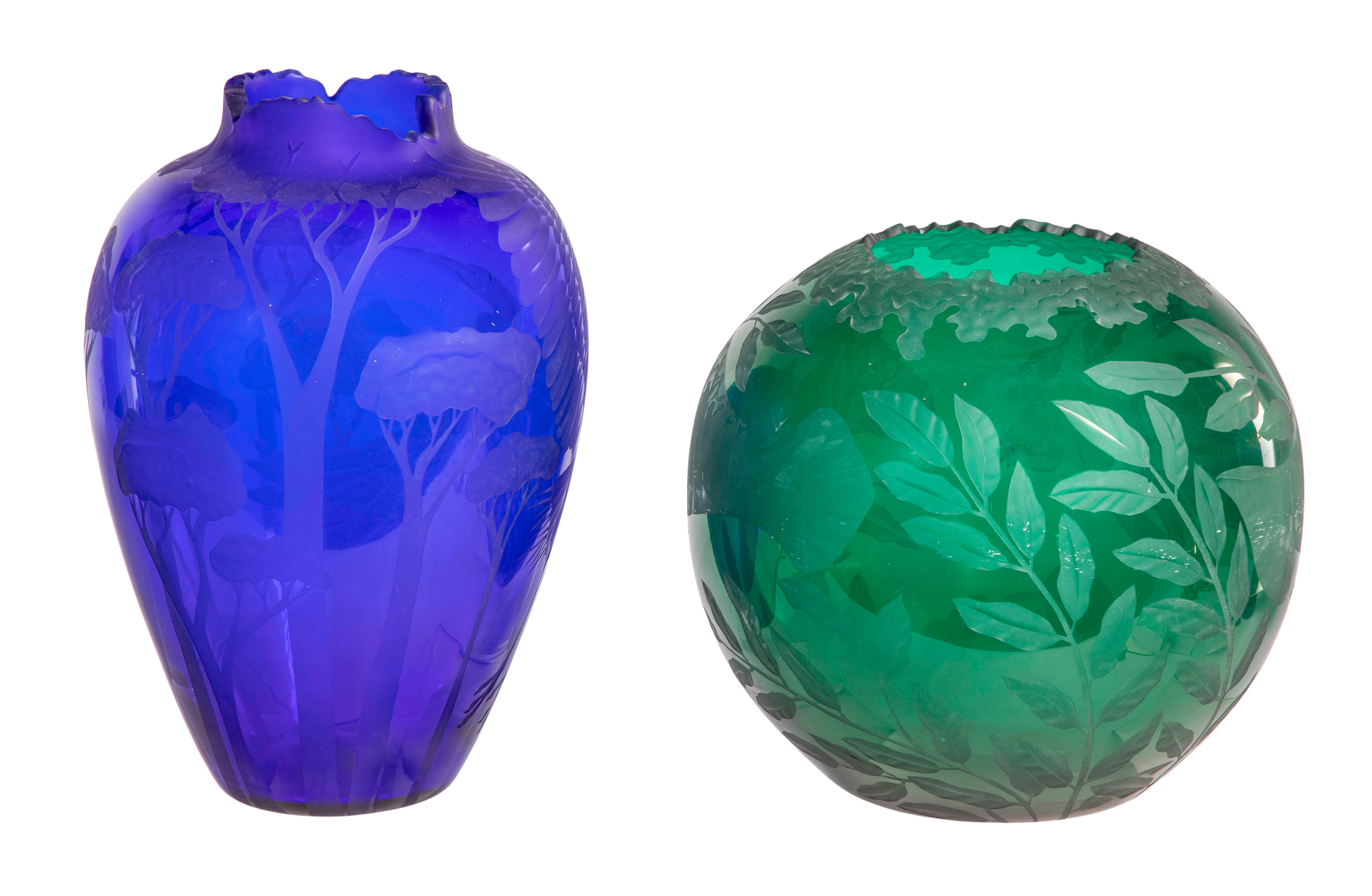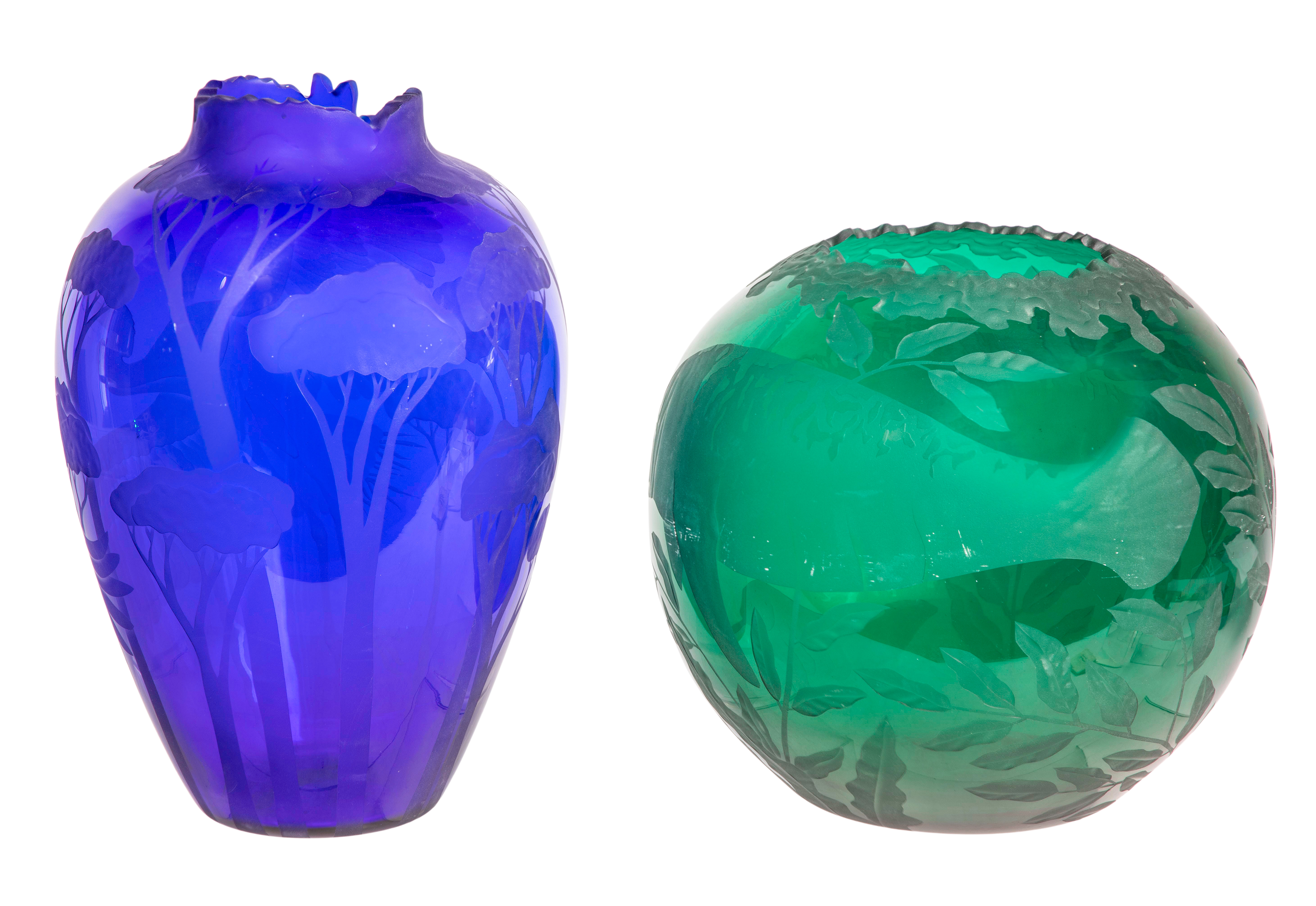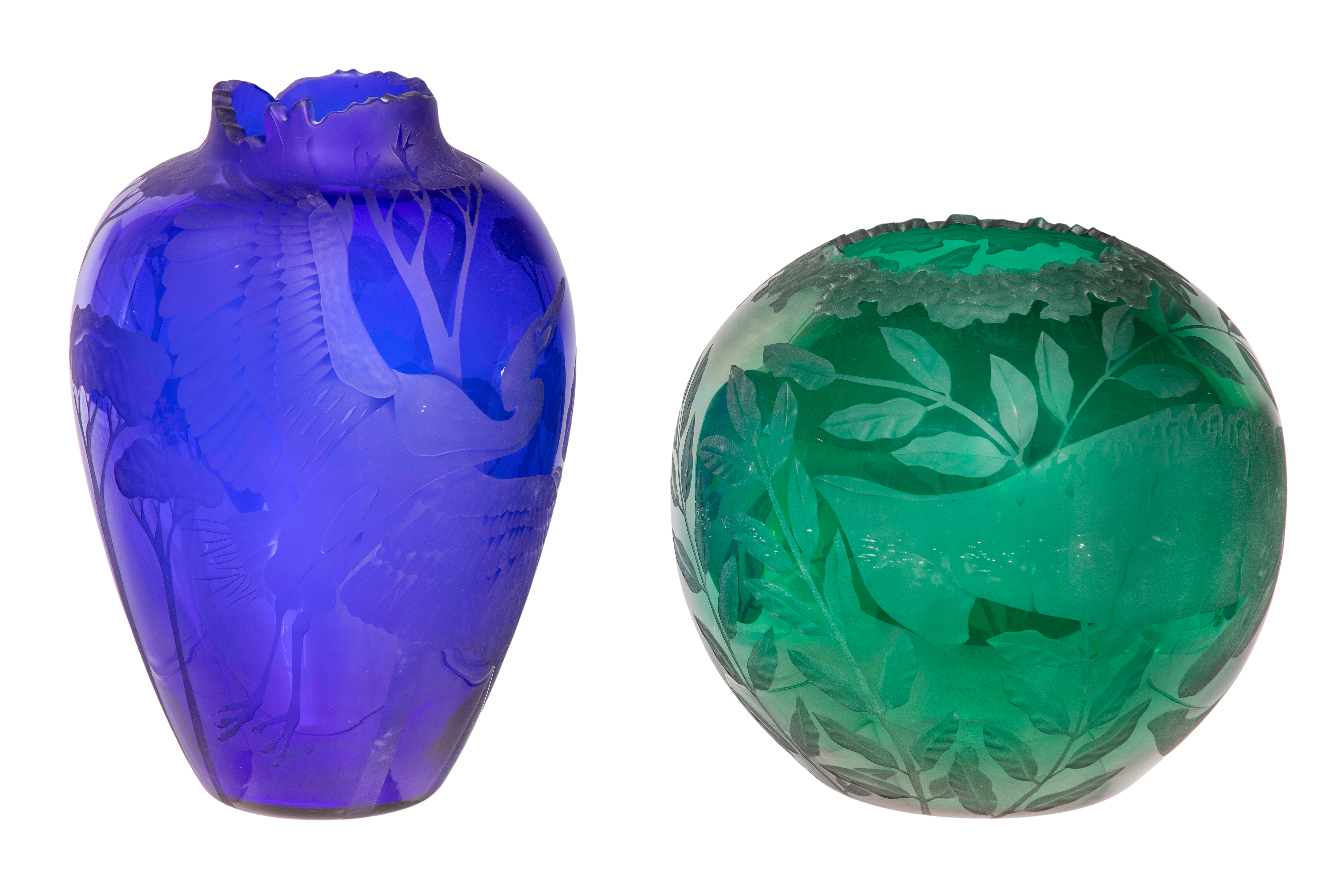 (2) items having engraved signatures underside, sandblasted decoration and shaped rims including a green having manatees amid seaweed dated ’99’ and a cobalt blue having a crane in a forest dated ’01’