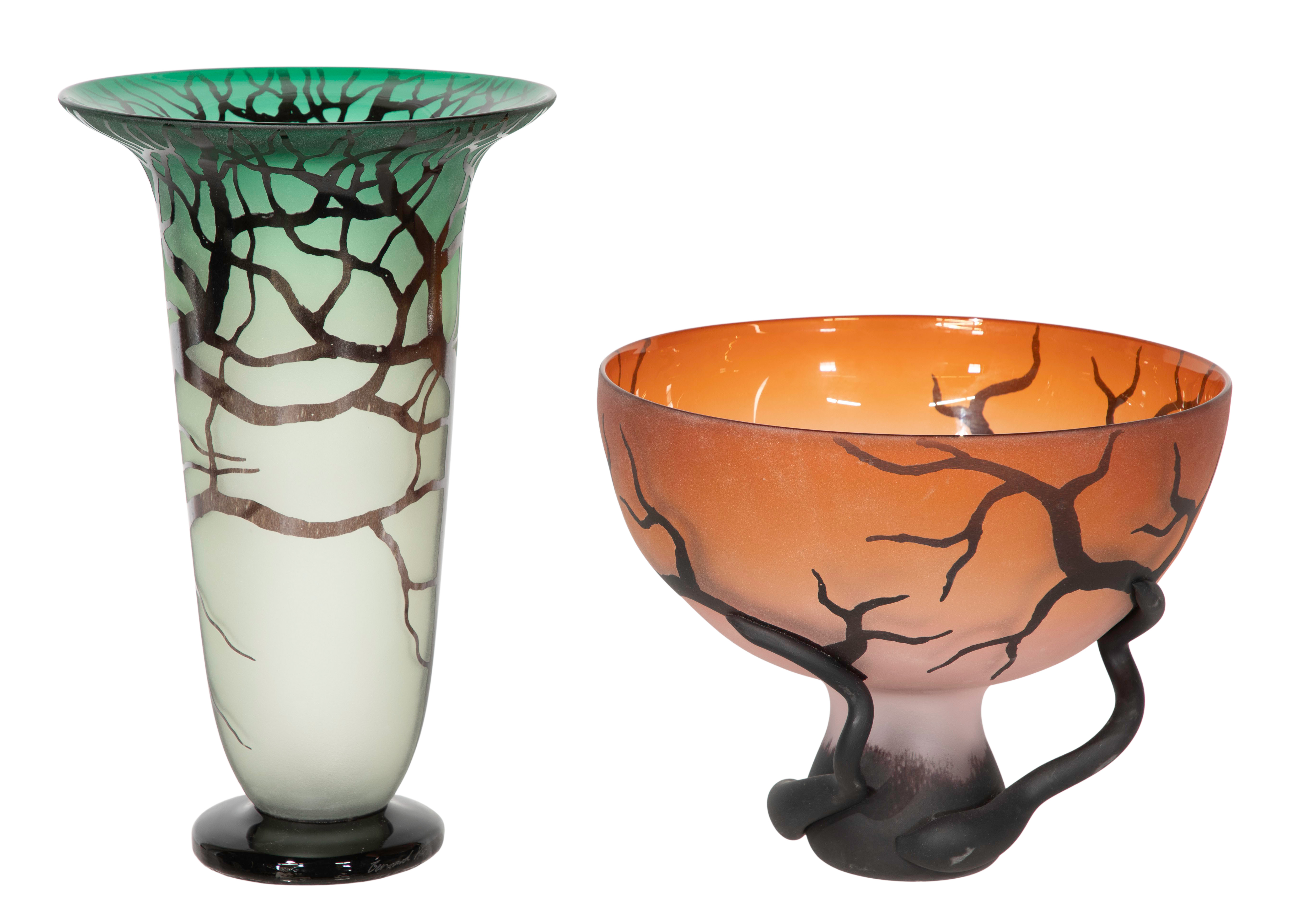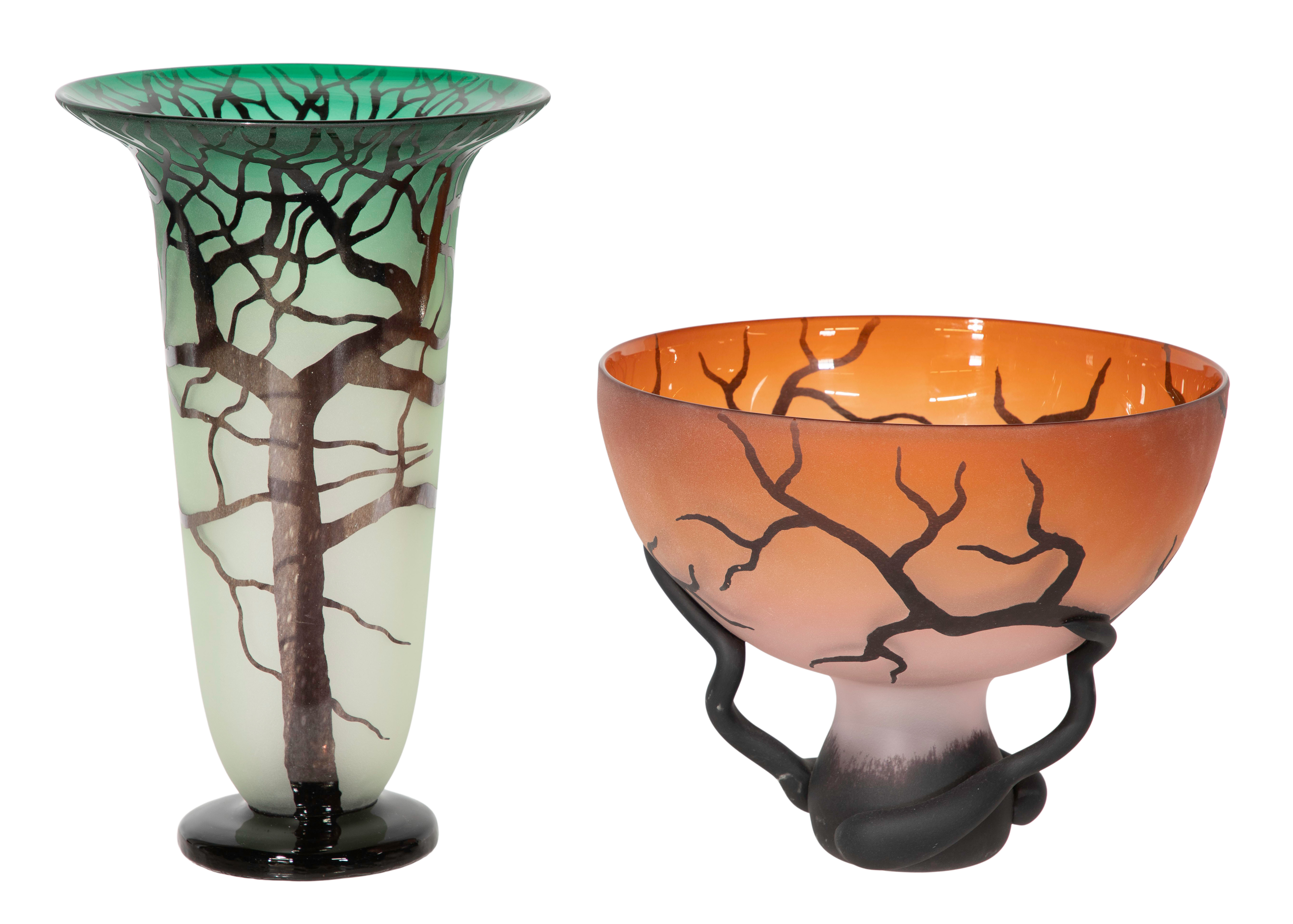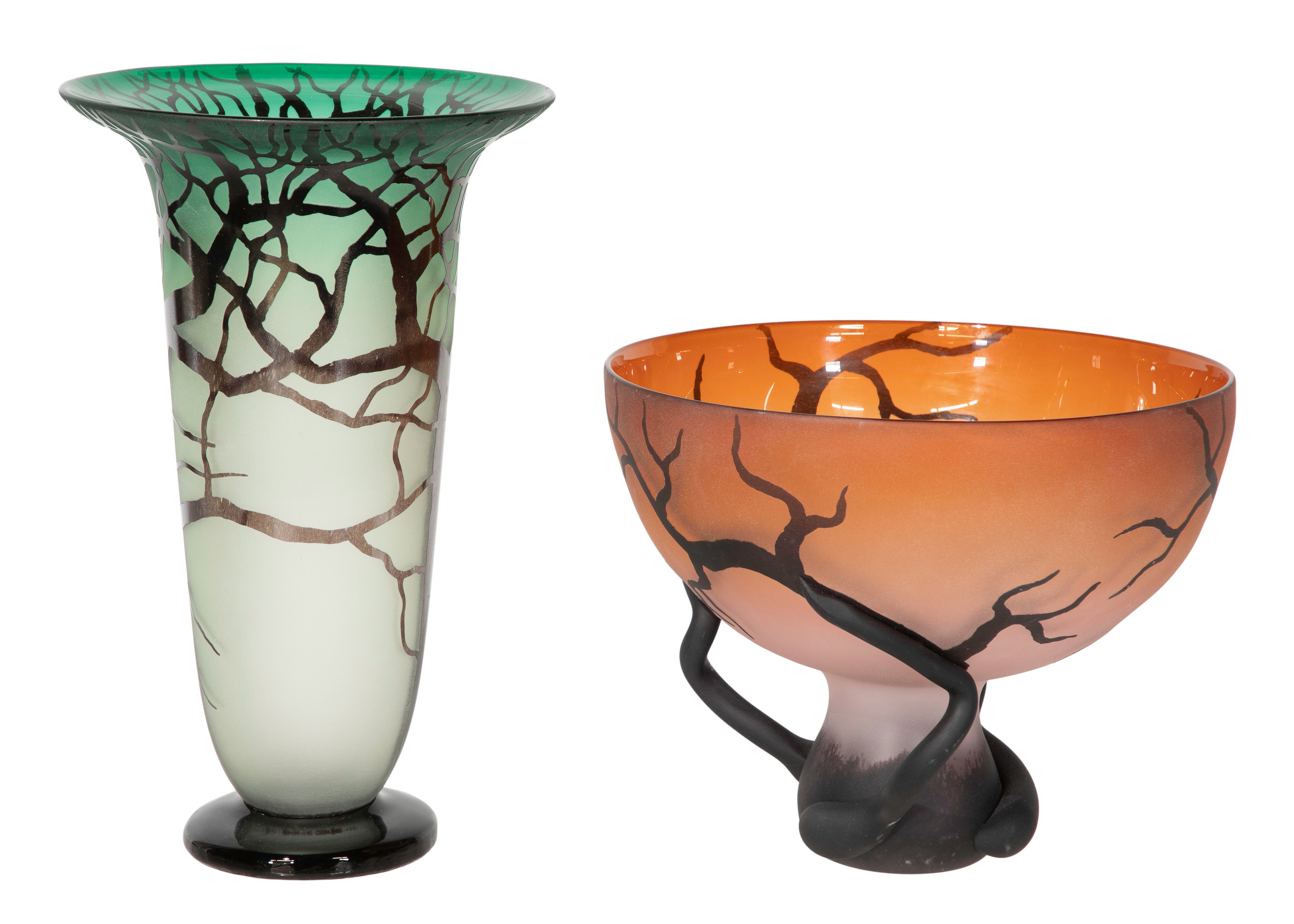 (2) items from the ‘Tree and Root Series’ having a dark cased outer layer sandblasted / etched to reveal the inner color, including a ‘Chalice Root’ bowl having applied dimensional roots signed on foot ring and an attributed vase lacking a signature