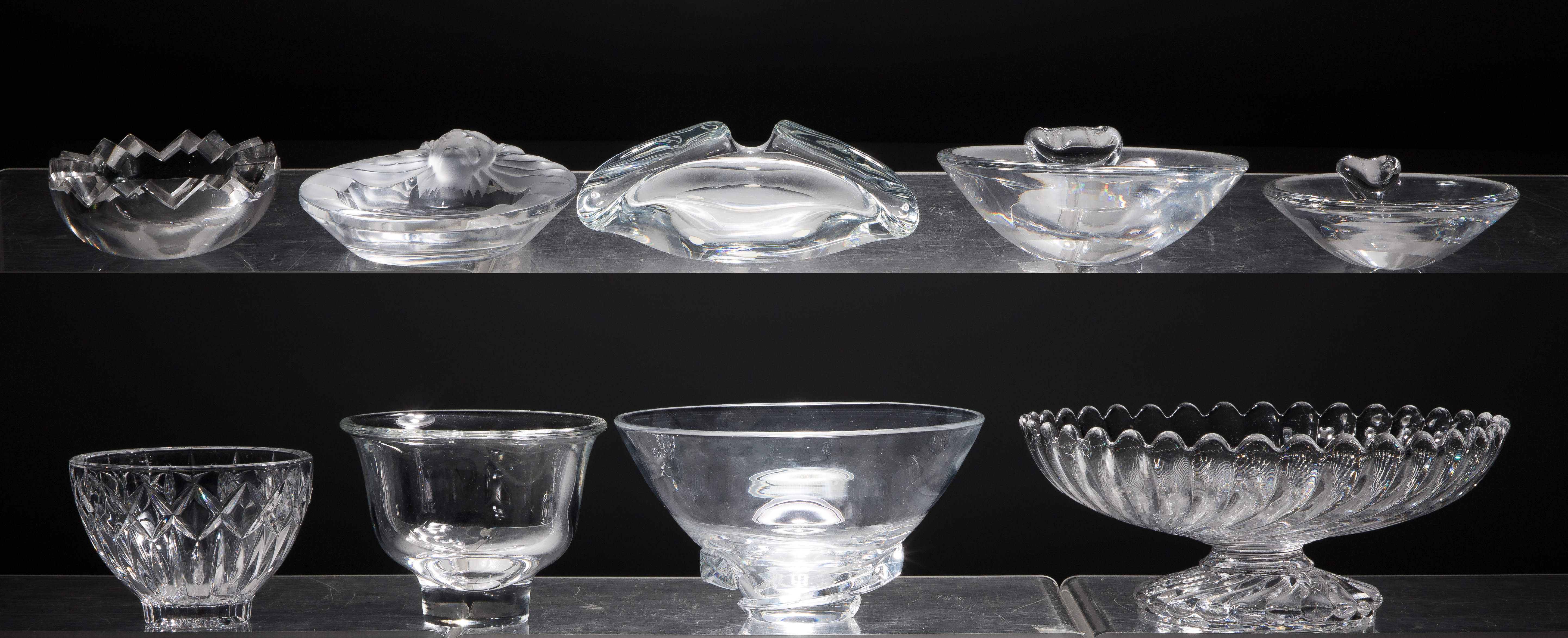 (9) items including a Lalique Tete de Lion ashtray, a Baccarat ashtray and footed bowl, a Steuben ashtray and (5) various sized bowls, a Waterford bowl maintaining its original label and a Rosenthal ashtray, all marked