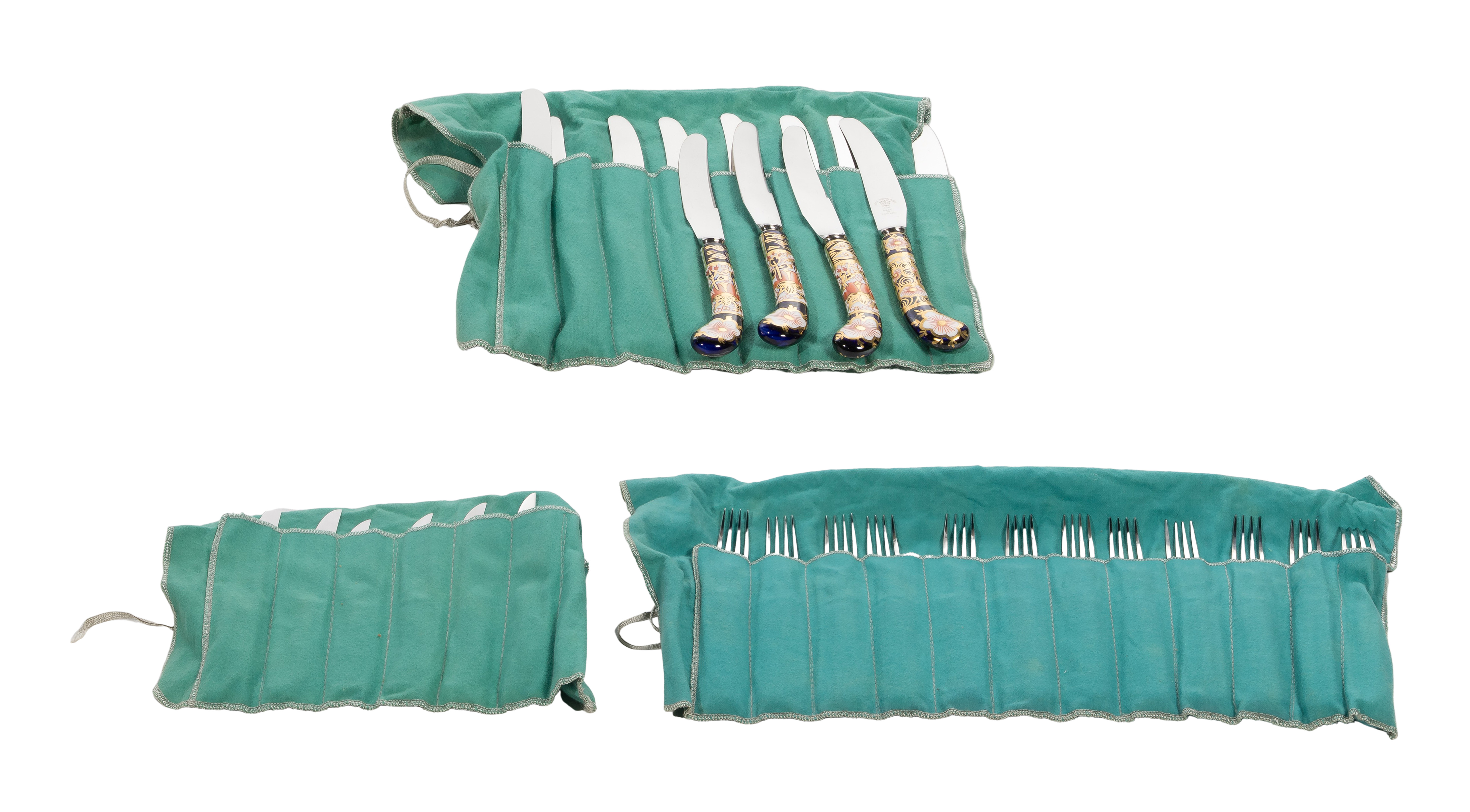 Including (12) pistol grip 8.75-inch dinner knives, (12) 7.625-inch dinner forks, (6) fruit knives, (6) fruit forks, a bottle opener, (6) tumblers, (2) rocks glasses as well as a teapot, sugar, creamer, bowl, trinket box, mug, (2) cigarette lighters and nut / candy dishes, all marked on underside