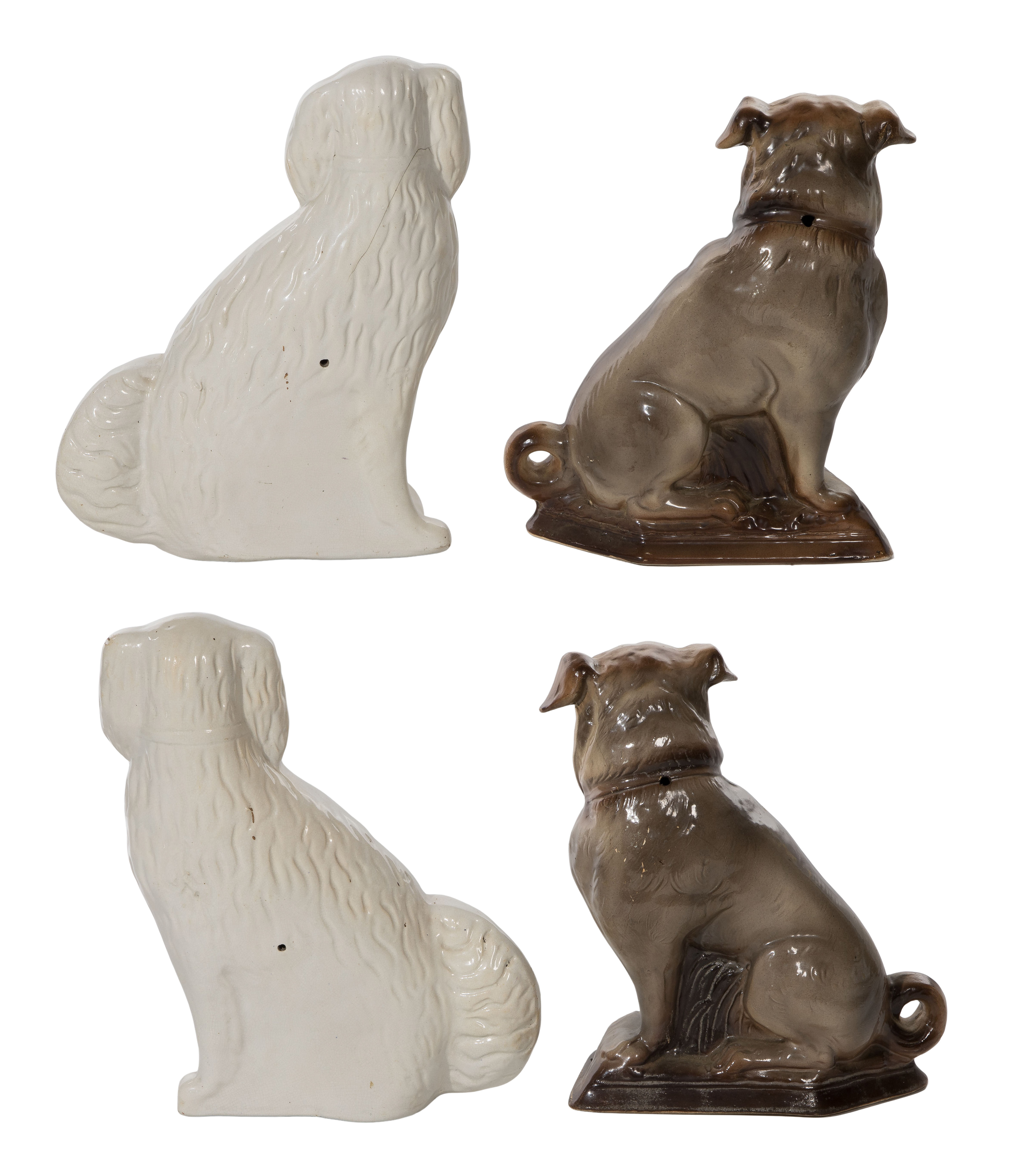 (4) items including a pair of spaniels and a pair of pugs, both mantle size, pugs having marks on underside