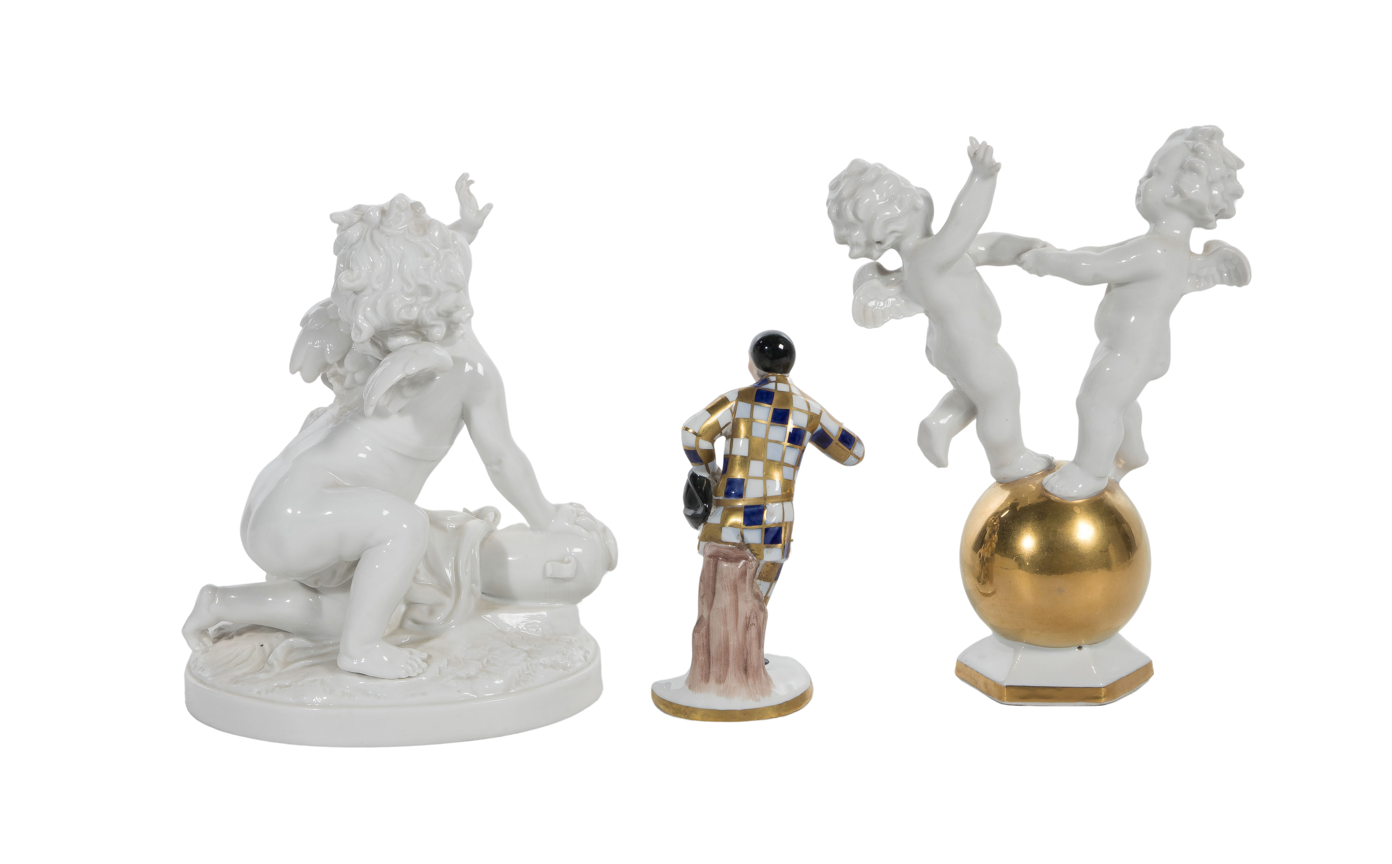 (3) items including a Porzellanfabrik Carl Scheidig depiction of two putti dancing on a gilt globe, marked underside, a marked Capodimonte harlequin-like figure, and an unmarked putto kneeling by a basket of fruit and leaning on a jug