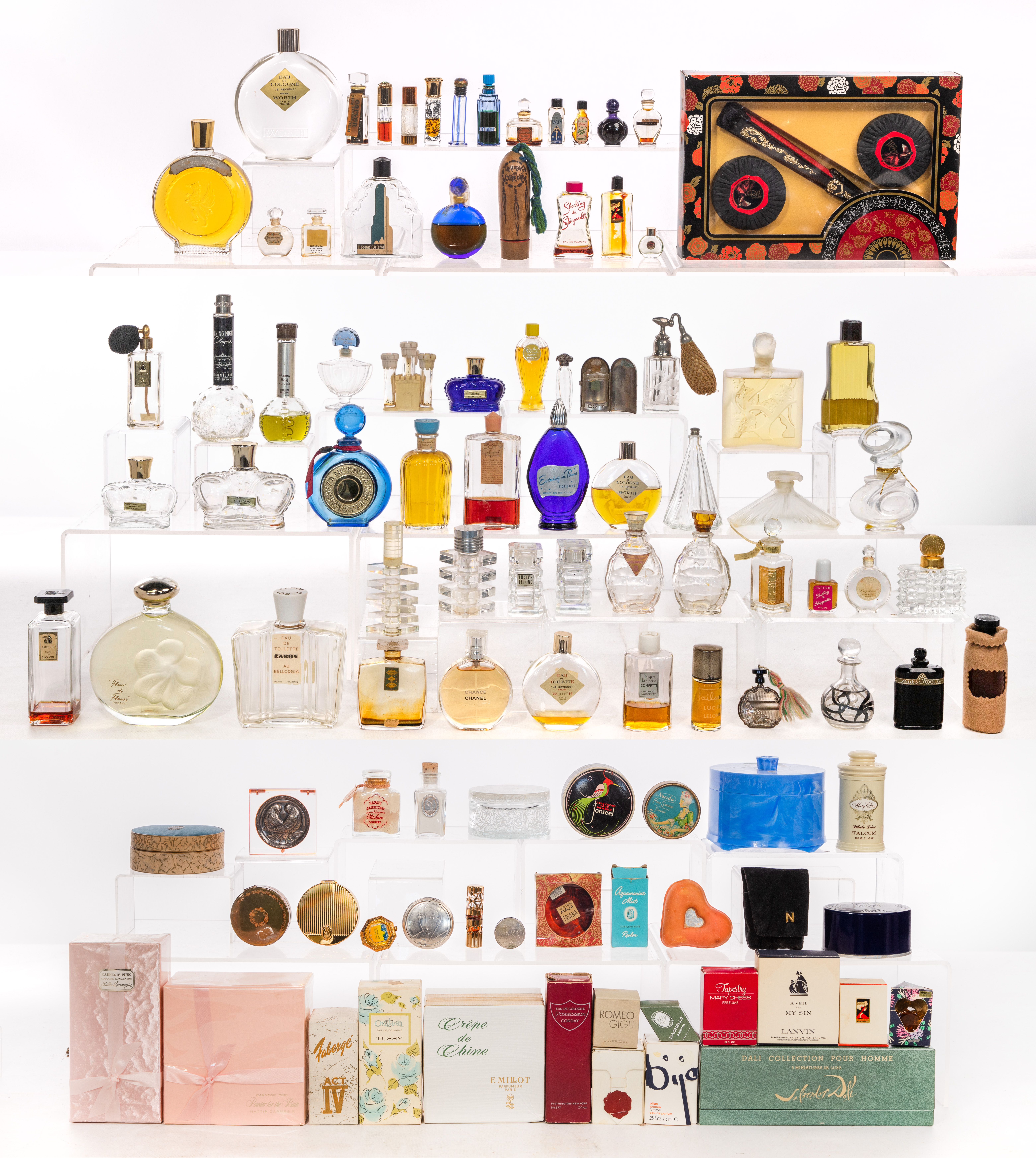 Approximately (75) items of various shapes, contents, scents, designs, makers including Schiaparelli, Chanel, Nina Ricci, Lucien LeLan, Salvador Dali, Hattie Carnegie, some retaining liquid, some having original boxes, some appearing unopened