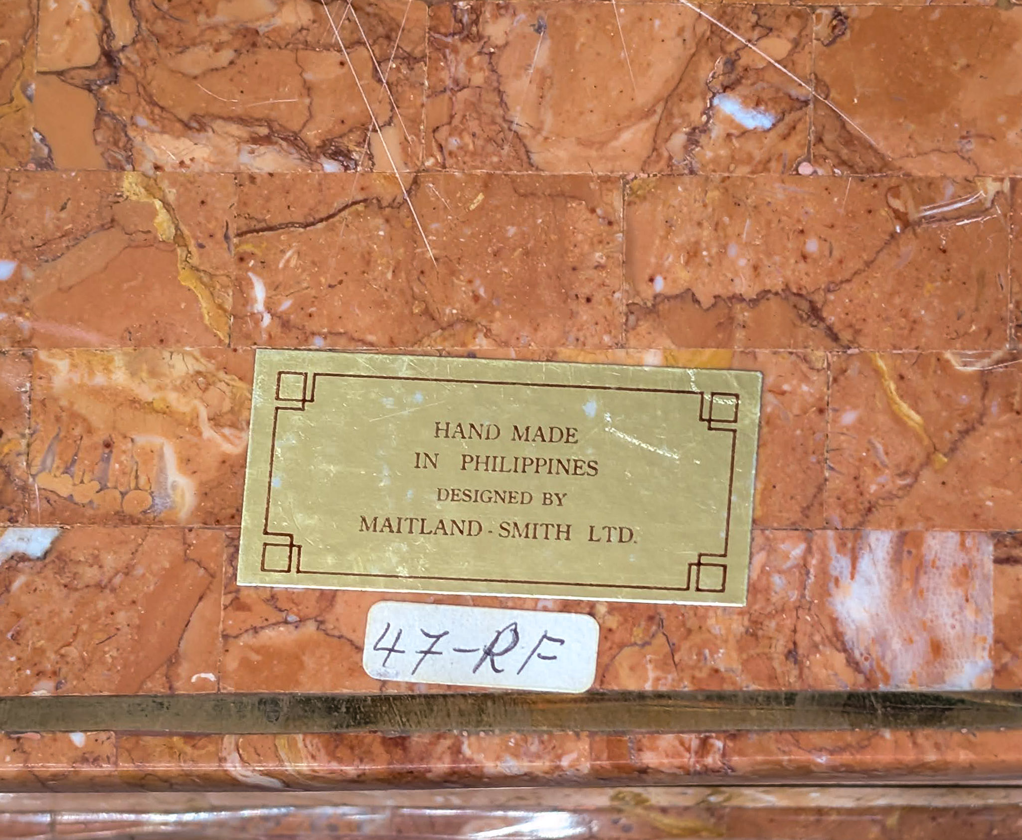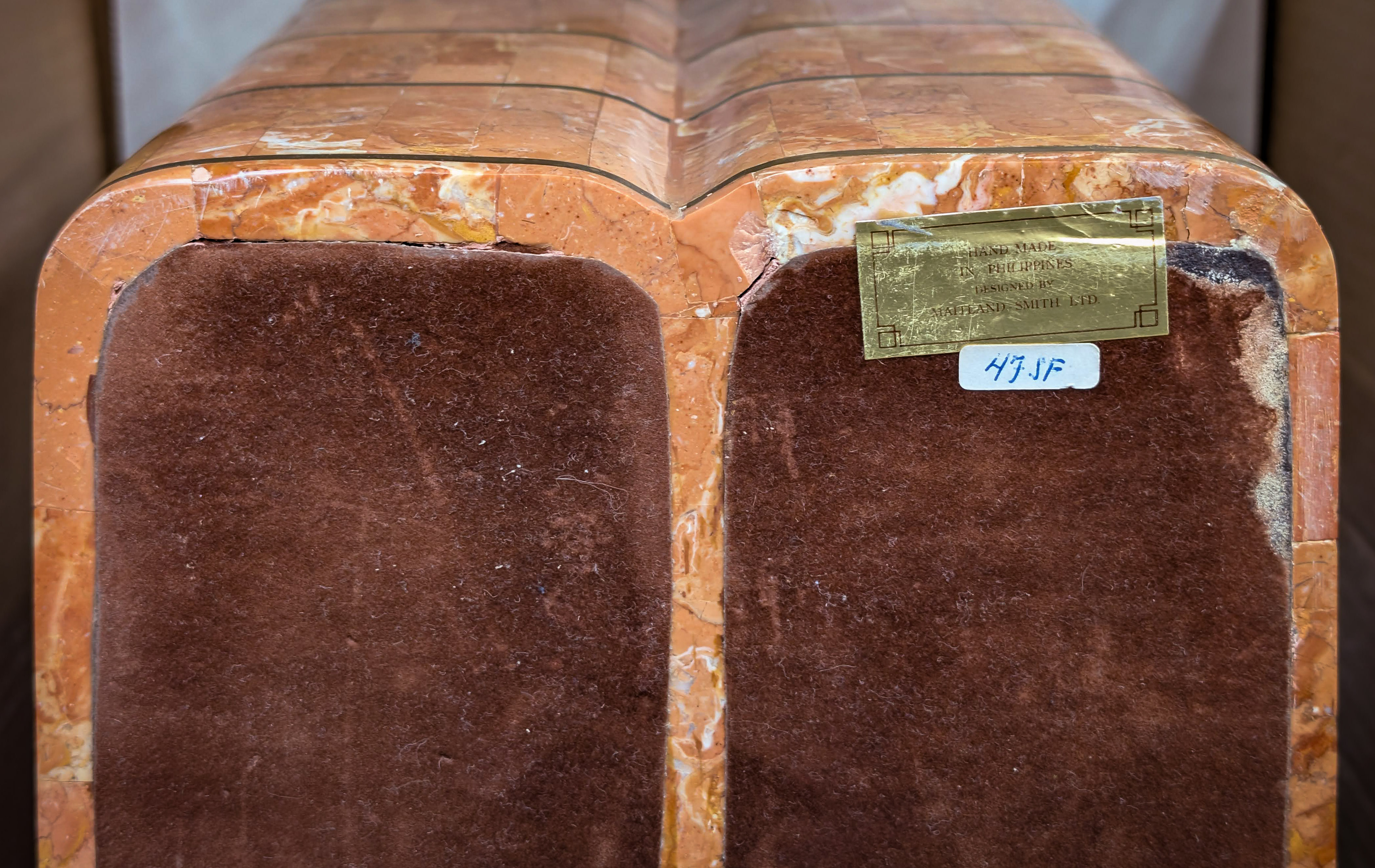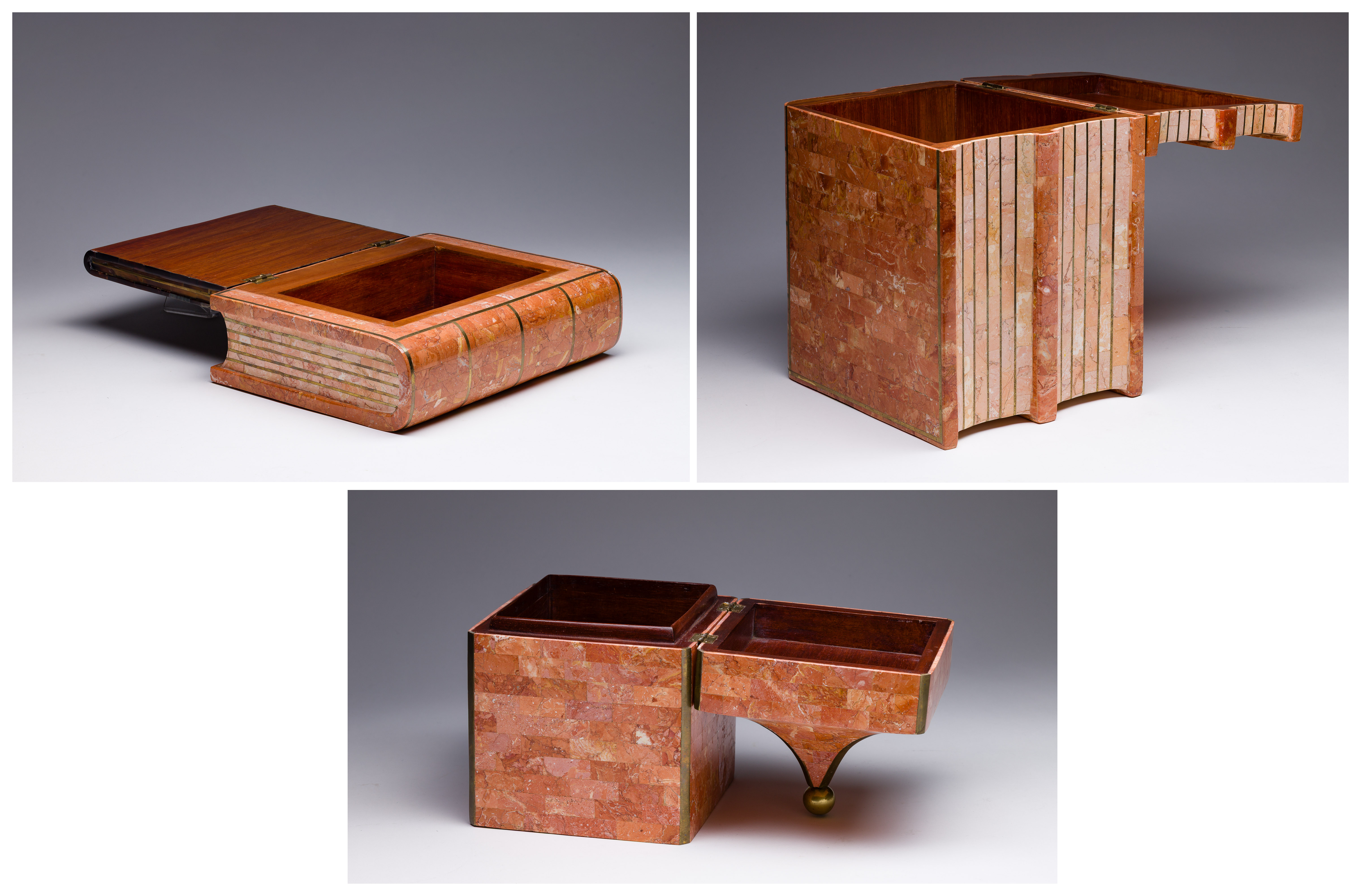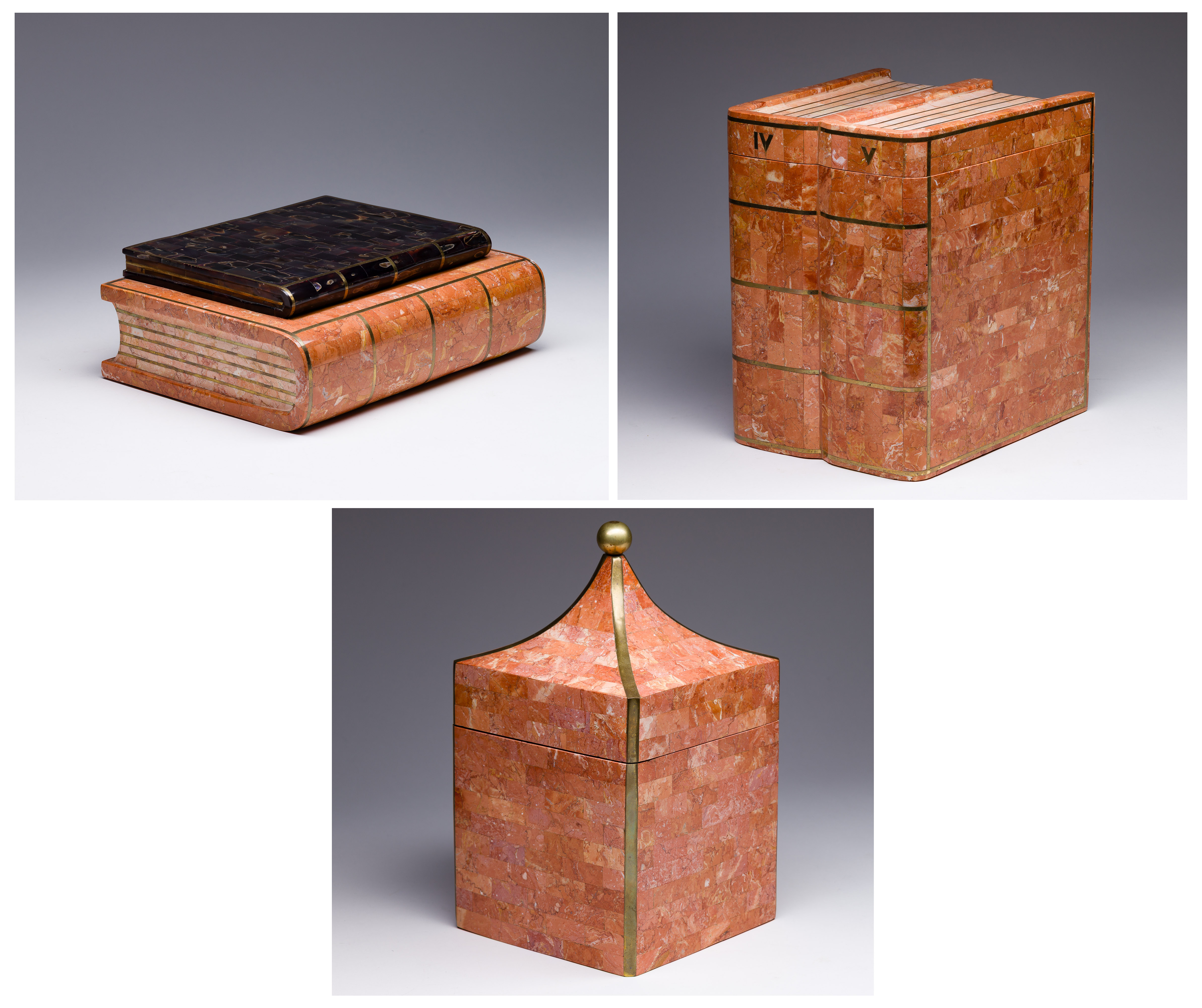(3) items of teak wood construction having pink marble veneers, one representing two stacked books, the upper being tessellated in abalone and having brass inlays, another depicting two vertical volumes, both having lighter color stone and brass inlays depicting page edges and a peaked lidded having brass finial and binding, two retaining Maitland-Smith foil labels reading ‘Hand Made in Philippines’