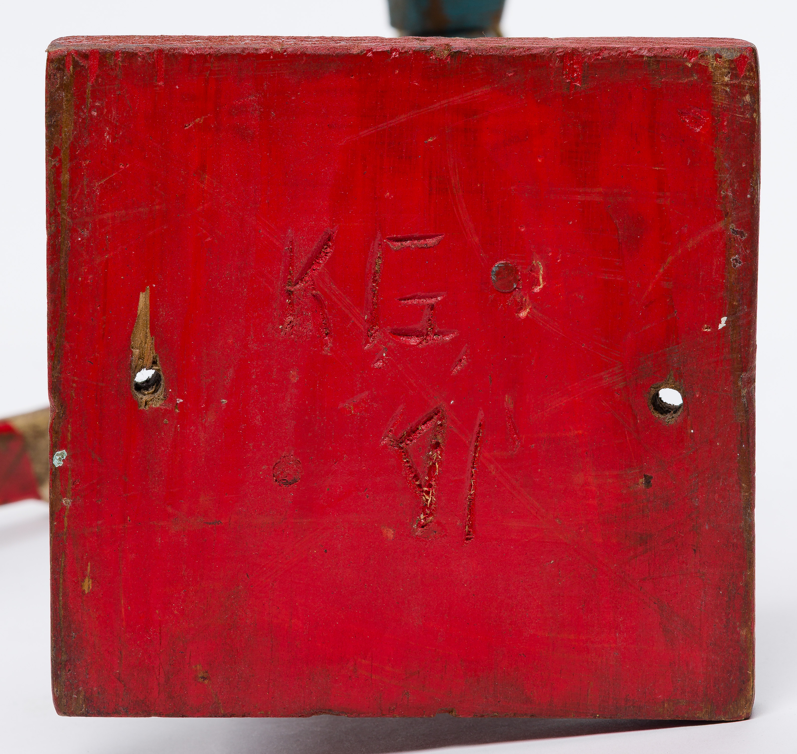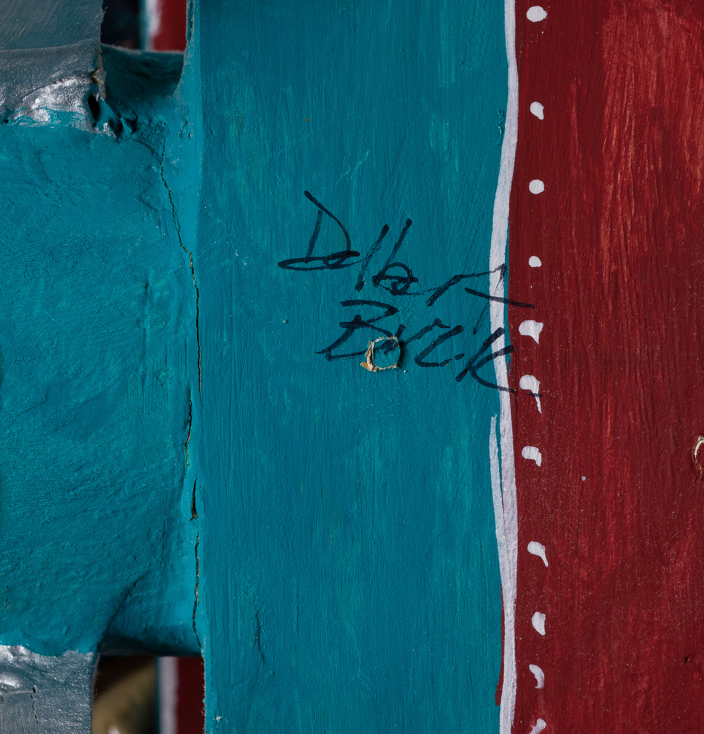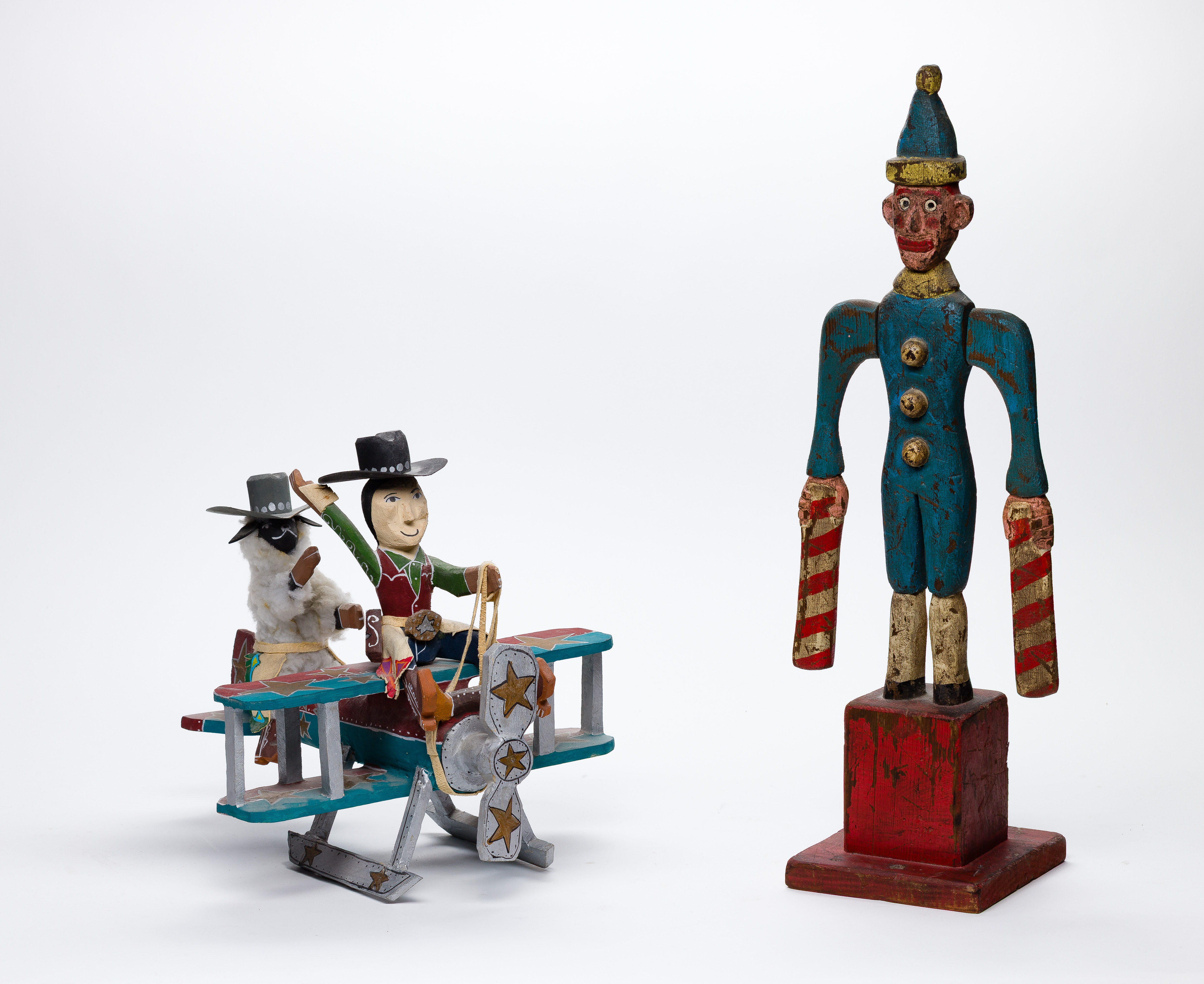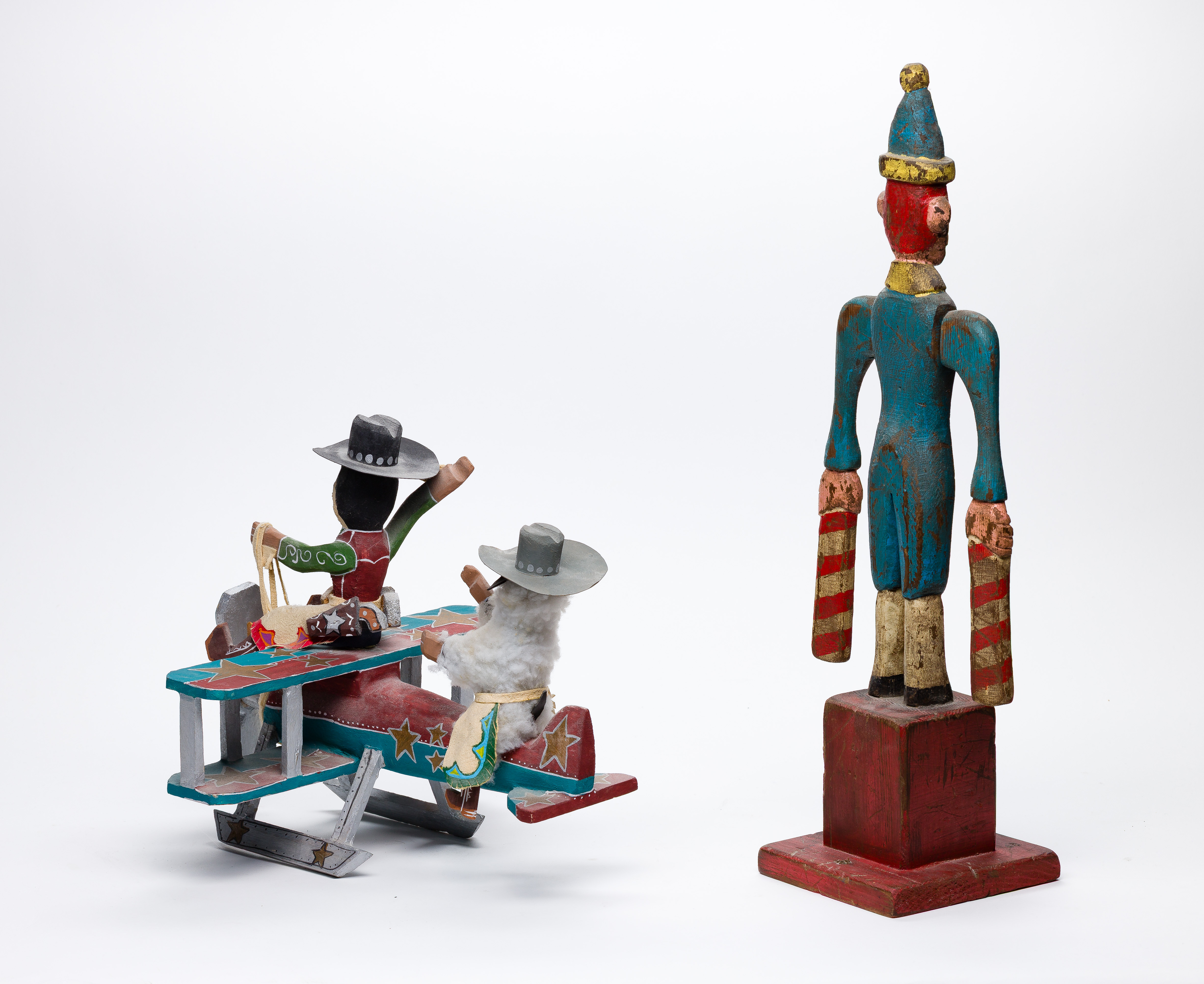 (2) total items including the biplane having figures signed ‘Delbert Buck’ underside; together with a standing figure whirligig, initial signed and dated ‘KG ’01’ underside