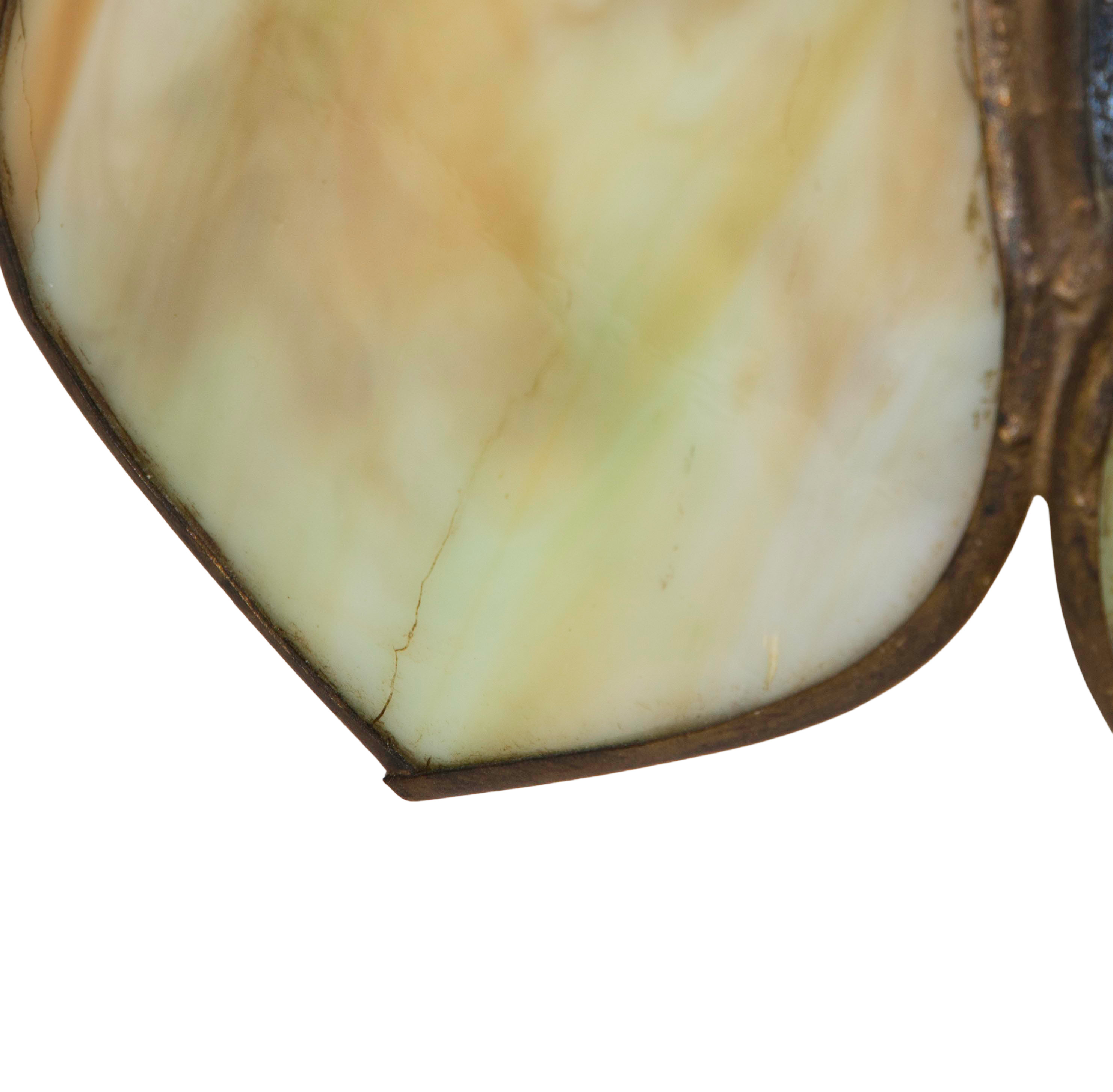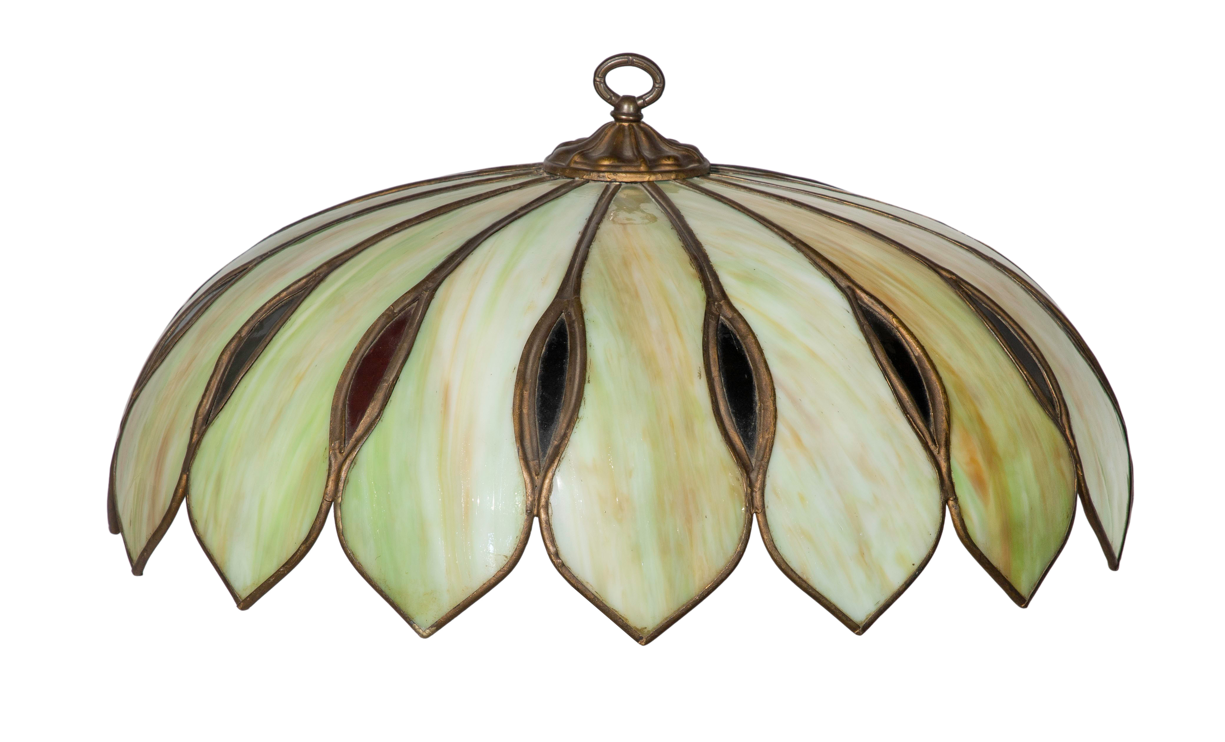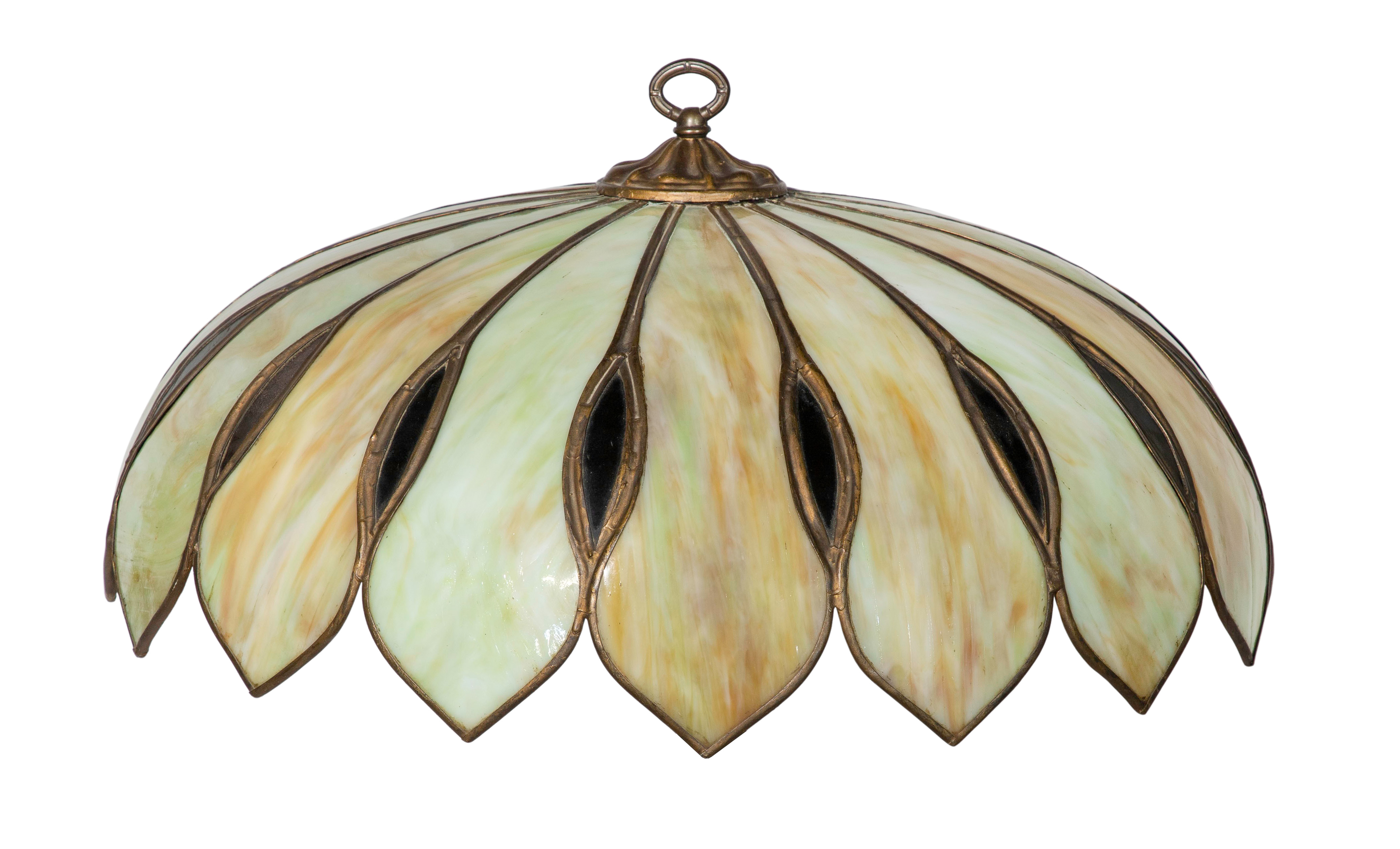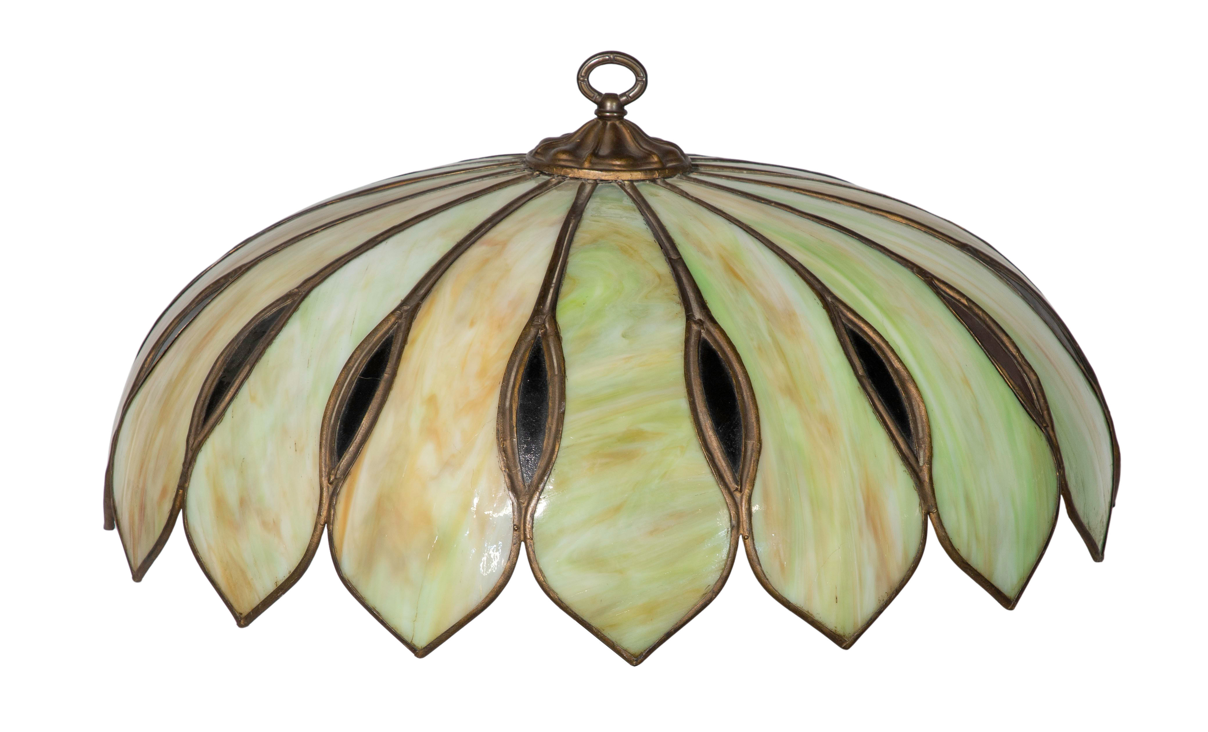 Having cream and green sixteen-panel glass shade in the form of lotus petals on a metal base