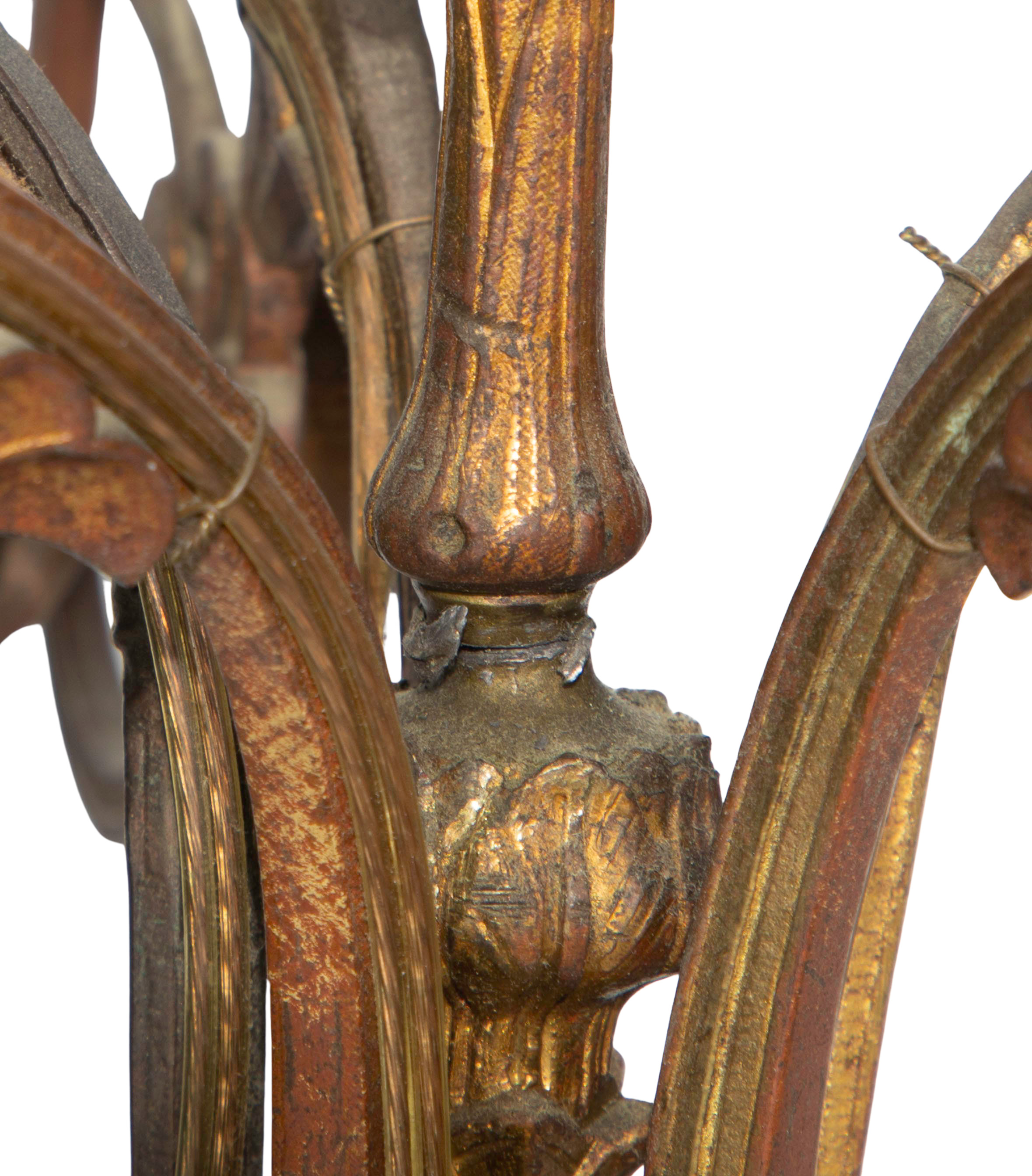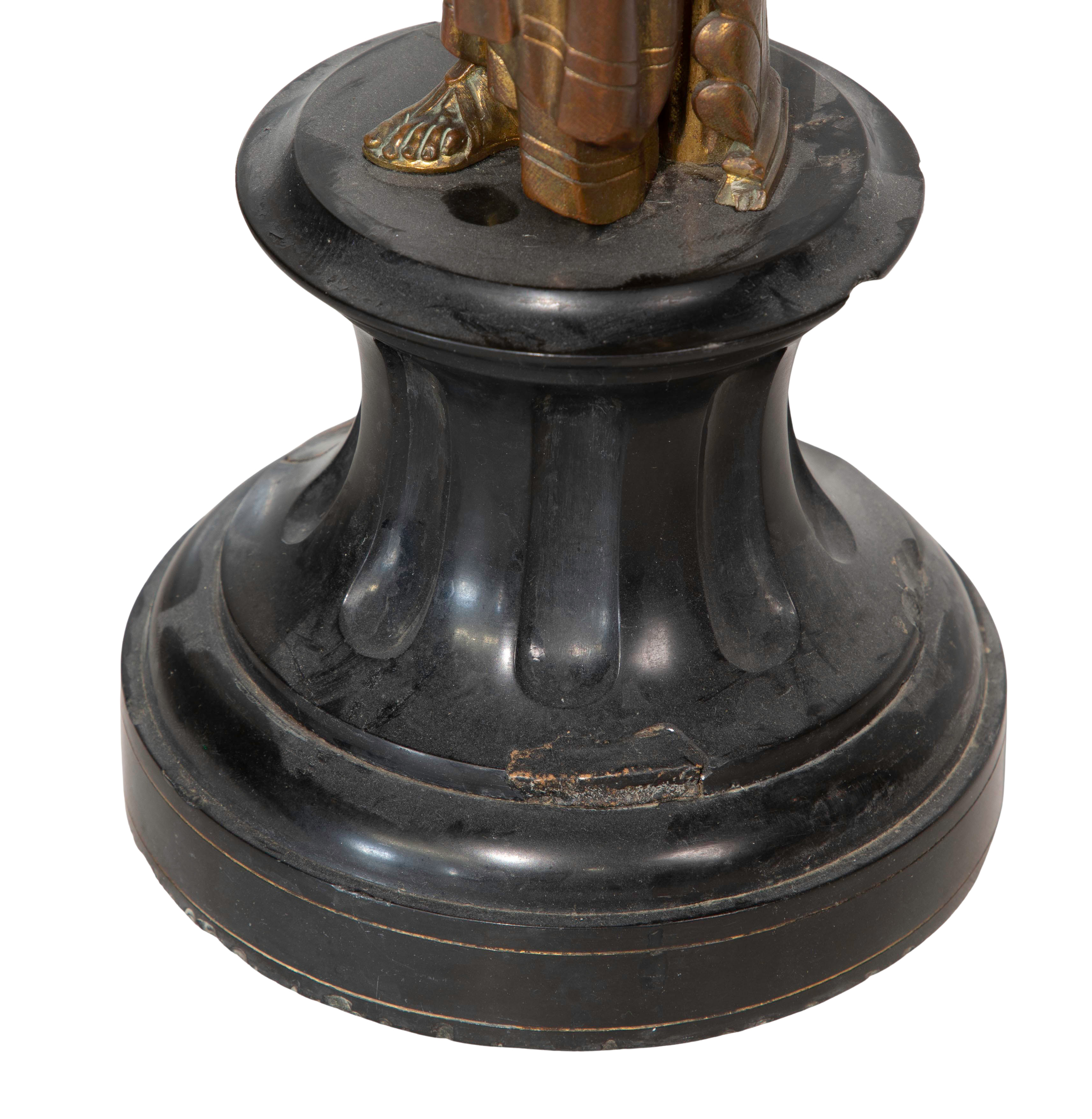 one arm broken, cracked part on rod support, repairs on stone bases, tarnish and gilt loss on bodies