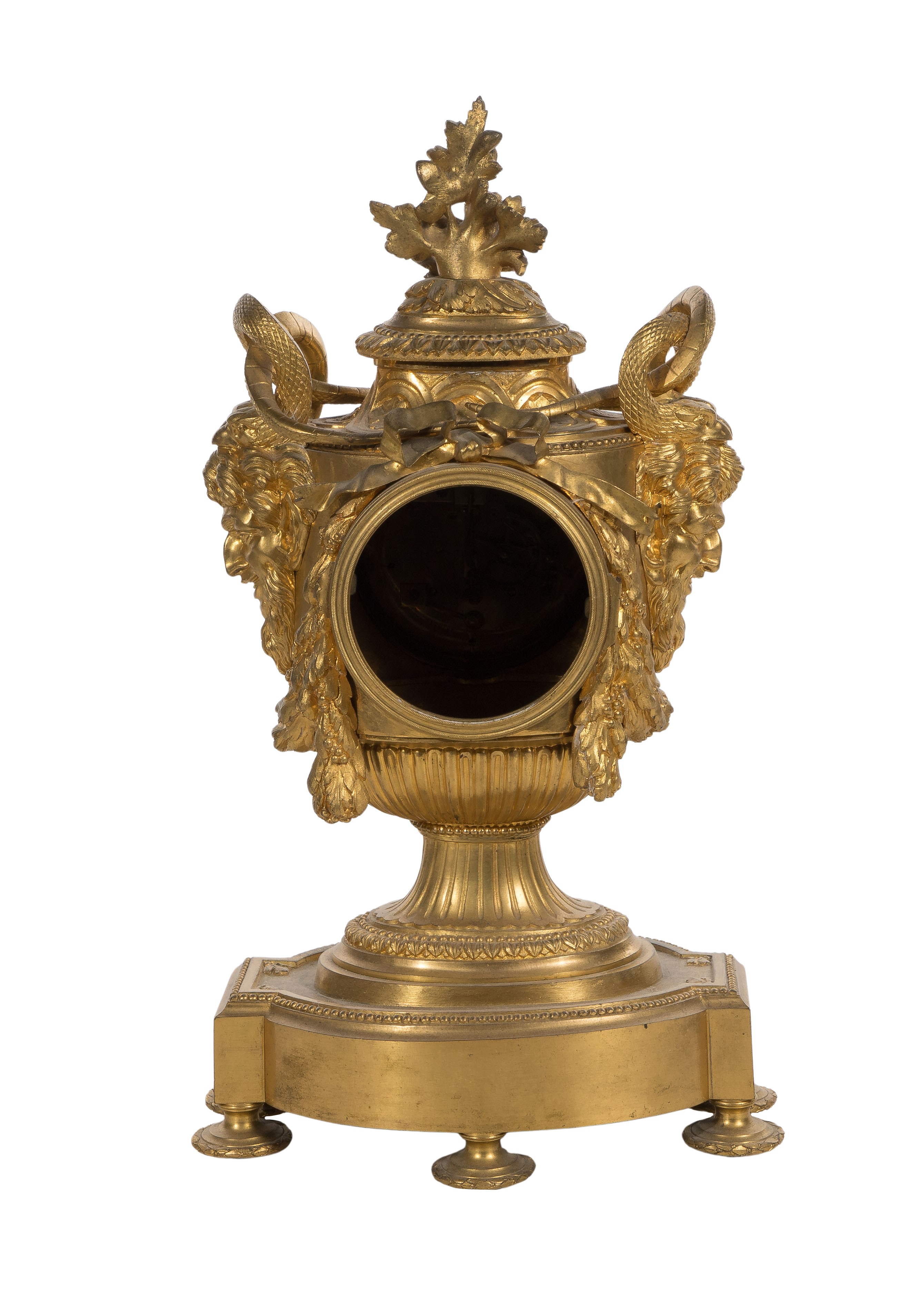 Urn form, enameled Roman numeral dial signed ‘Gasnier / A Paris / Qua Voltaire 17’, having two key ports, draped garland motif, flanked by satyr heads surmounted by pairs of eagle-headed serpents, fruit finial, all supported on an oblong base having six feet, pendulum and key present