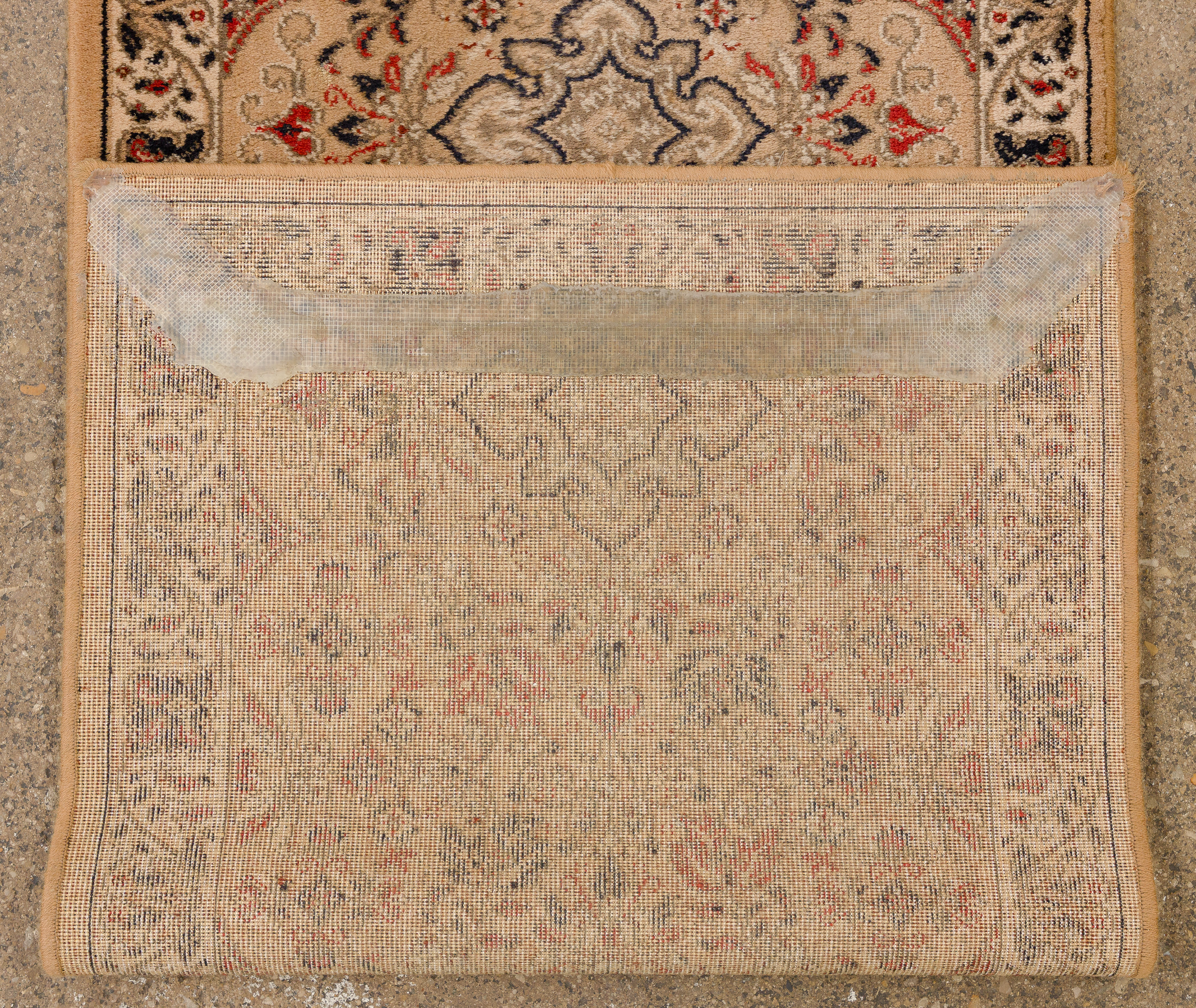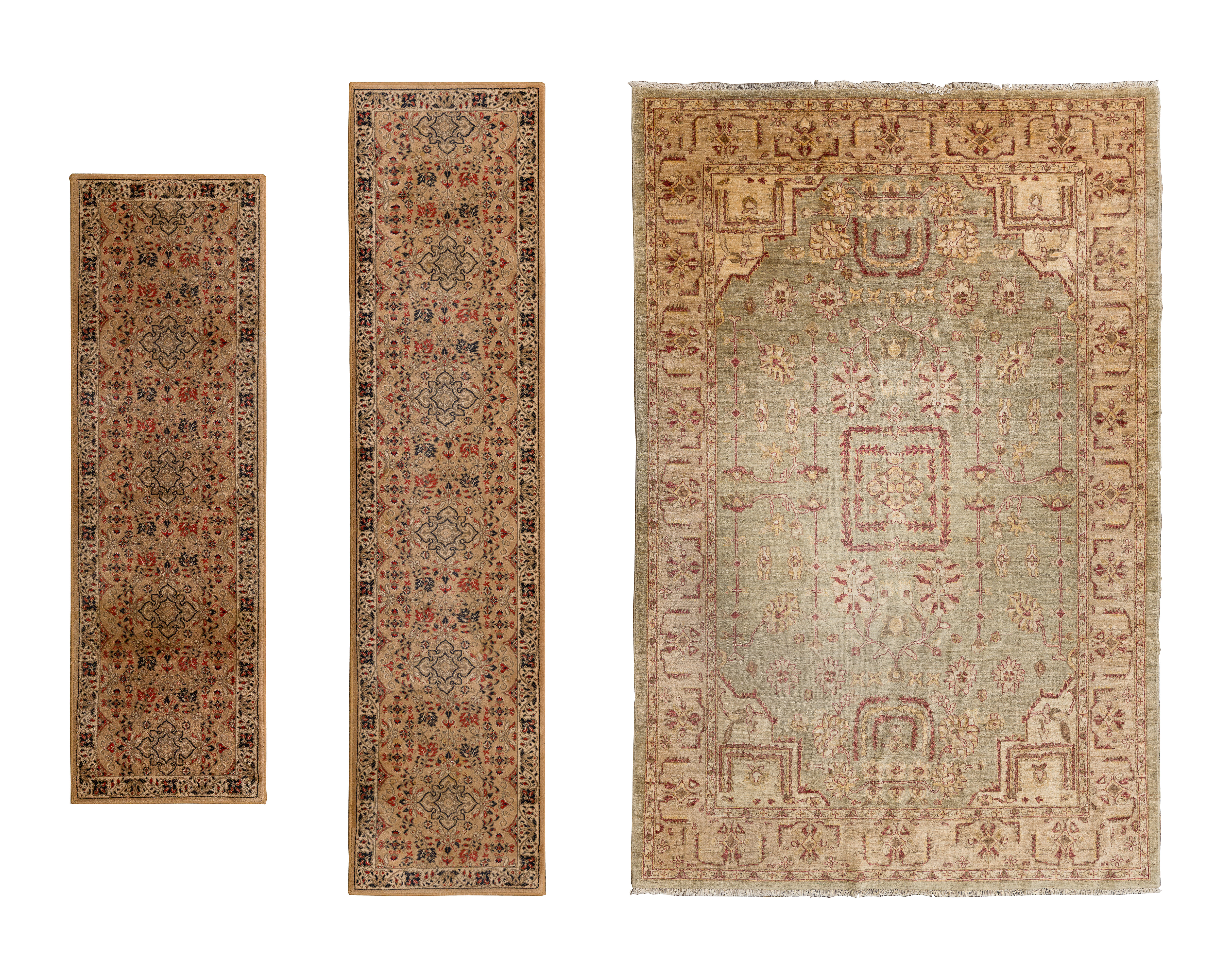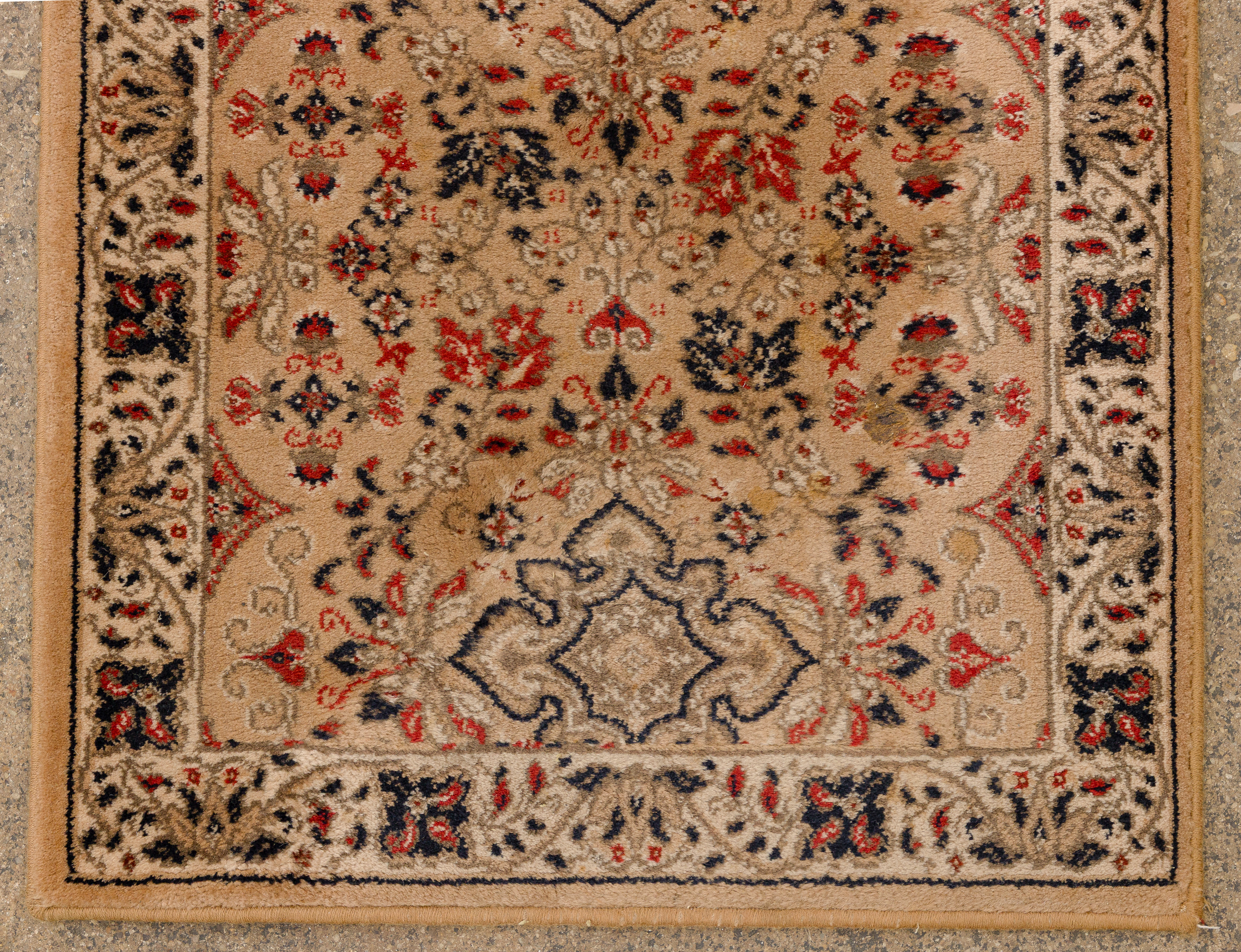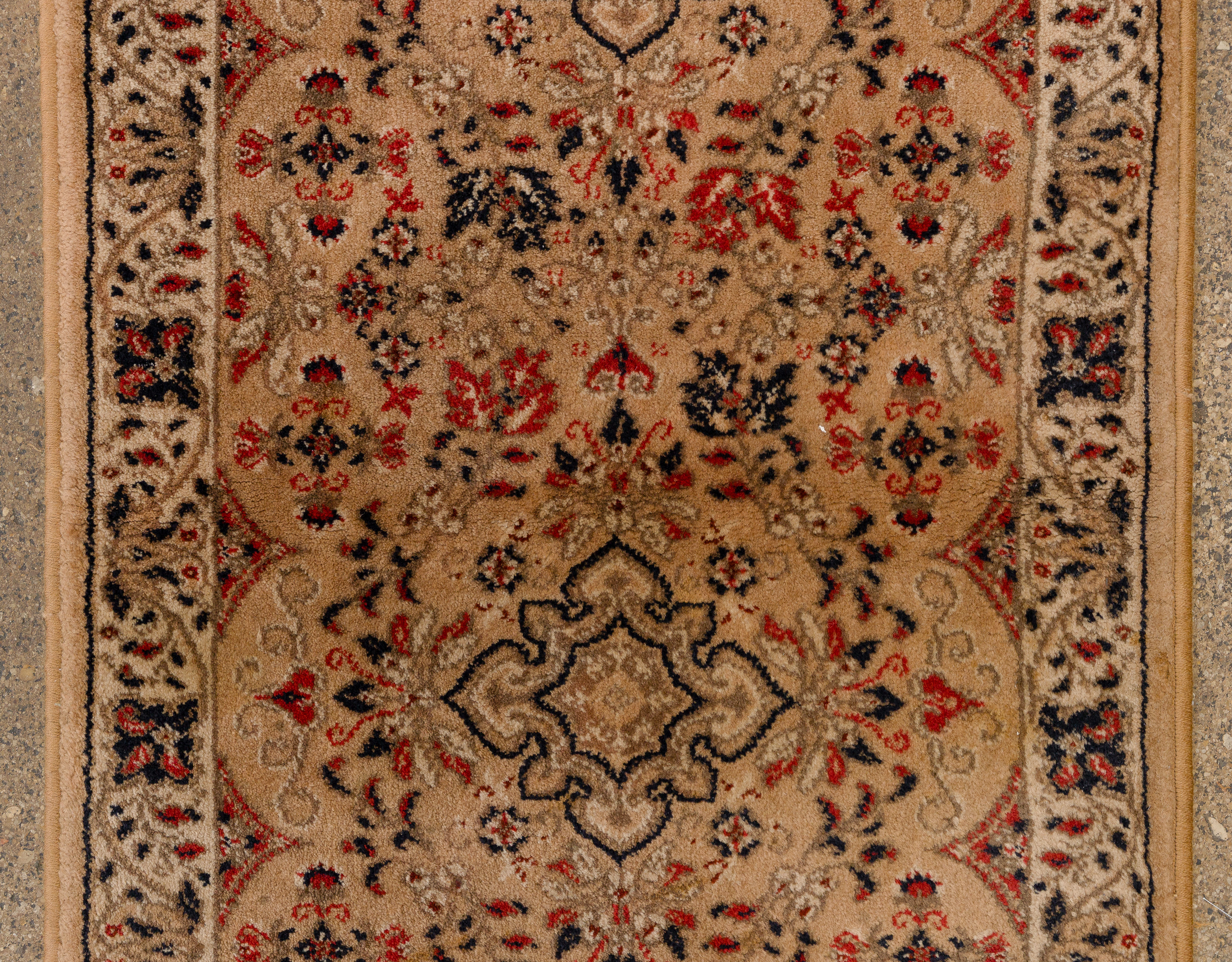 (3) items including a floral design in hues of tan, wine and cream on an oatmeal field, a runner having an floral design in hues of red and blue on a tan field (9 ft x 2ft. 2 in.) and a similar runner in hues of red and blue on a tan field (7 ft x 2ft 2in.)