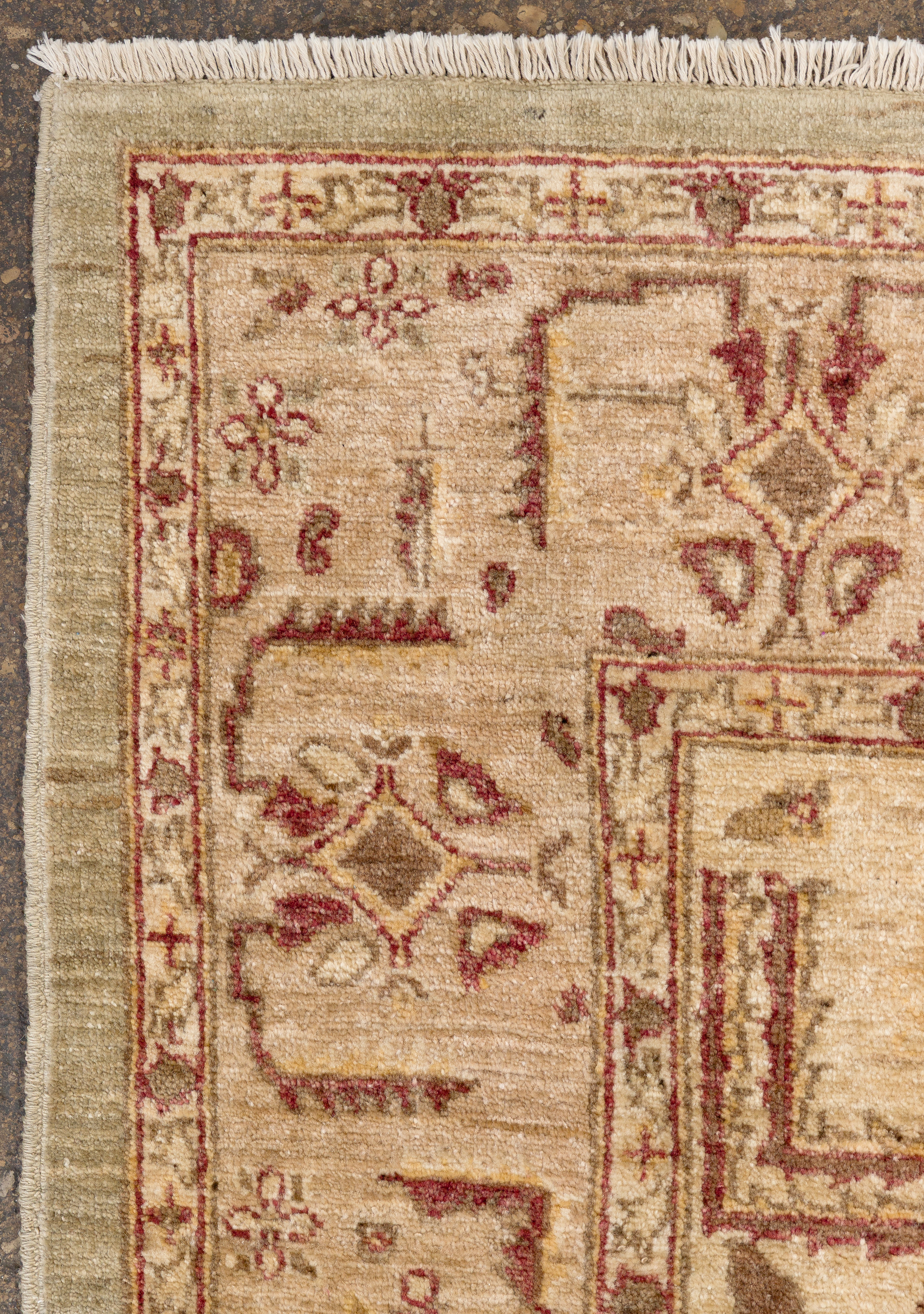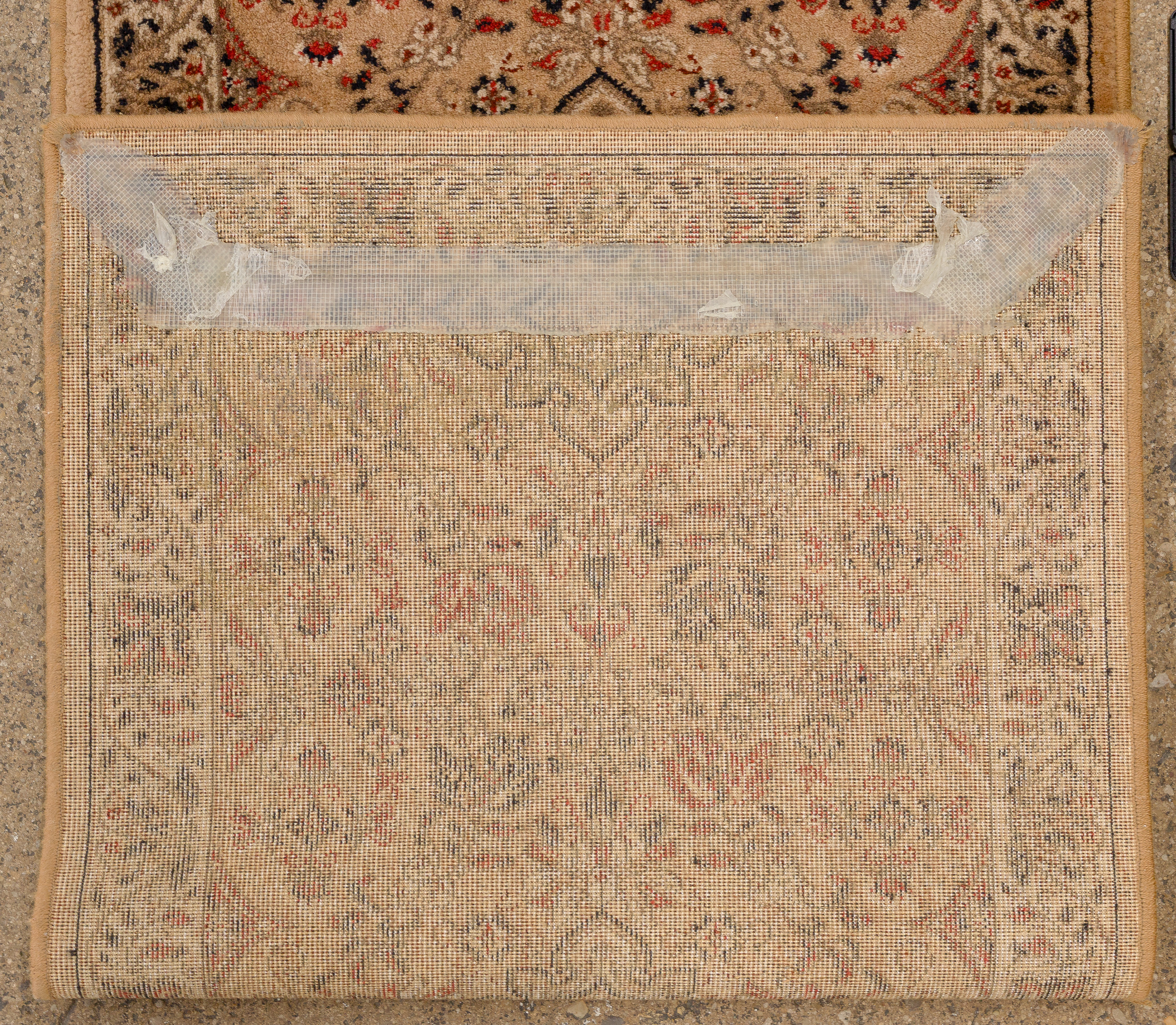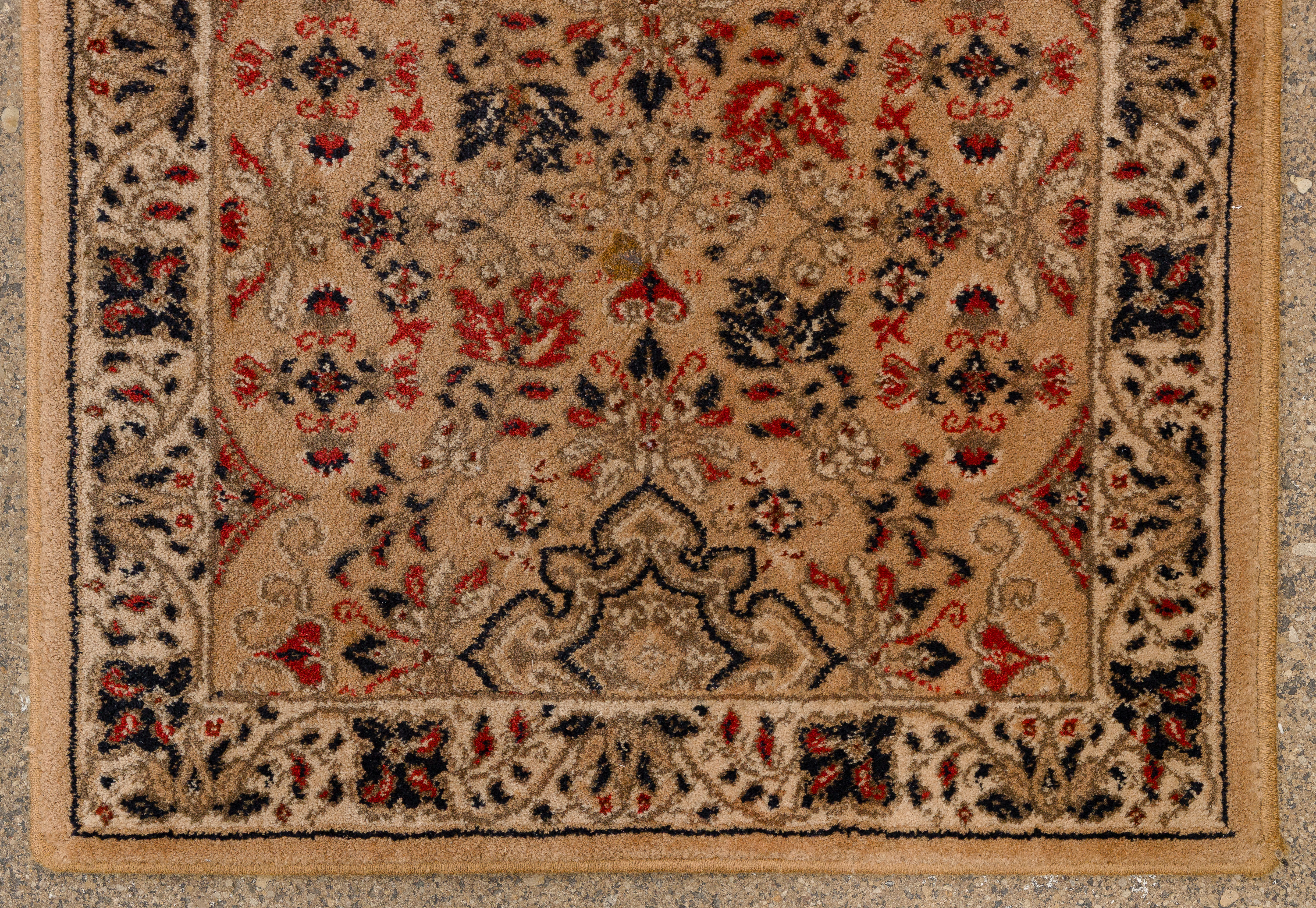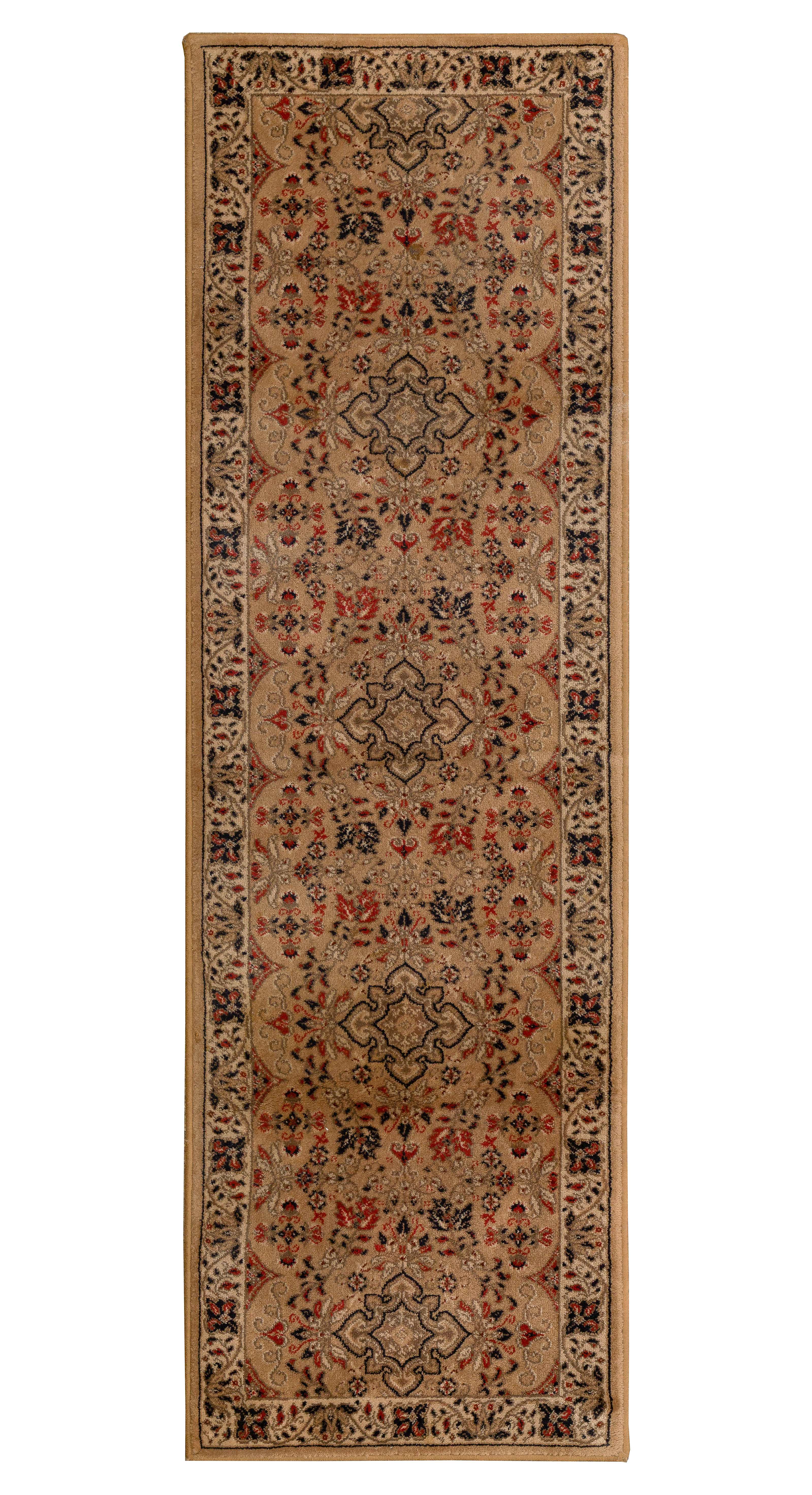 (3) items including a floral design in hues of tan, wine and cream on an oatmeal field, a runner having an floral design in hues of red and blue on a tan field (9 ft x 2ft. 2 in.) and a similar runner in hues of red and blue on a tan field (7 ft x 2ft 2in.)