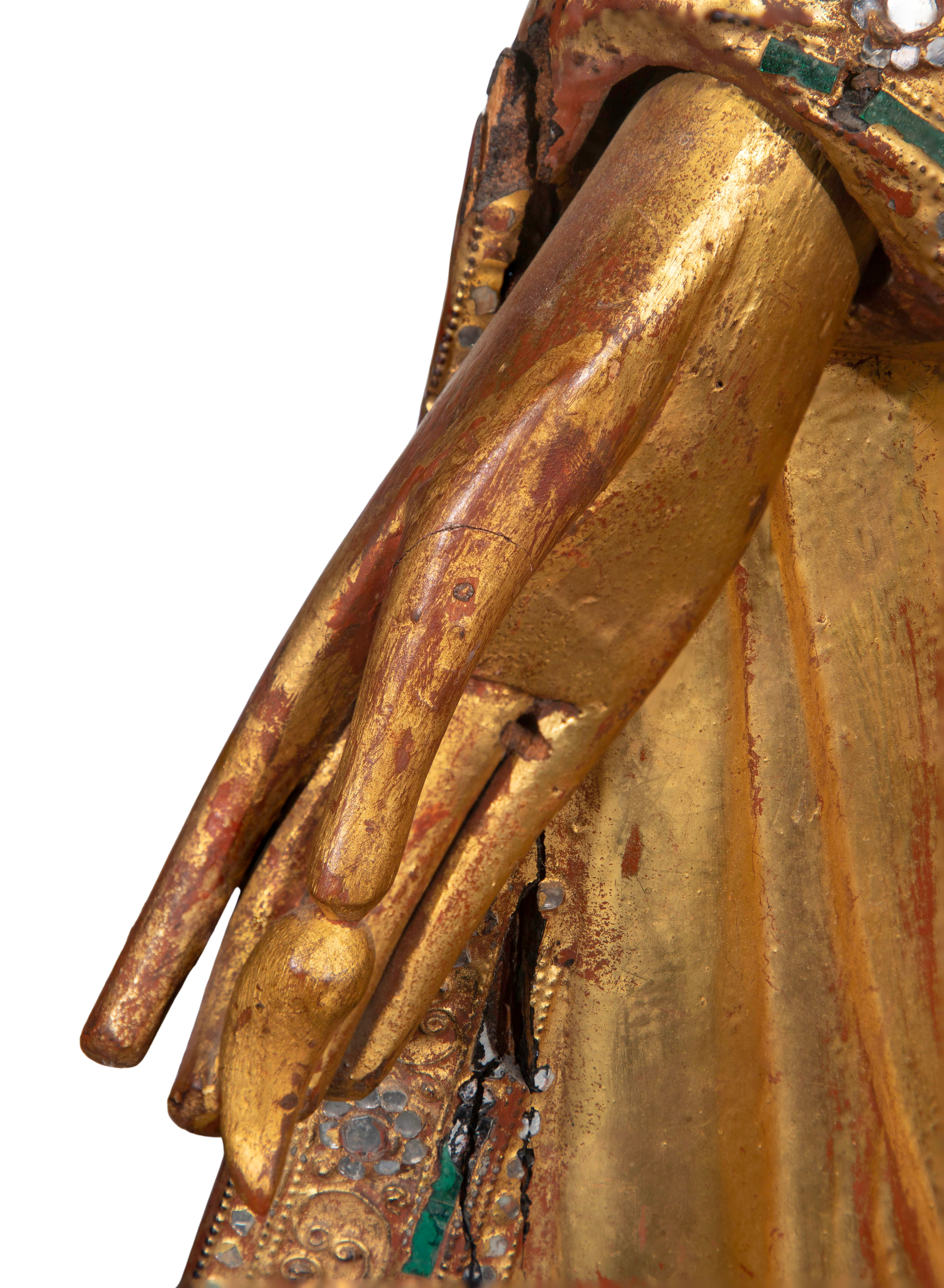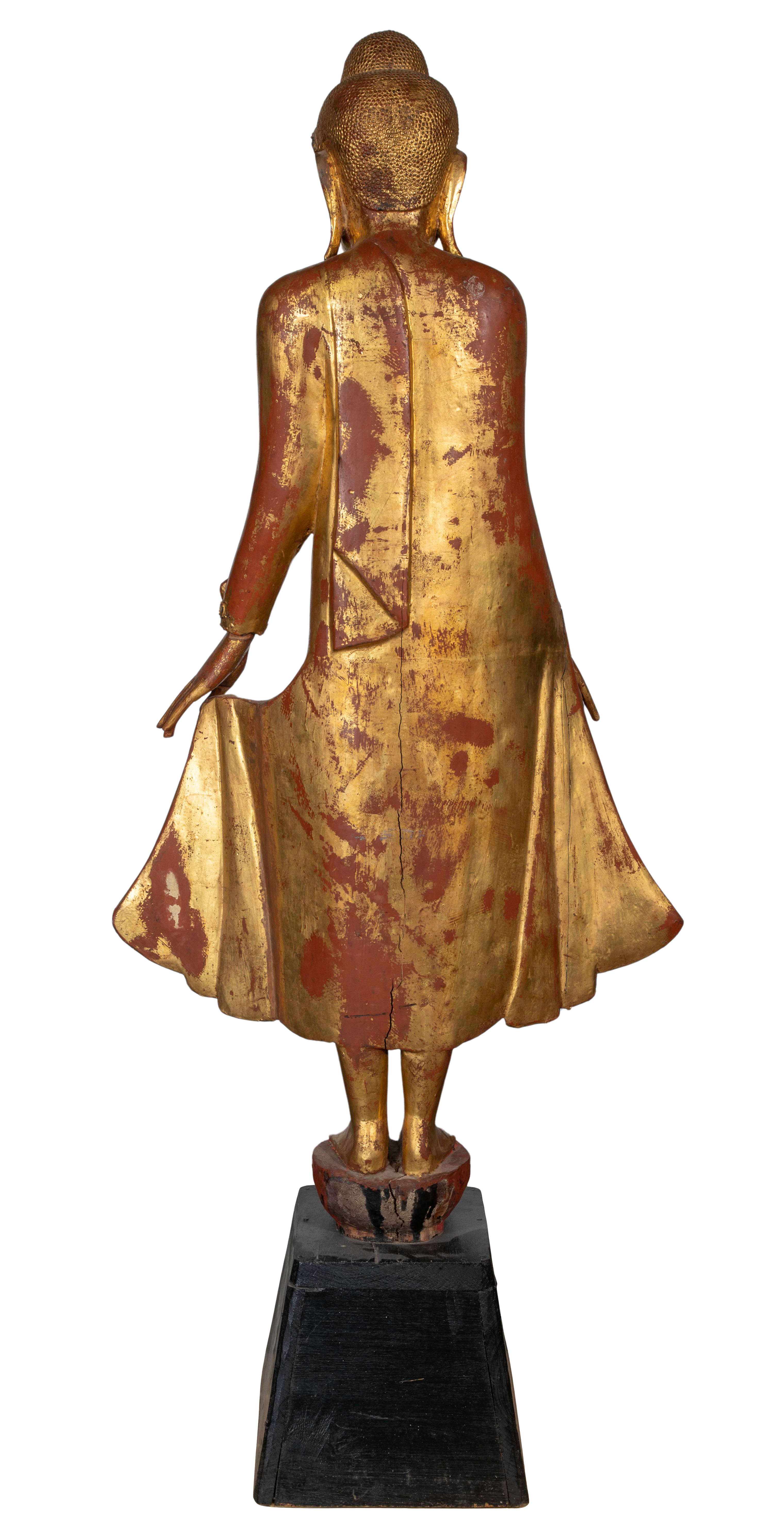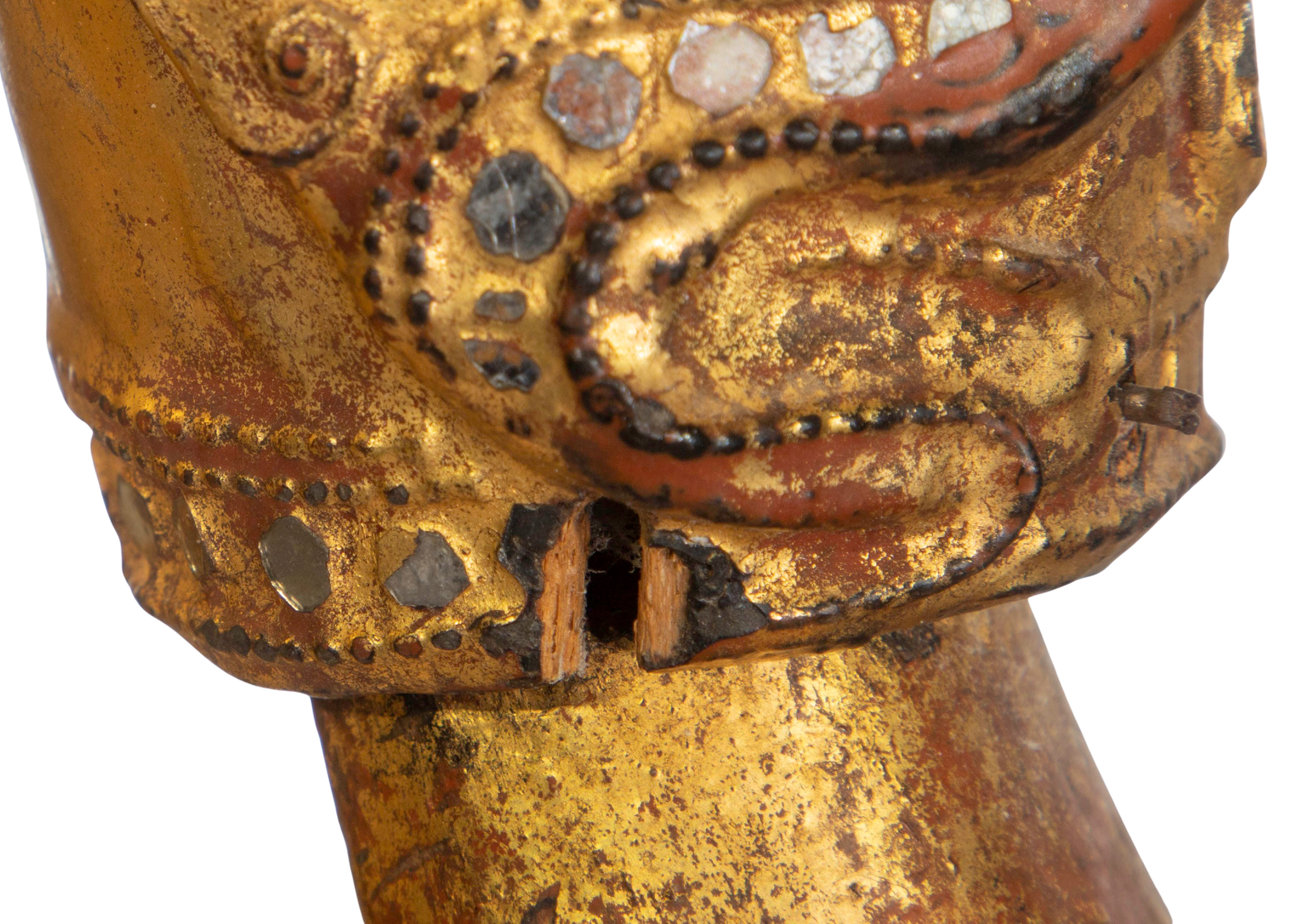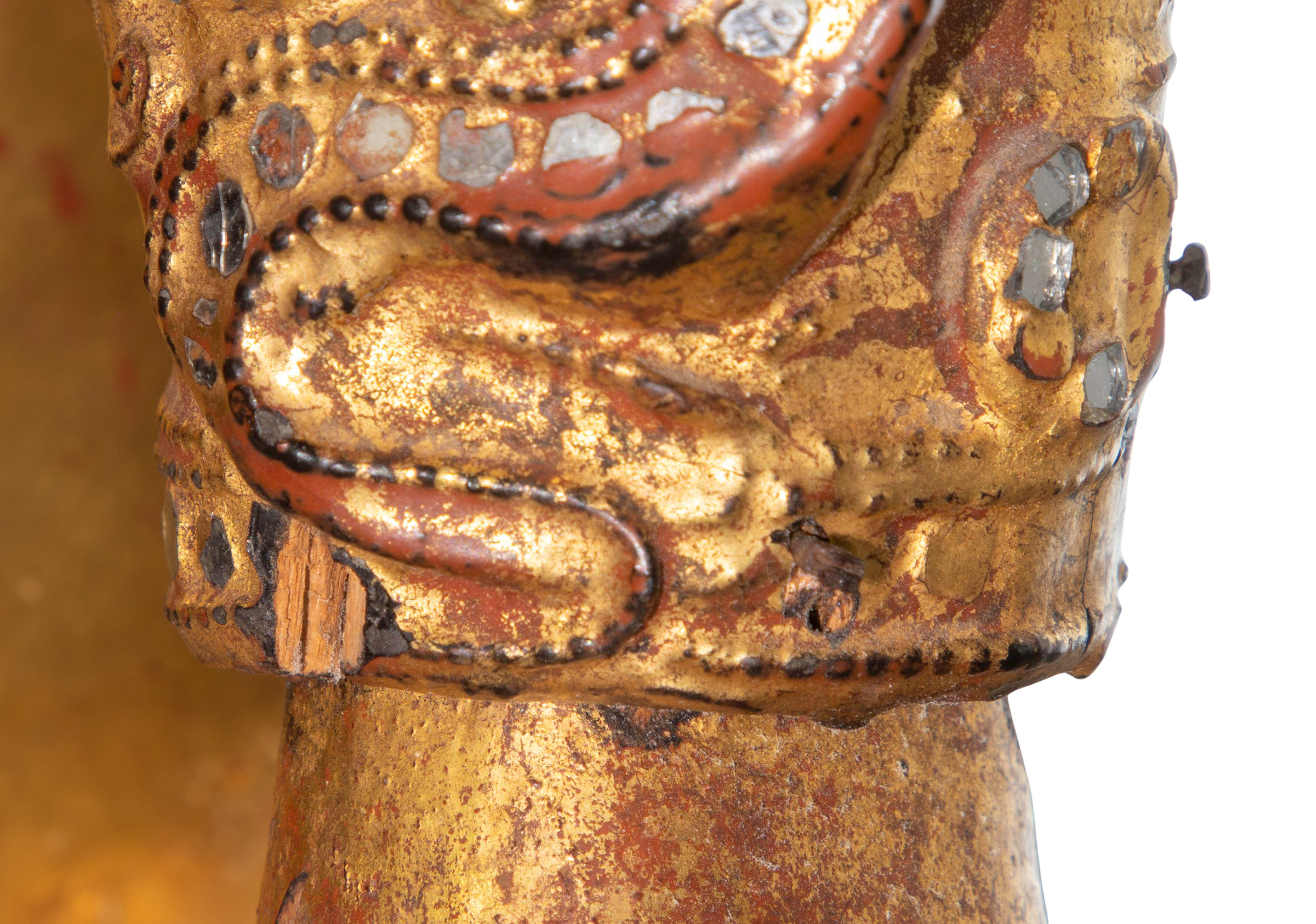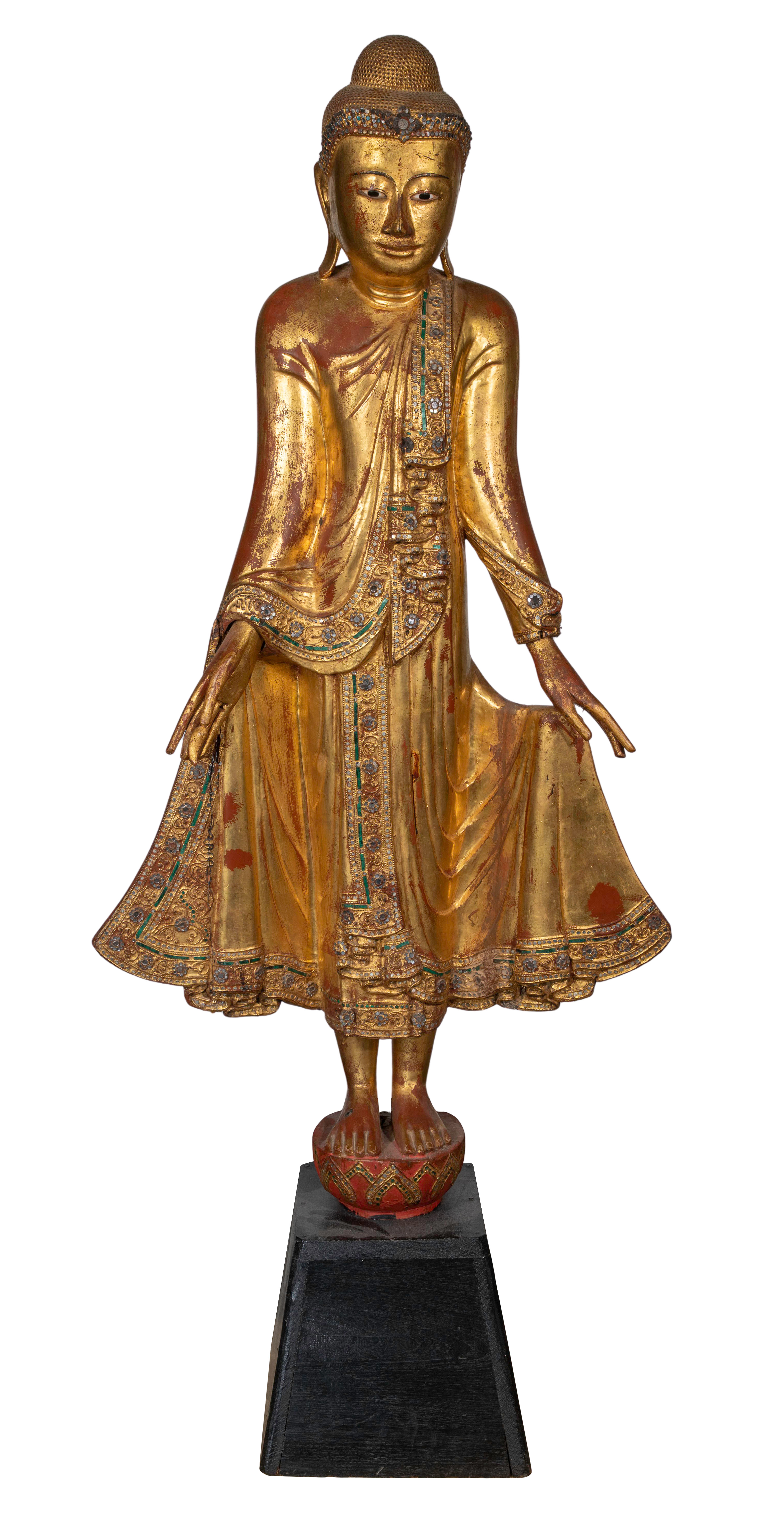Mandalay style gilt lacquered wood having colored glass inlays, on integral base mounted on a wood pedestal base