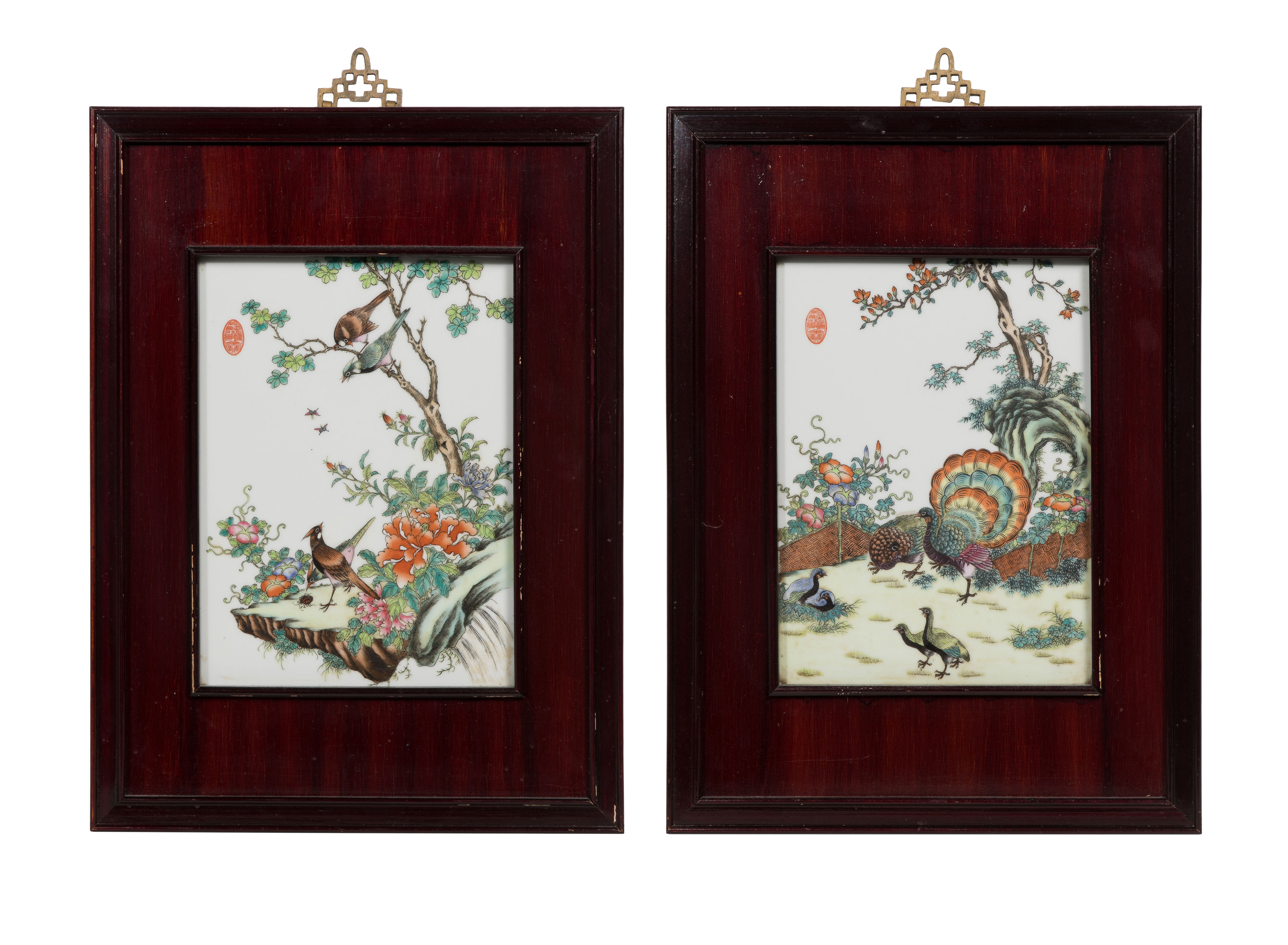 A pair of hand painted, enameled porcelain plaques depicting domestic and wild birds, in wood frames having brass hangers