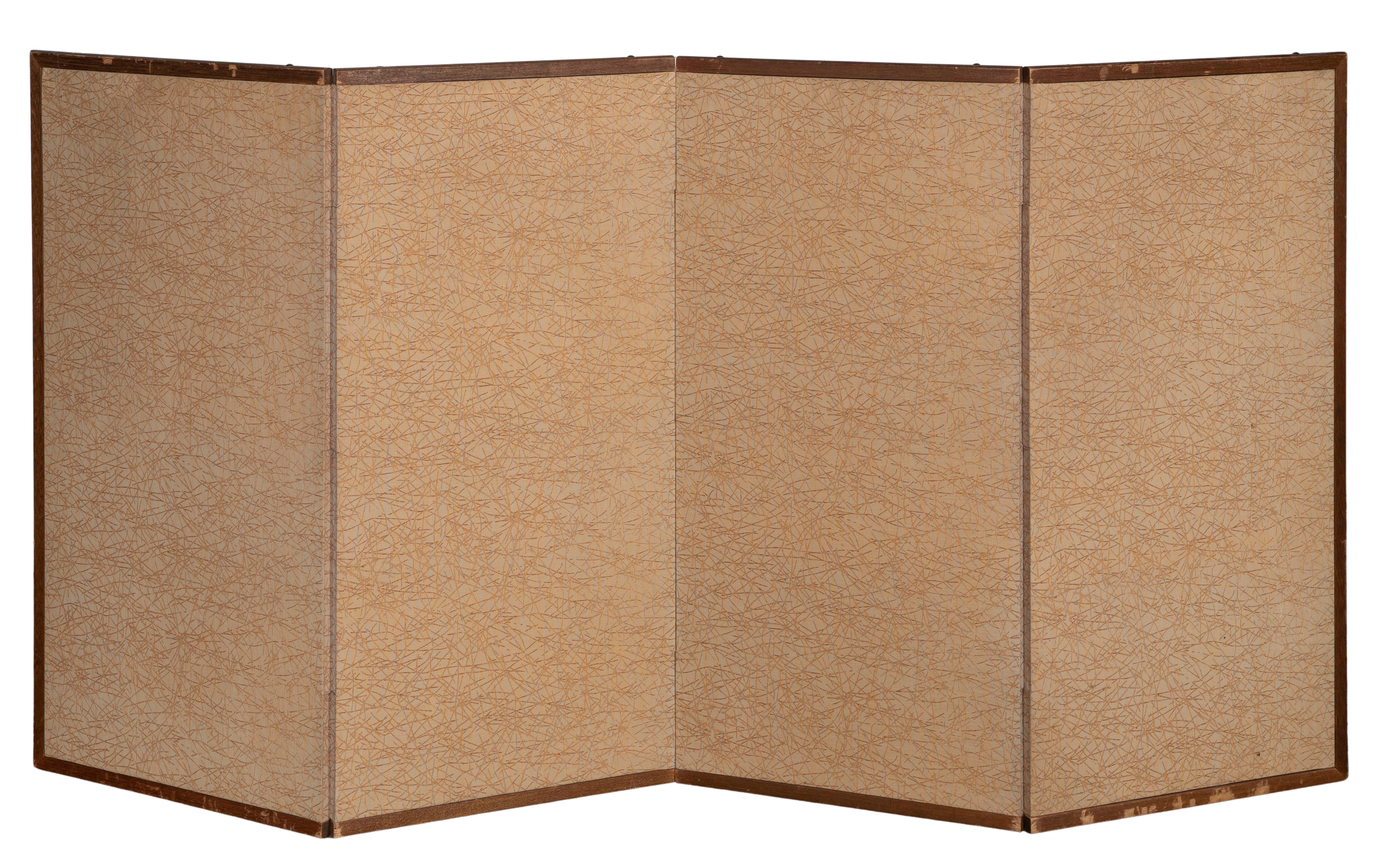 A four-panel wood-framed painting on silk depicting a bluebird amid branches of prunus blossoms, having a two-character signature