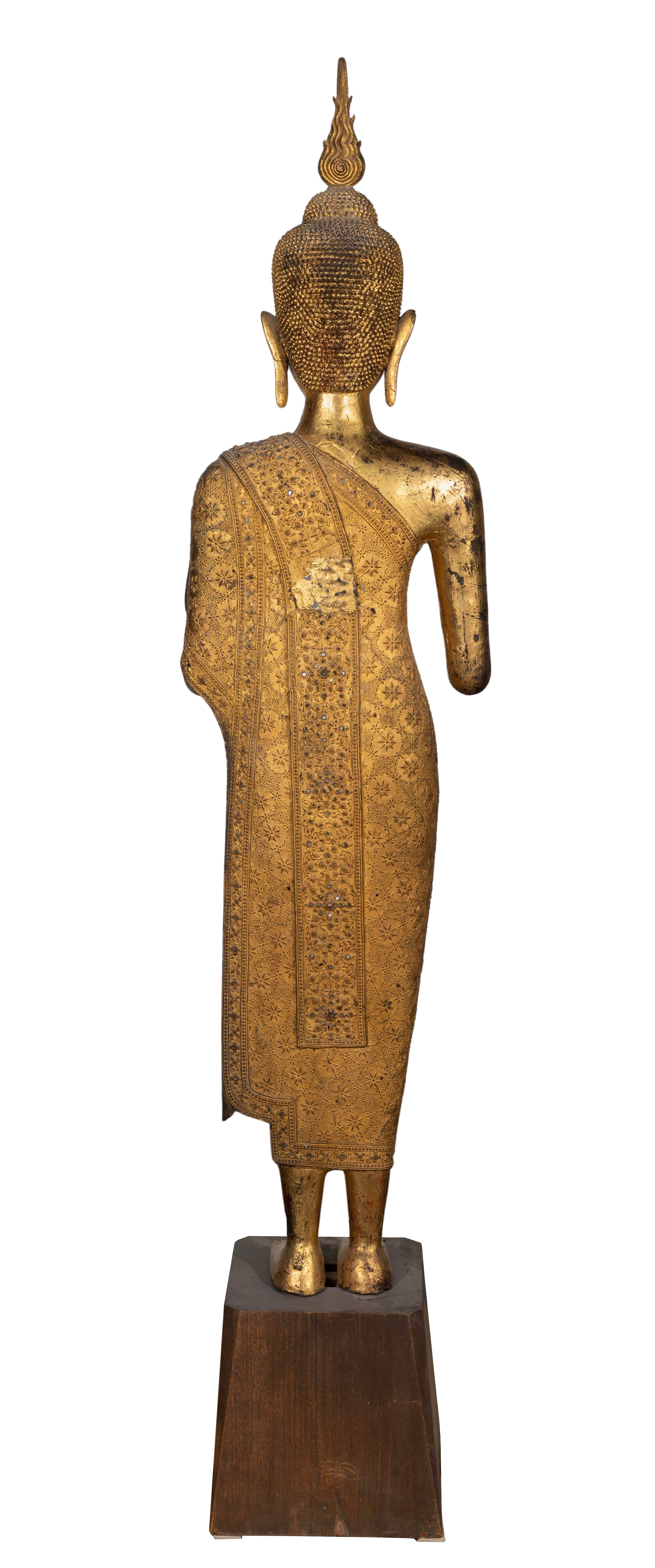 Rattanakosin style standing Buddha on wood base having overall raised floral decoration, painted eyes