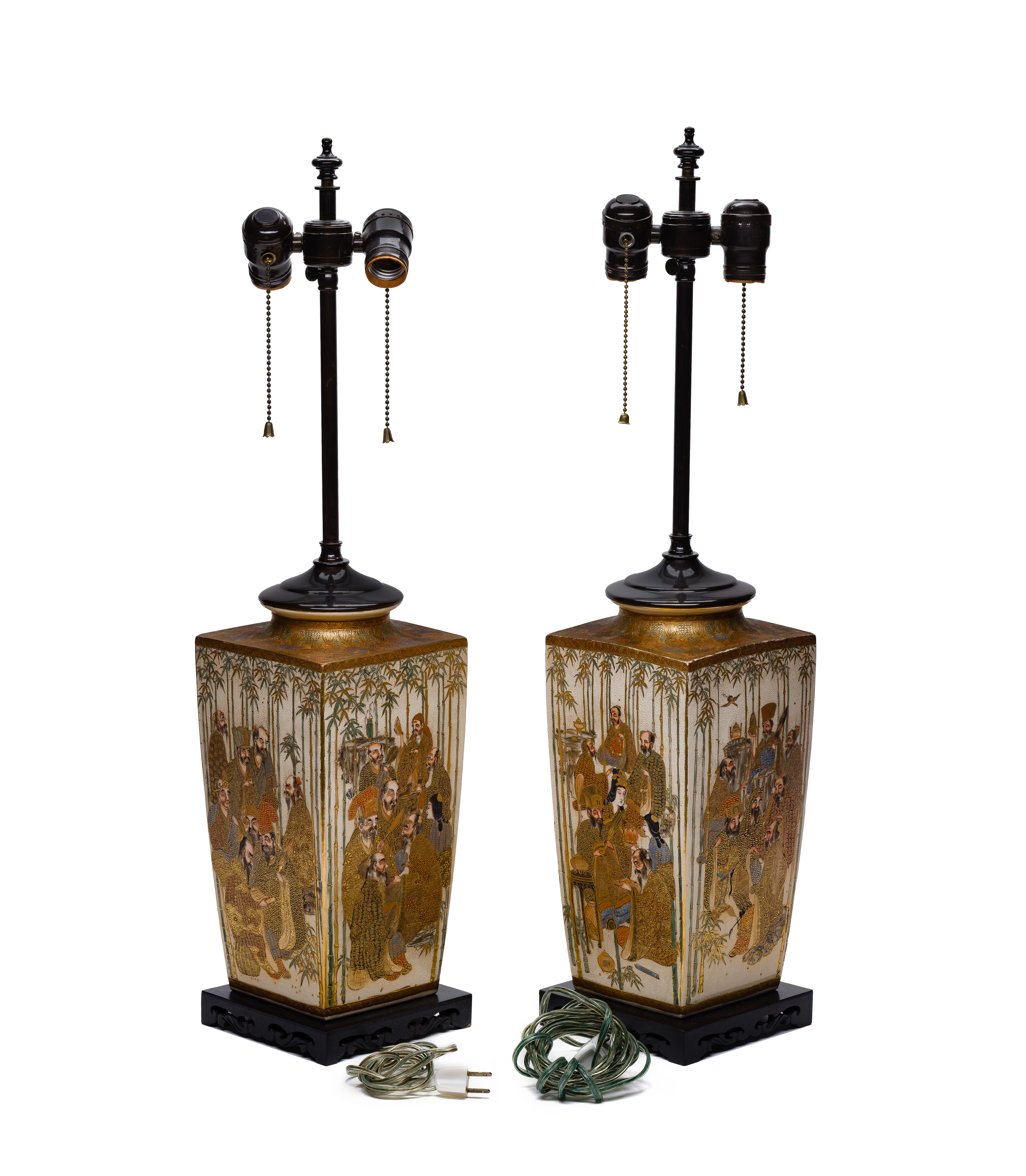 A pair of tapering square bodied transitioning to round necked vases, having patterned gilt and color pictorial panels depicting numerous figures, patterned gilt necks, shoulders and foot bands, on wood bases, wired as 2-socket lamps having adjustable standards