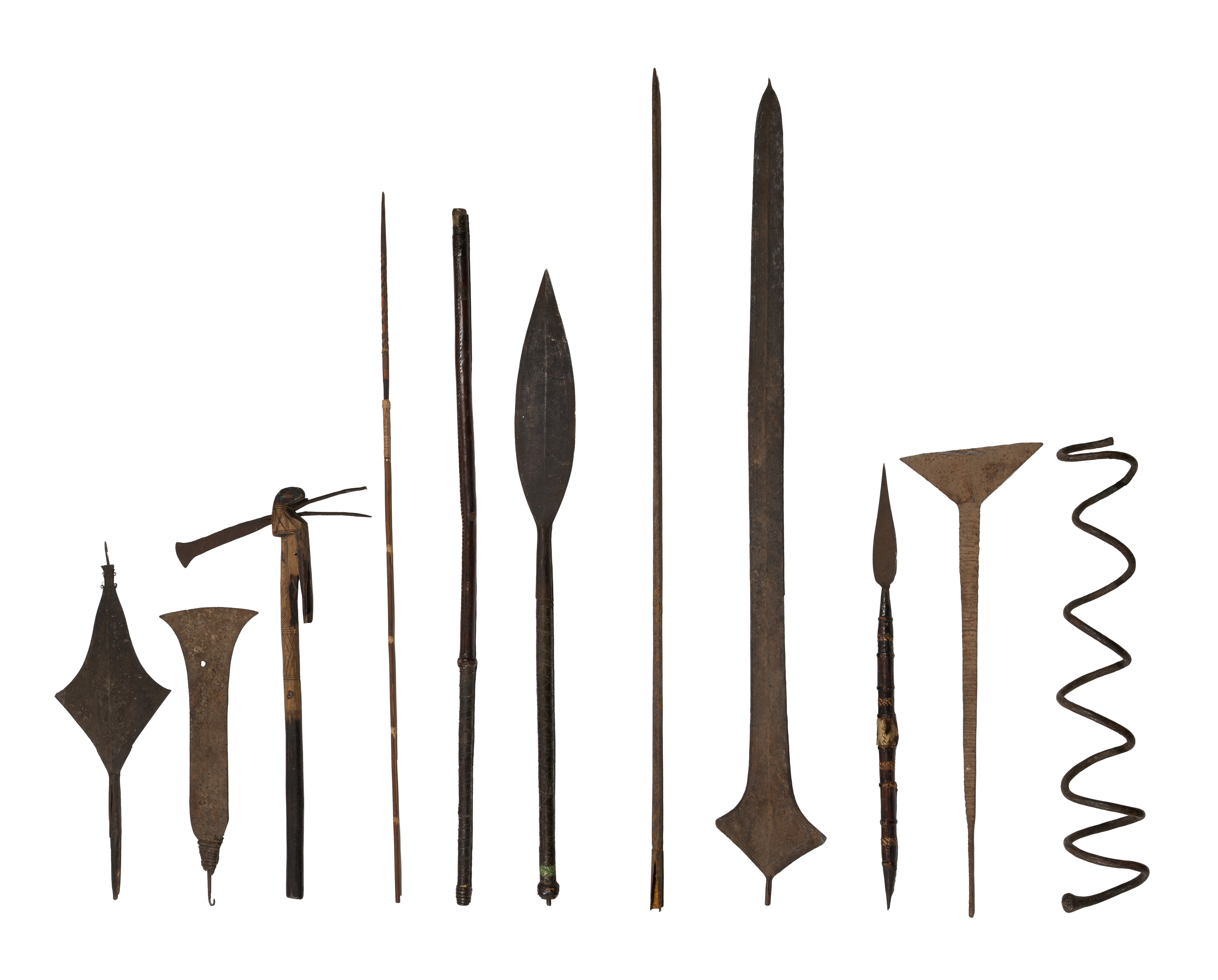 (10) total items including currency objects comprising a Ngebele or Liganda iron sword, a Mbole currency spear blade, an Lyembe serpentine coil and an Idoma currency stick as well as weapons including a Kuba flared-blade knife, a likely Mossi throwing axe, a short spear from Sierra Leone, a Maasai long spike spear head and an unidentified spear having 2-piece metal-wrapped screw-together shaft; together with an unidentified, likely Oceanic, reed arrow or dart having a barbed carved wood head and woven split rattan wrapping