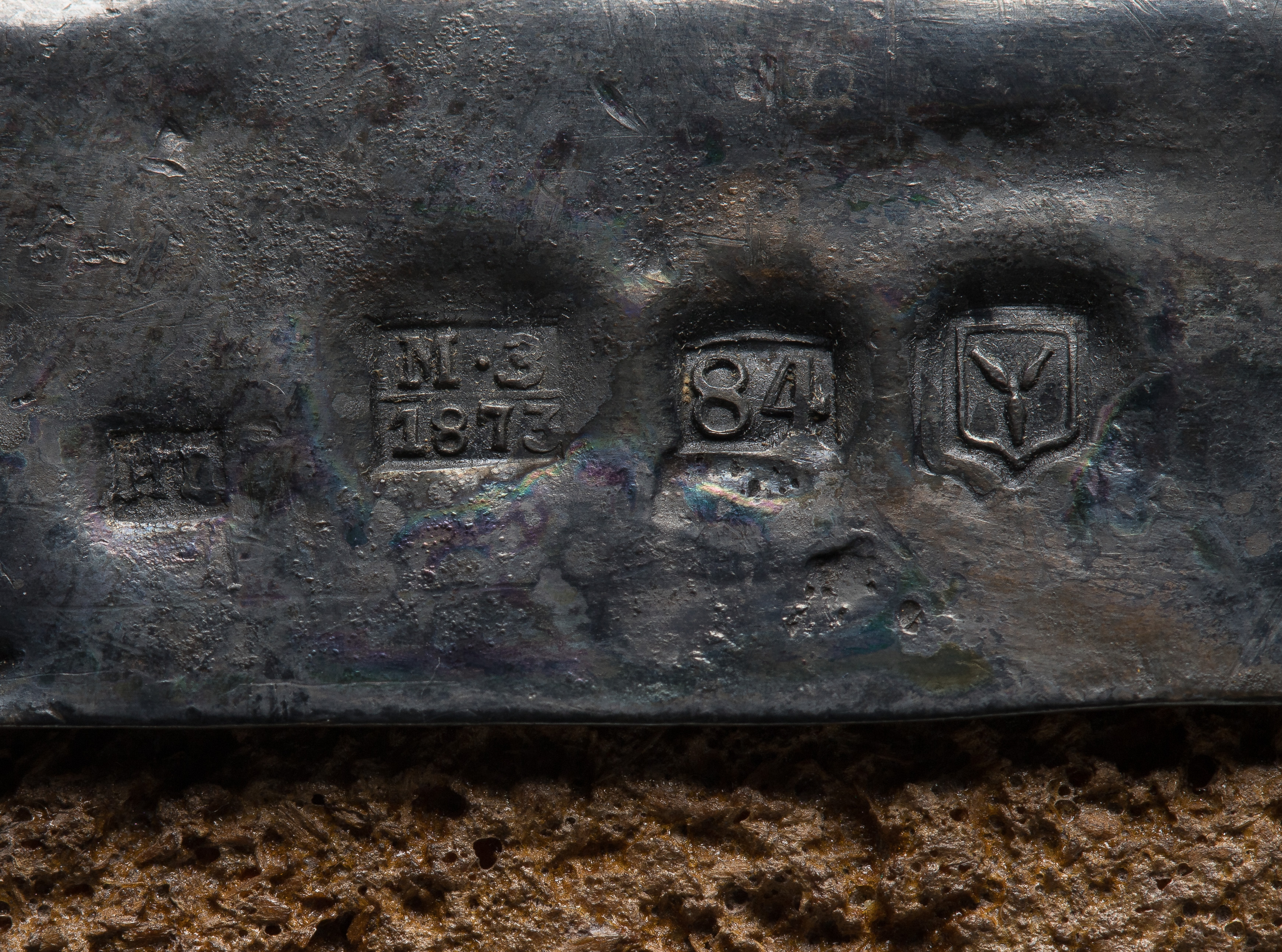 A hand painted wood panel icon of Christ Pantocrator behind a hallmarked, engraved silver oklad having attached pierced repousse halo and unidentified maker mark ‘HD’, dated ‘1875’ assay mark, ’84’ and unidentified town mark, retaining a Barbara and Richard Kaszuba Antiques, London label verso