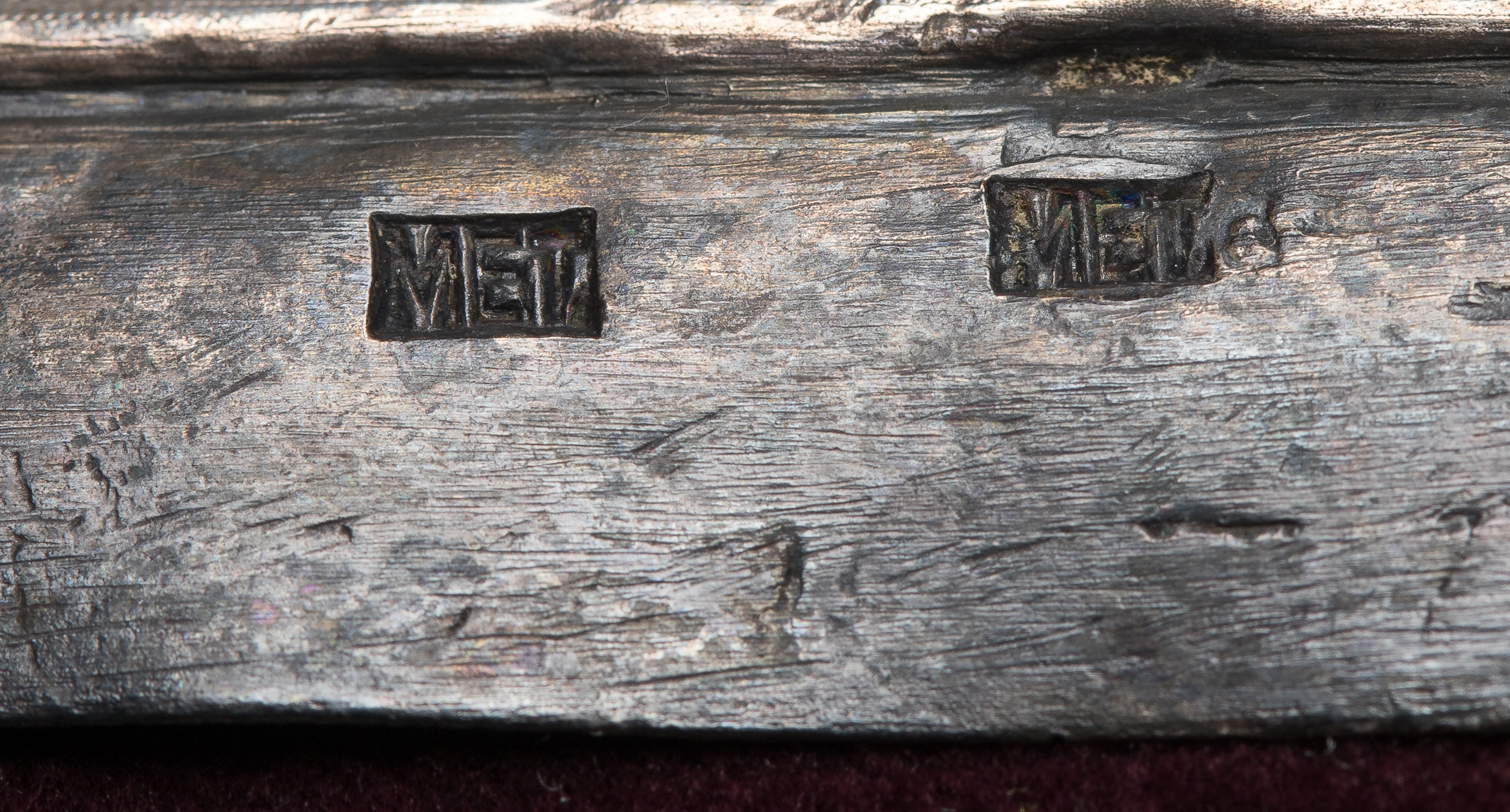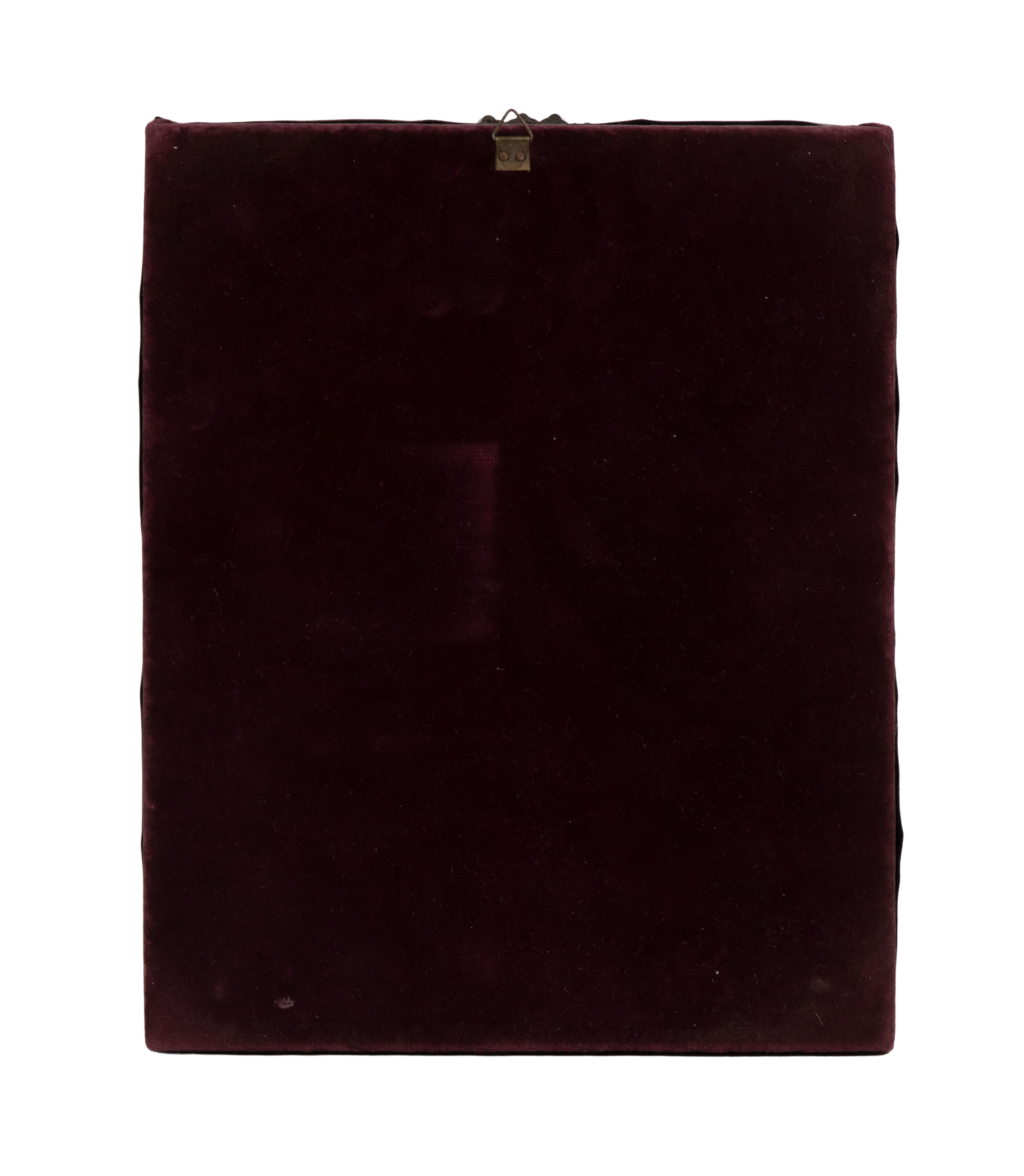 A hand painted wood panel icon of the Mother of God behind a repousse and engraved silver oklad having attached pierced repousse halo and enamel decoration, unidentified hallmarks