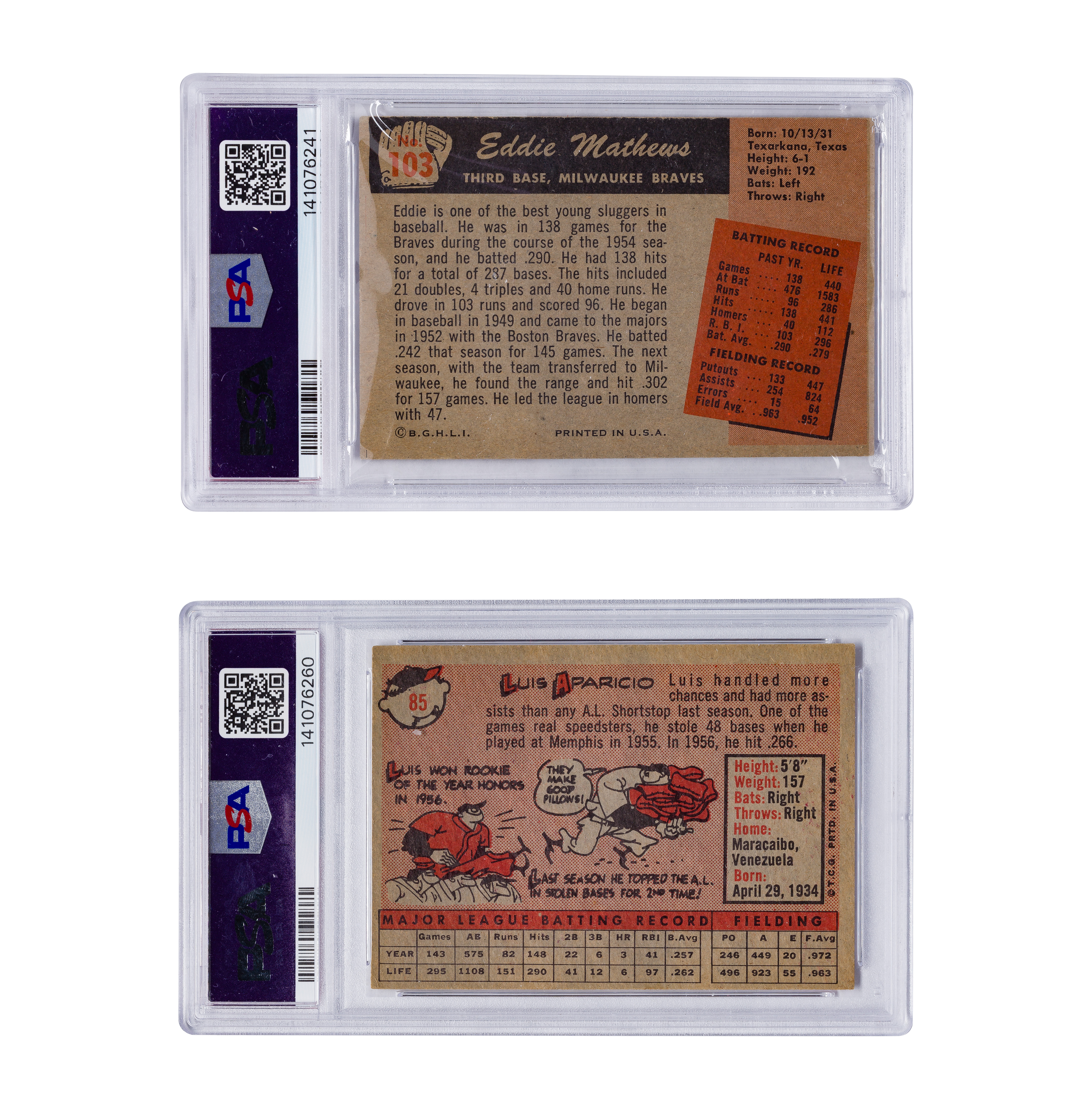 (2) items including a 1955 Bowman Eddie Mathews VG-3 PSA and a 1958 Luis Aparicio VG/EX-4 PSA, both in sealed acrylic cases having holograms