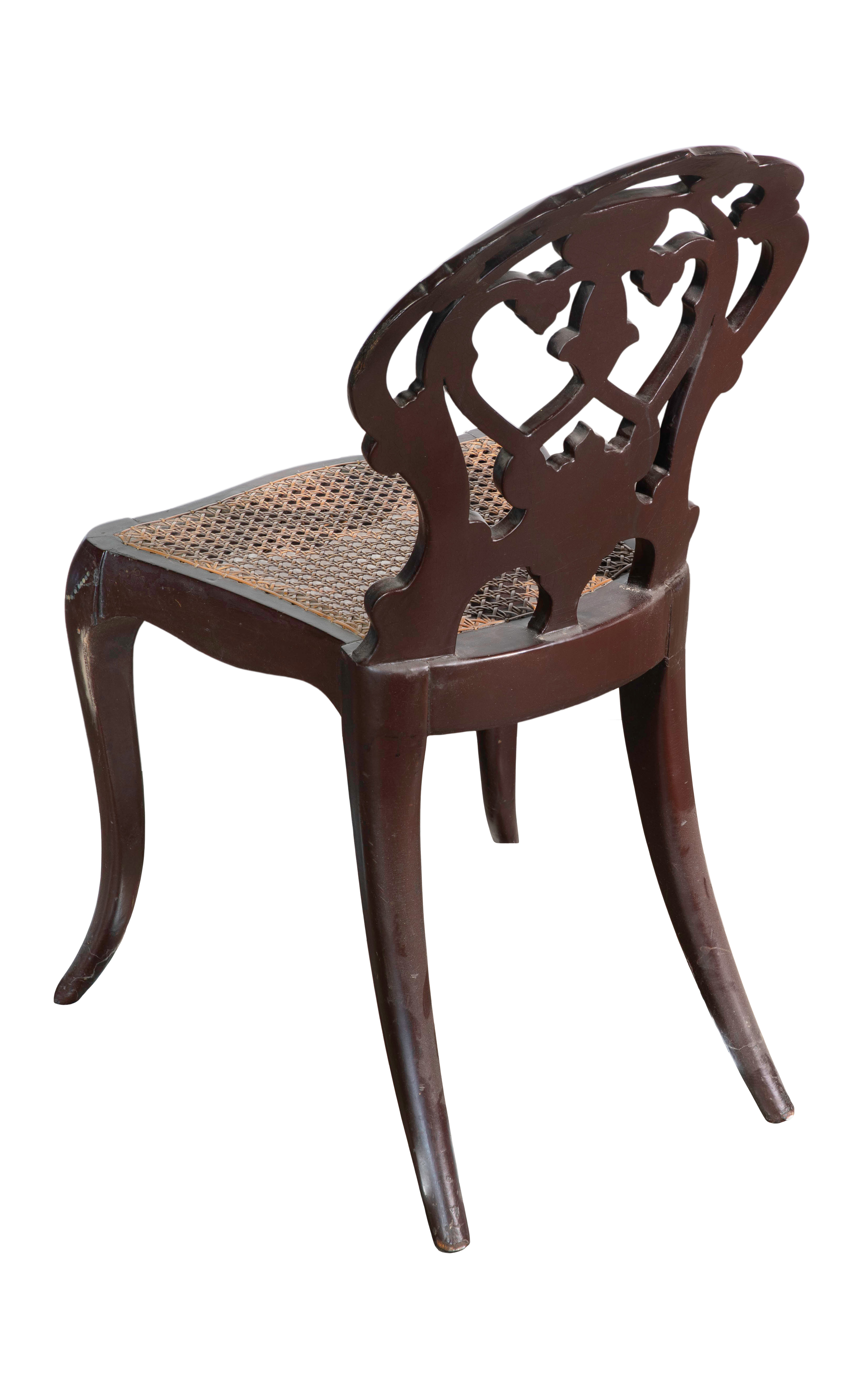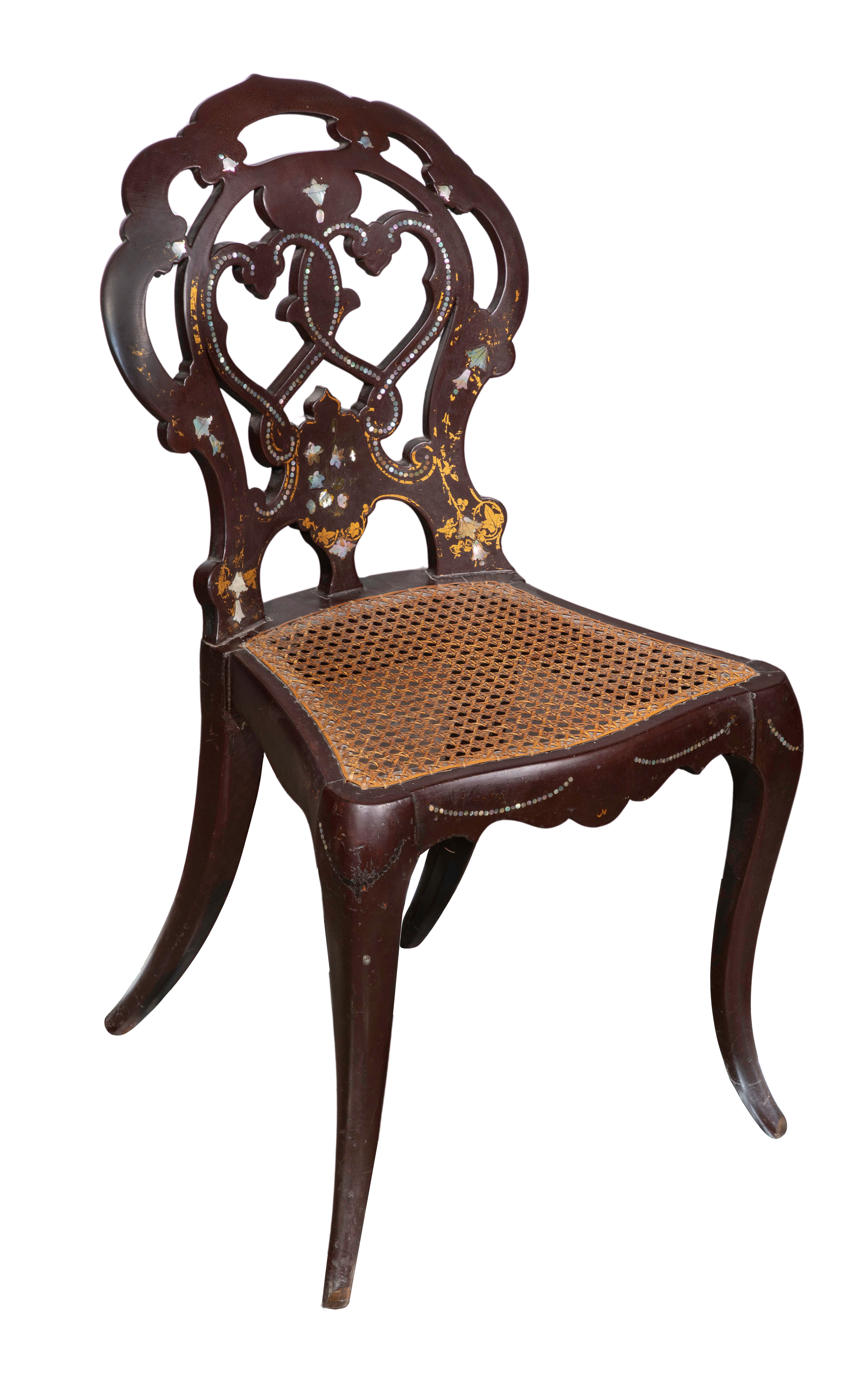 Having mother-of-pearl inlay and hand woven cane seat, remnants of gilt decoration, possibly Anglo-Indian