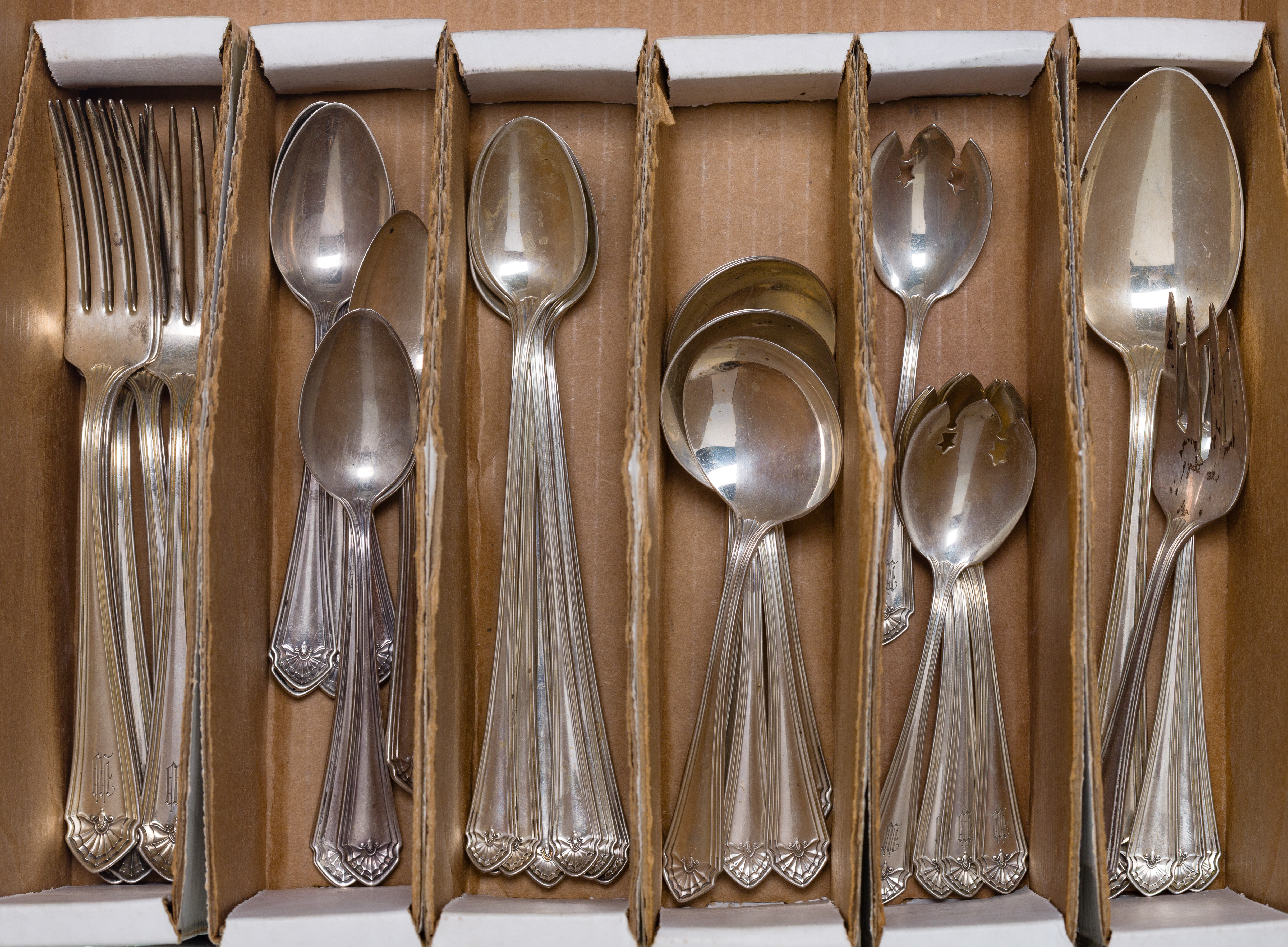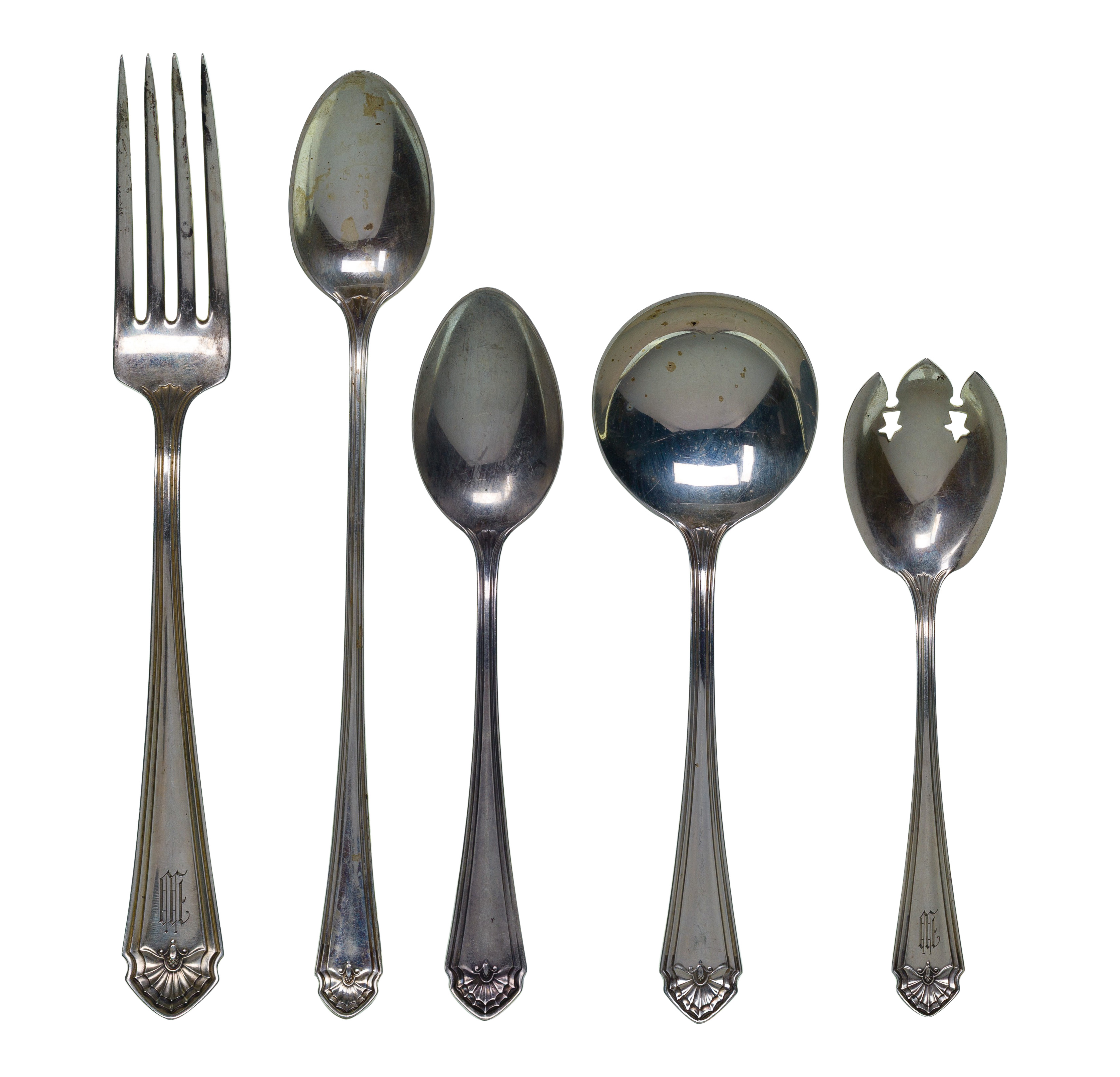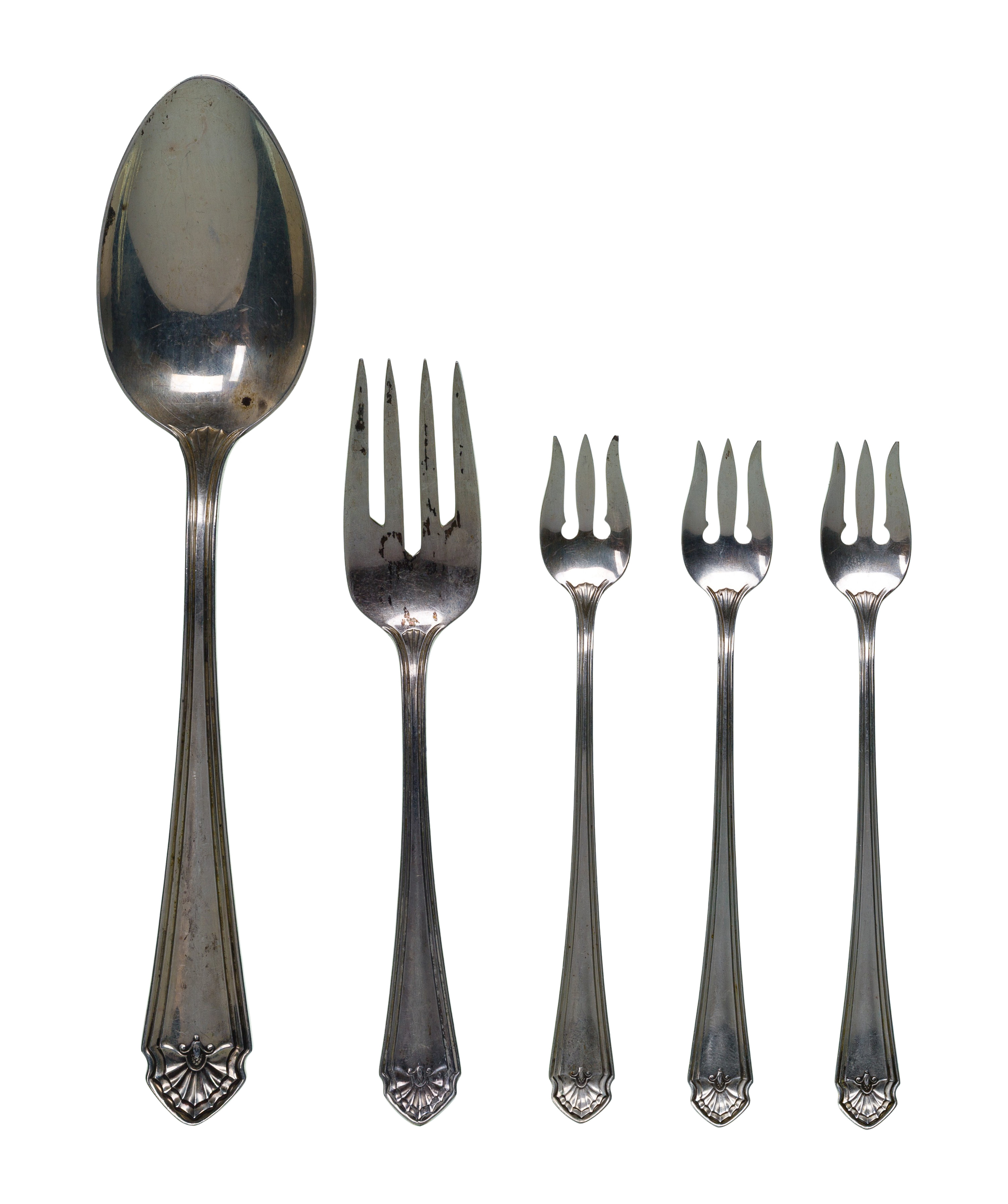 (39) items including (7) 7 1/2-inch dinner forks, (1) 6-inch salad fork, (3) 5 1/4-inch cocktail forks, (6) 5-inch ice cream forks, (8) 6-inch teaspoons, (6) 5 1/2-inch round soup spoons, (7) 7 1/4-inch iced tea spoons and (1) serving utensil (all marked ‘sterling’)