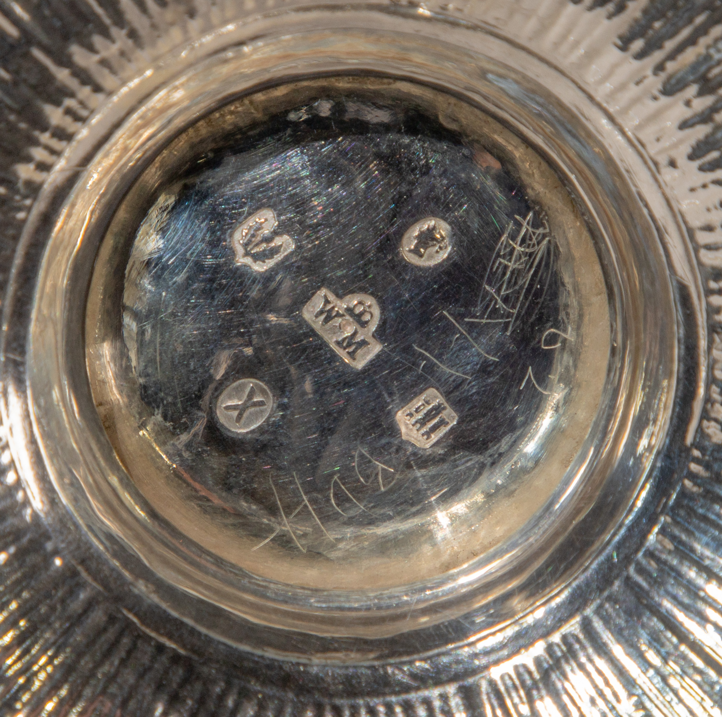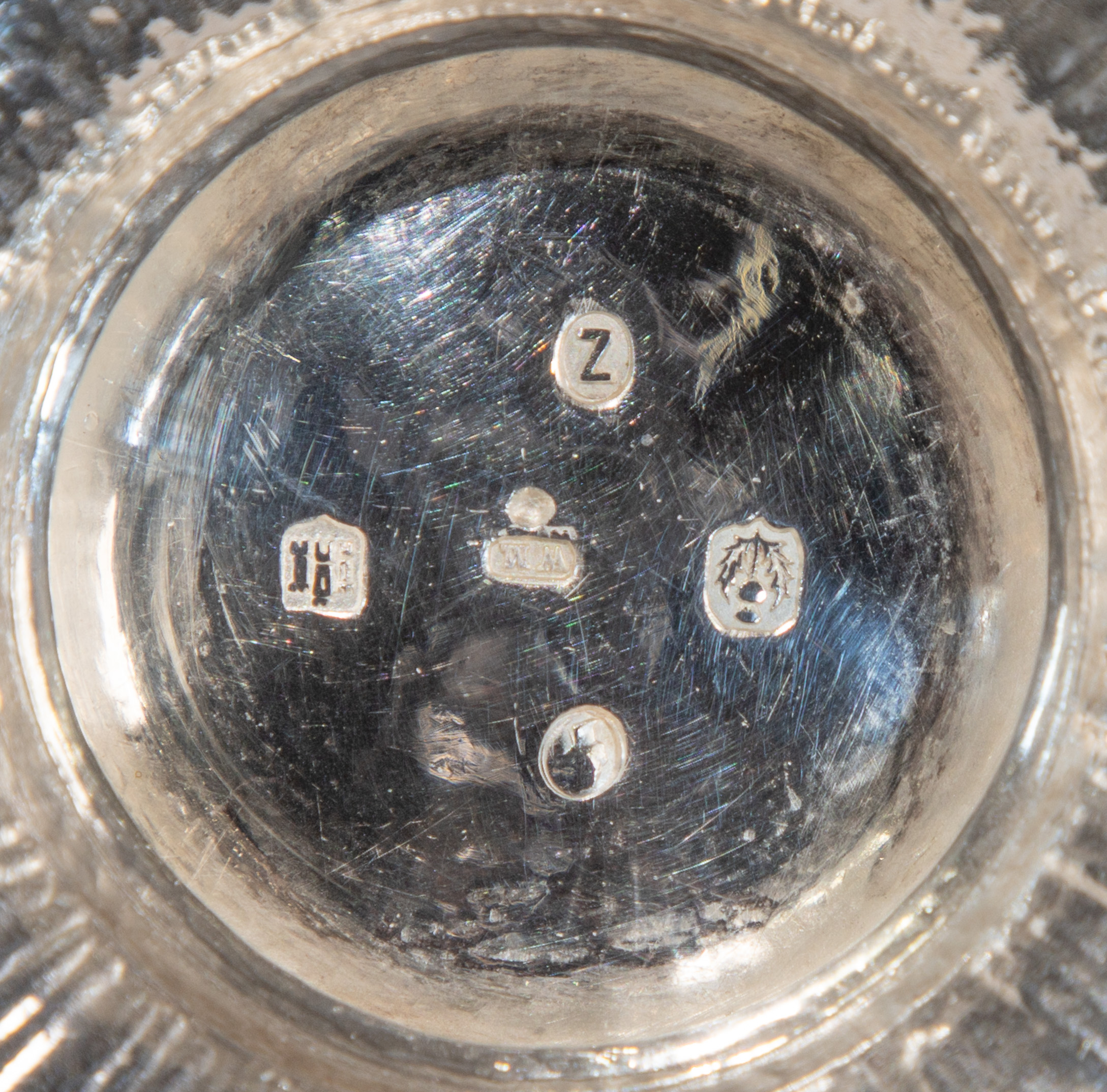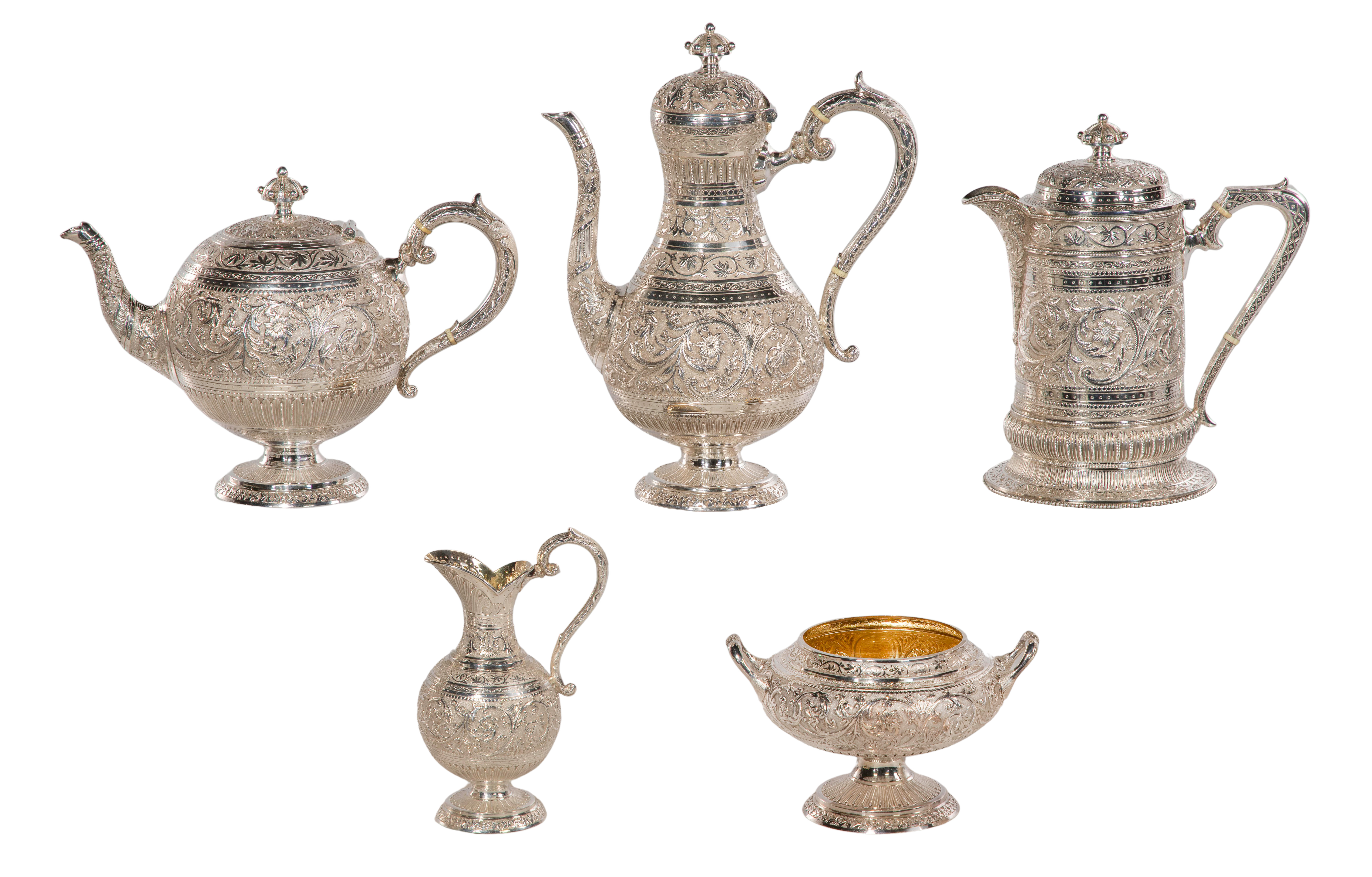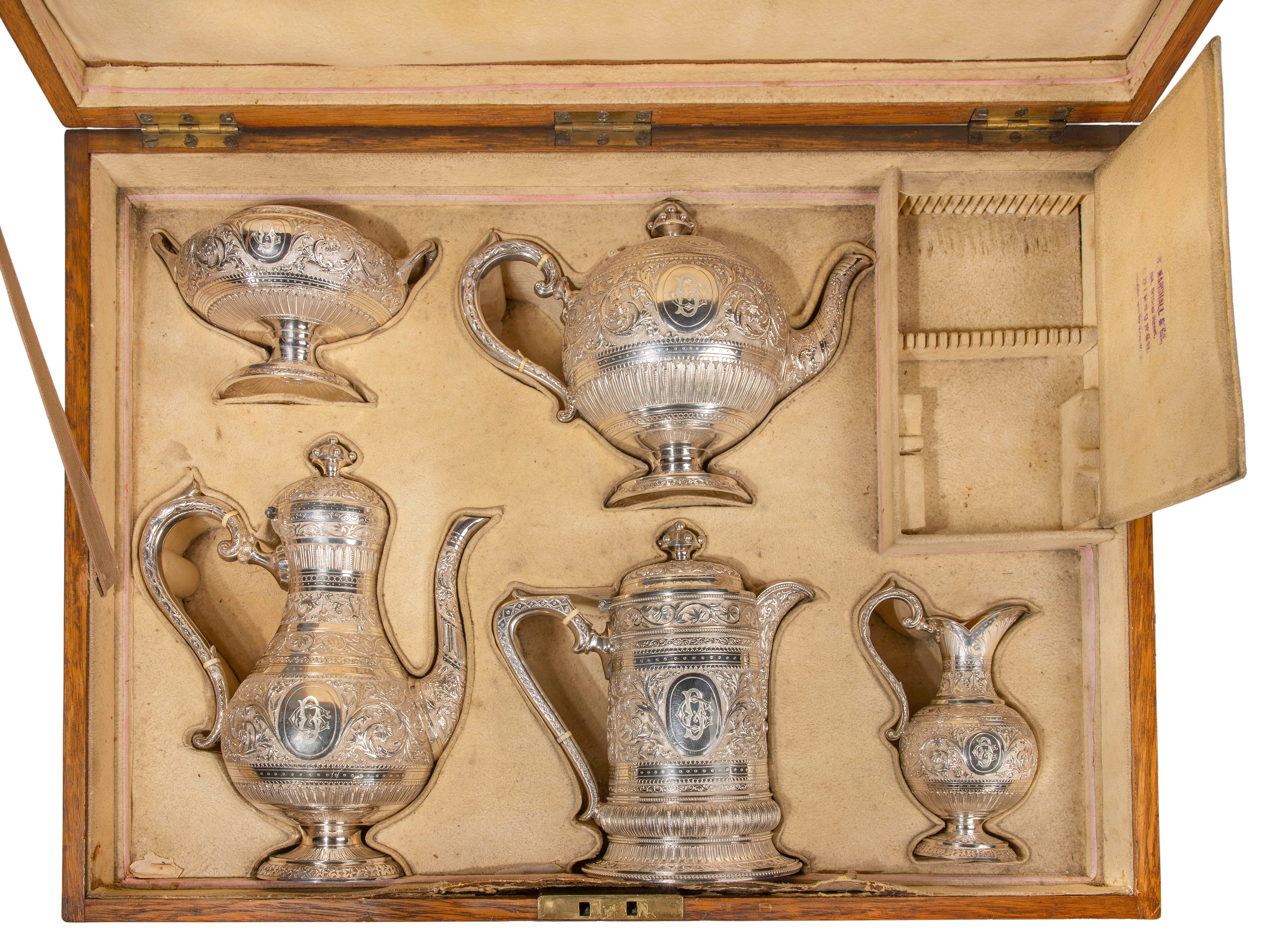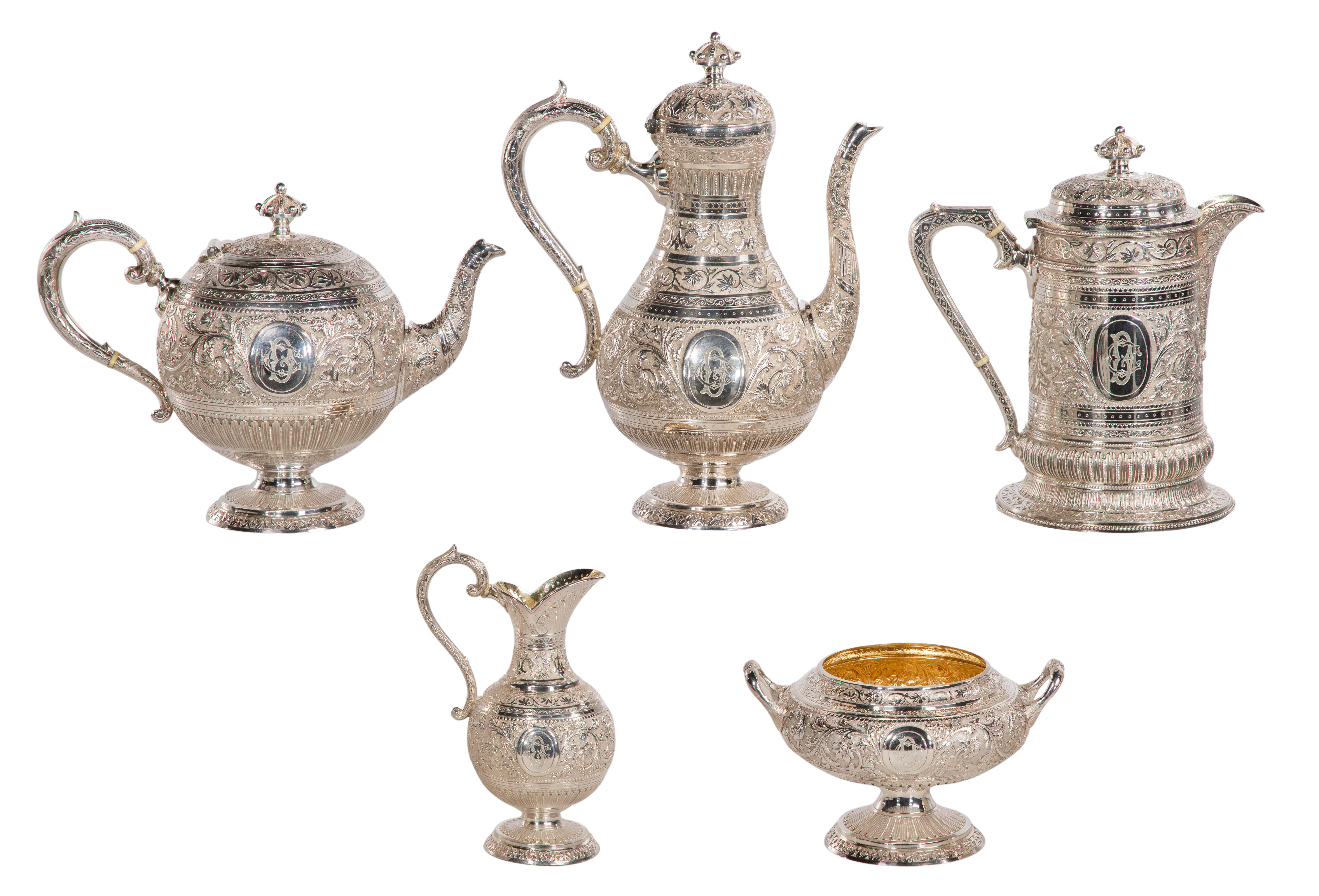 (5) items dated 1879 to 1881, including a coffee pot, teapot and a water pitcher, sugar bowl and creamer having gold-wash interior, all having ornate Victorian-era engraving, embossed panels, swirl designs, personalized monograms ‘CB’, all in a custom fitted velvet-lined wood case stamped ‘William Marshal, Edinburgh’ (all hallmarked, dated and having a lion passant)