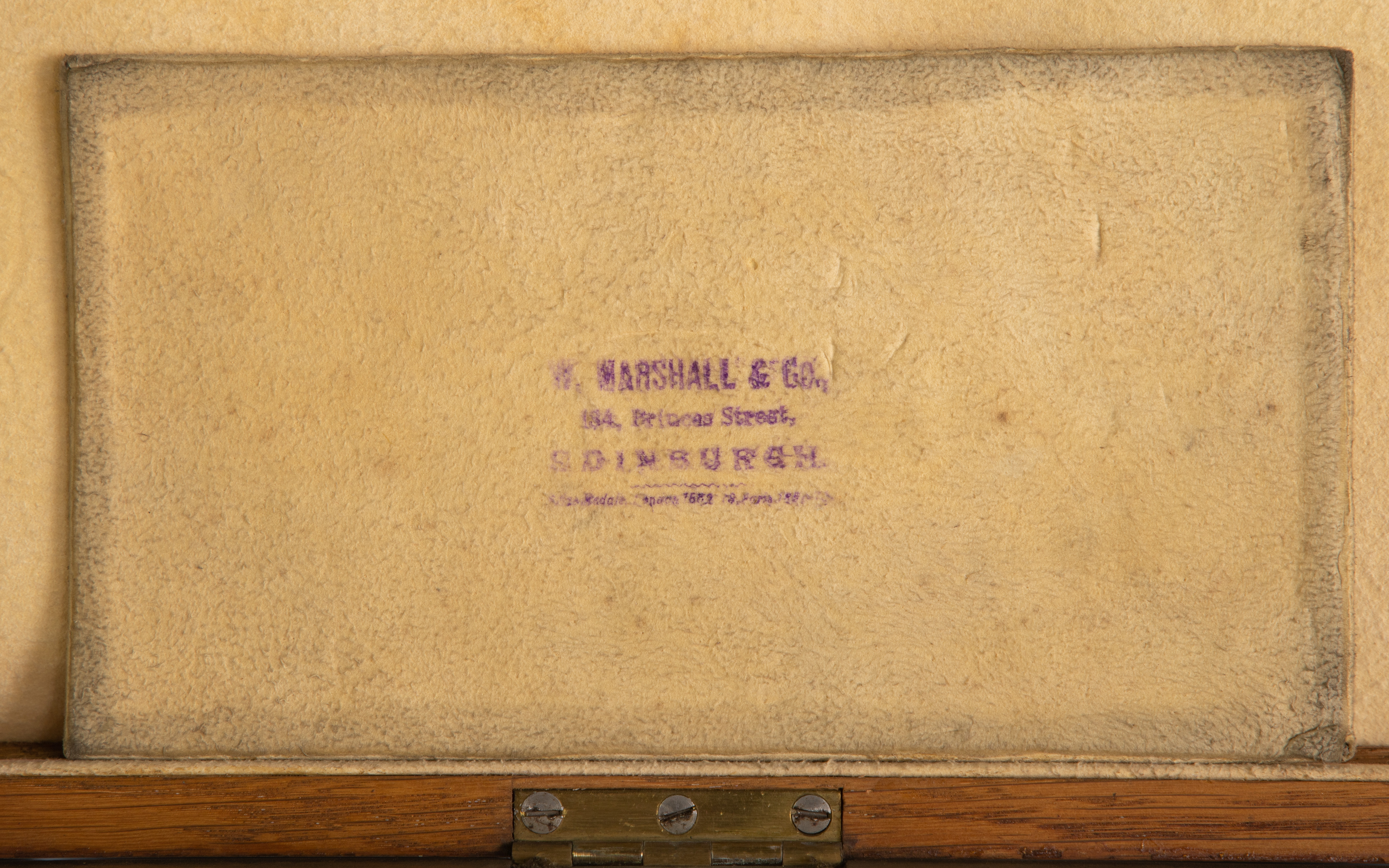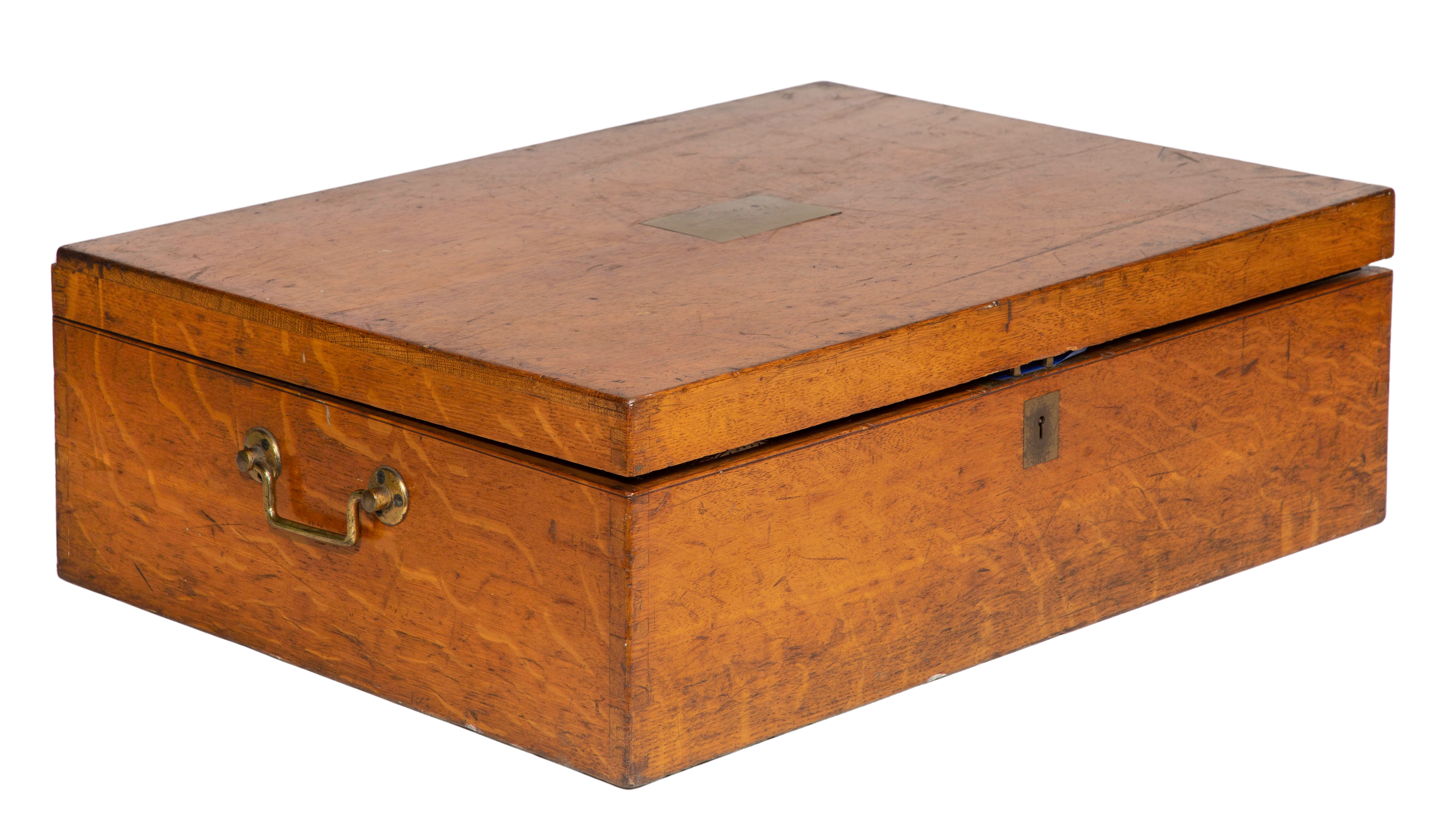 light wear, no damage noted, some may have minor tarnish and minor scratches, box having scratches, nicks, chips, top separating at back and possibly replaced, some of interior detaching from box and dirt accumulation