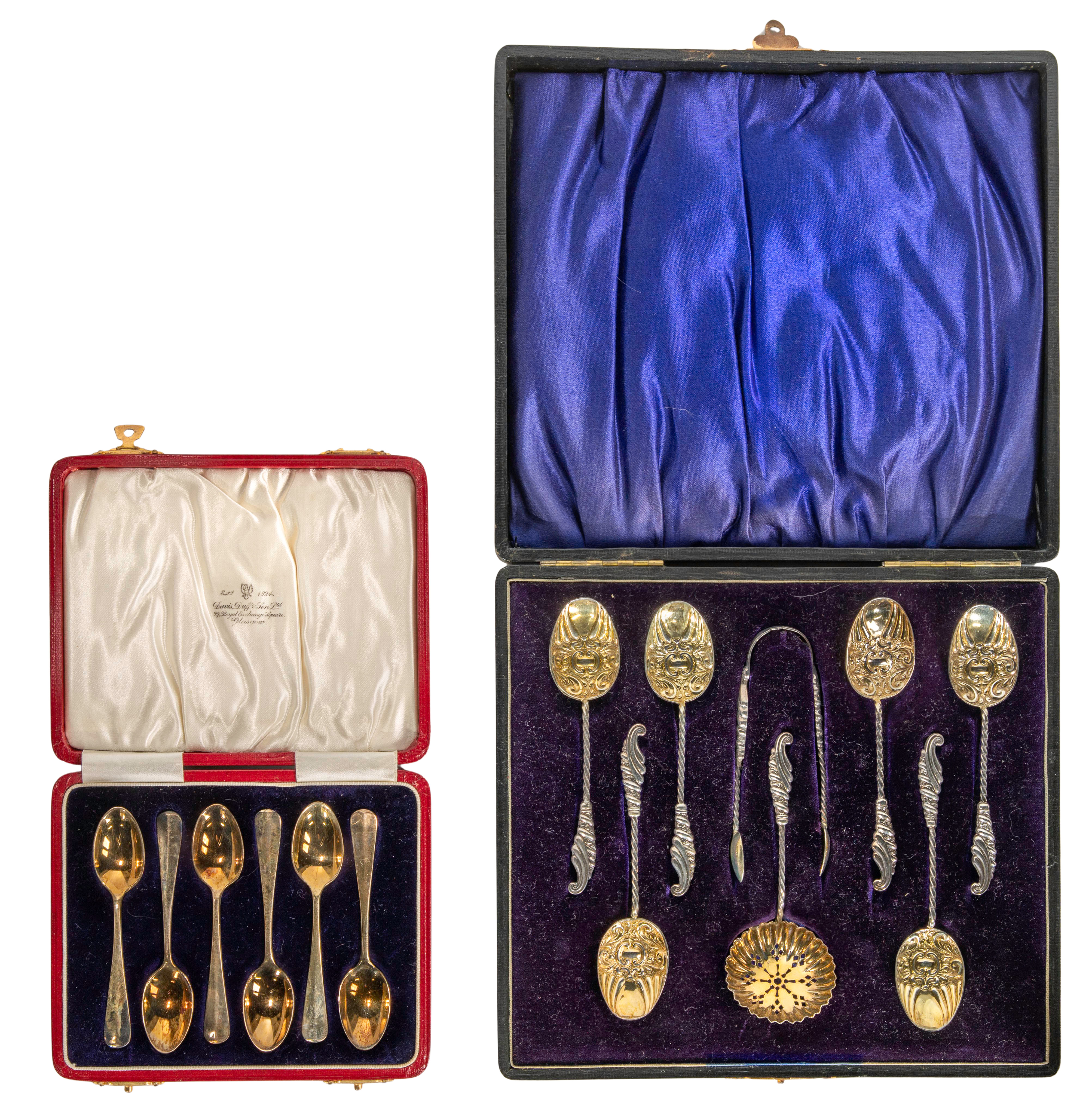 (2) cased sets of demitasse spoons including a set of (6) gold dipped by Josiah Williams & Co. and a set of (6) having gold dipped bowls, a tea strainer and sugar tongs by Blanckehsee and Sons Ltd (all marked having lion passant)