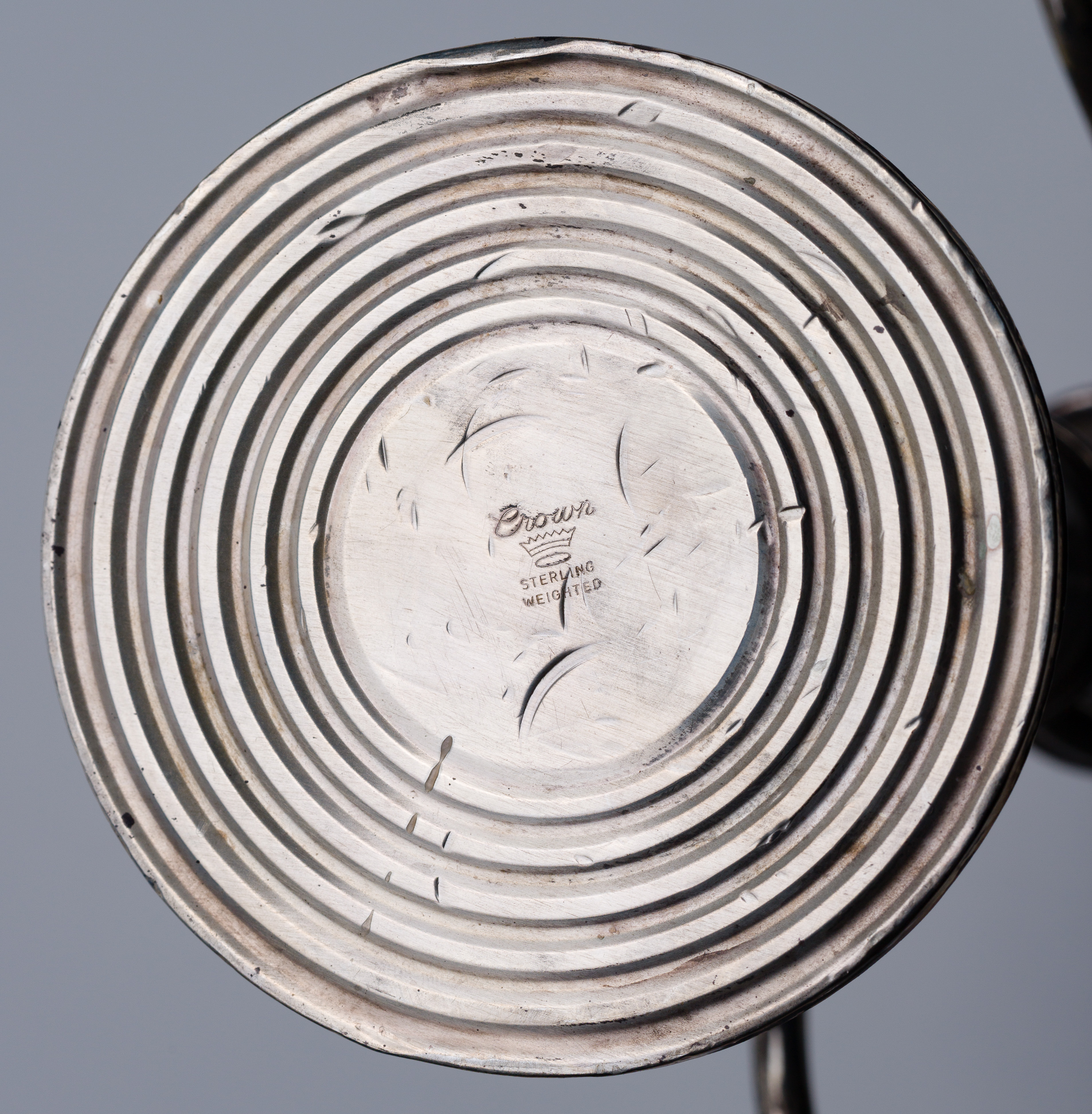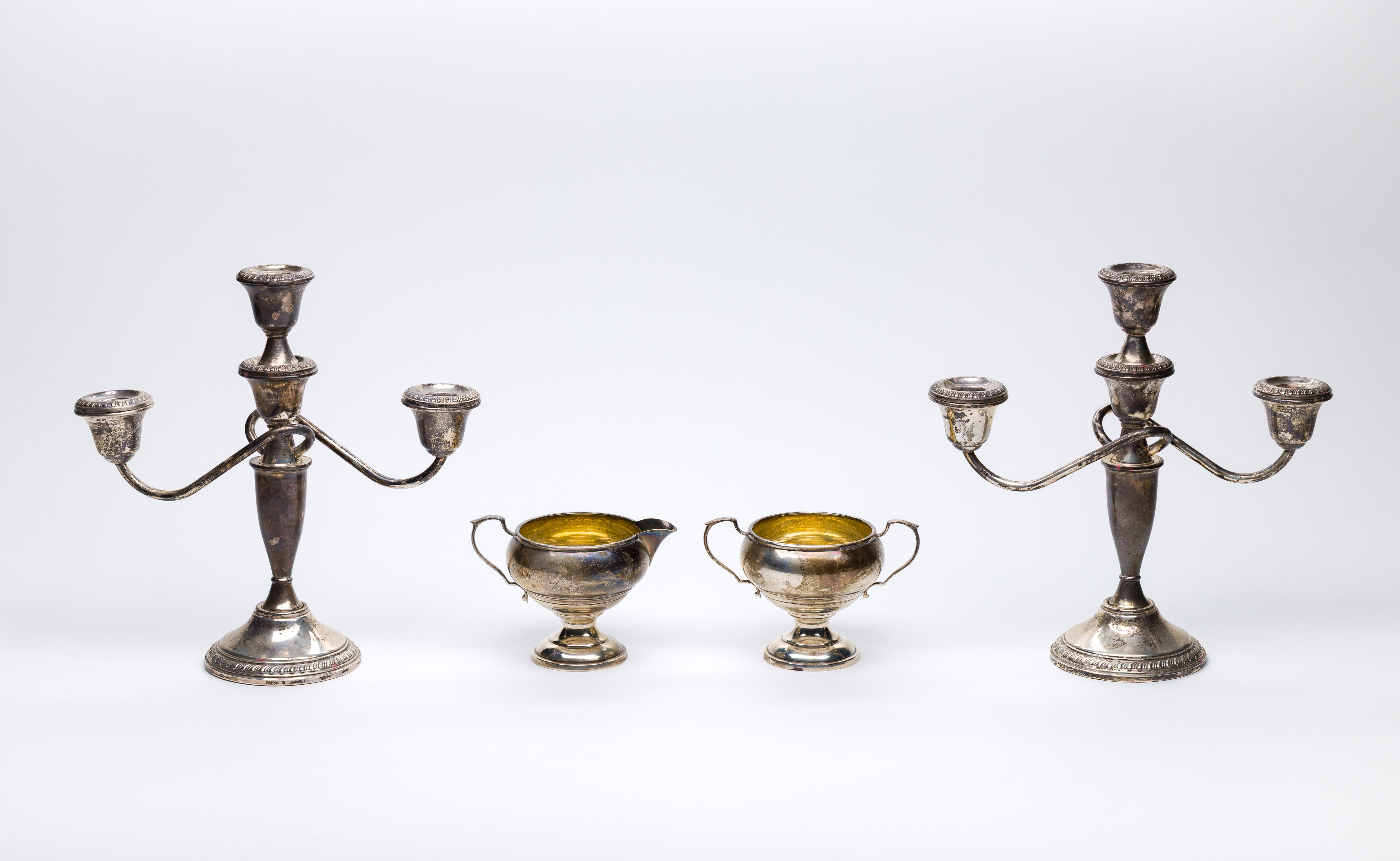 (4) items including Redlich cream and sugar bowl set and Crown weighted candelabra set (all marked ‘sterling’)