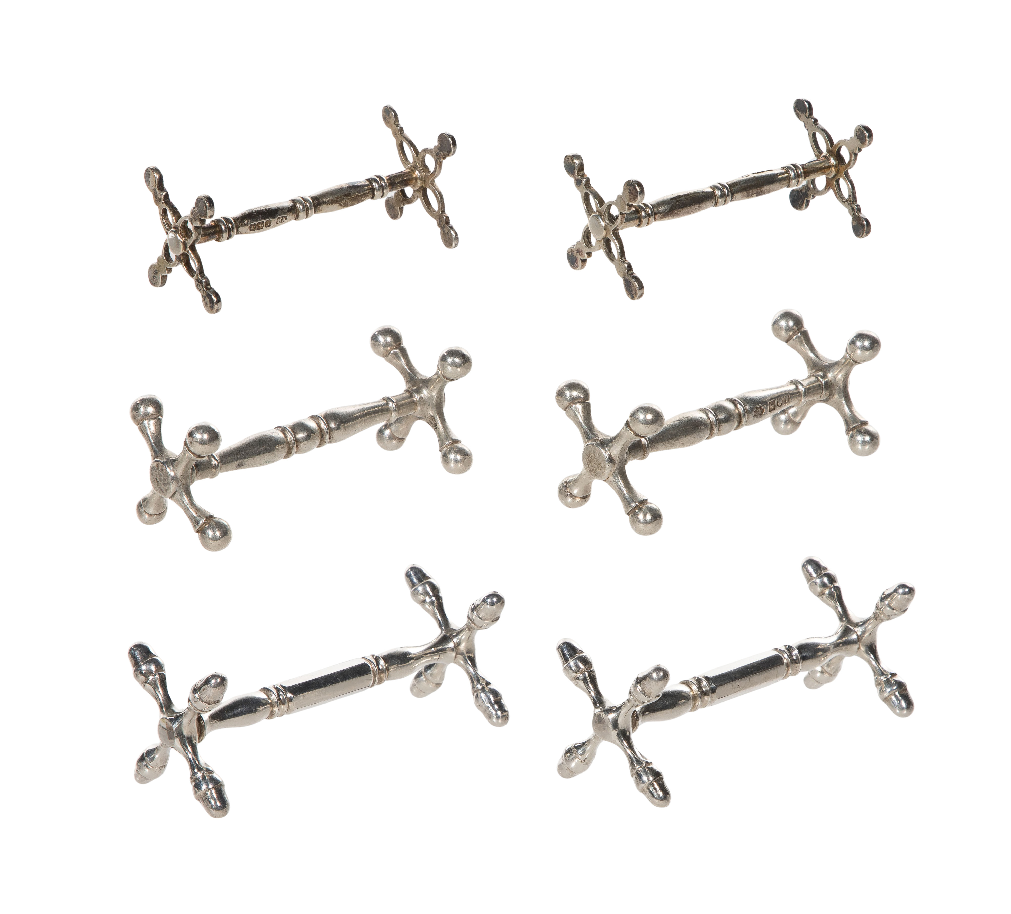 (6) items, all having a crossed-end sawbuck design including a set of (2) open work (hallmarked Harry Atkin / lion passant), a set of (2) ball end (hallmarked William Hutton and Sons / lion passant) as well as (2) unmarked acorn end (unmarked 0.900)