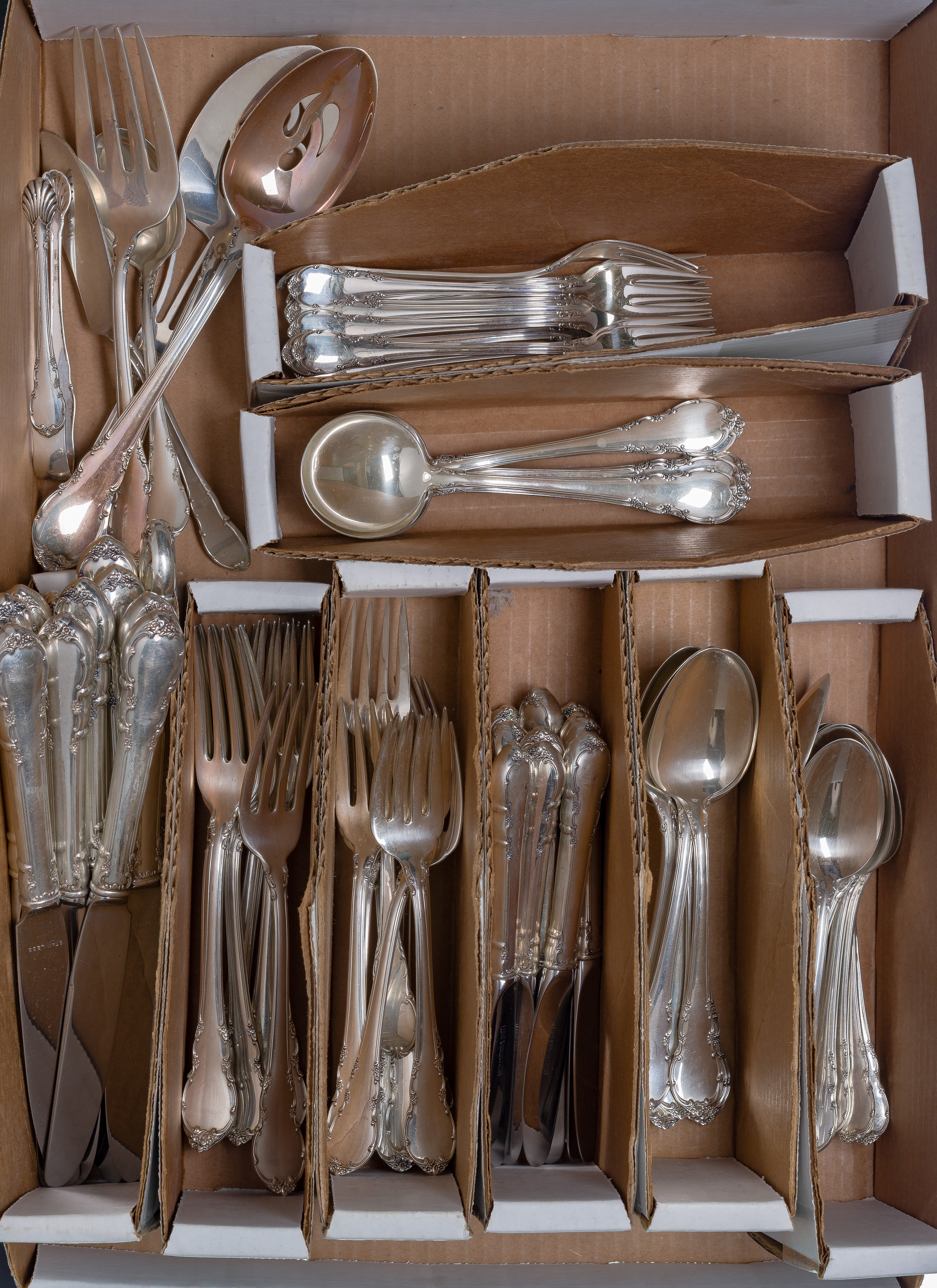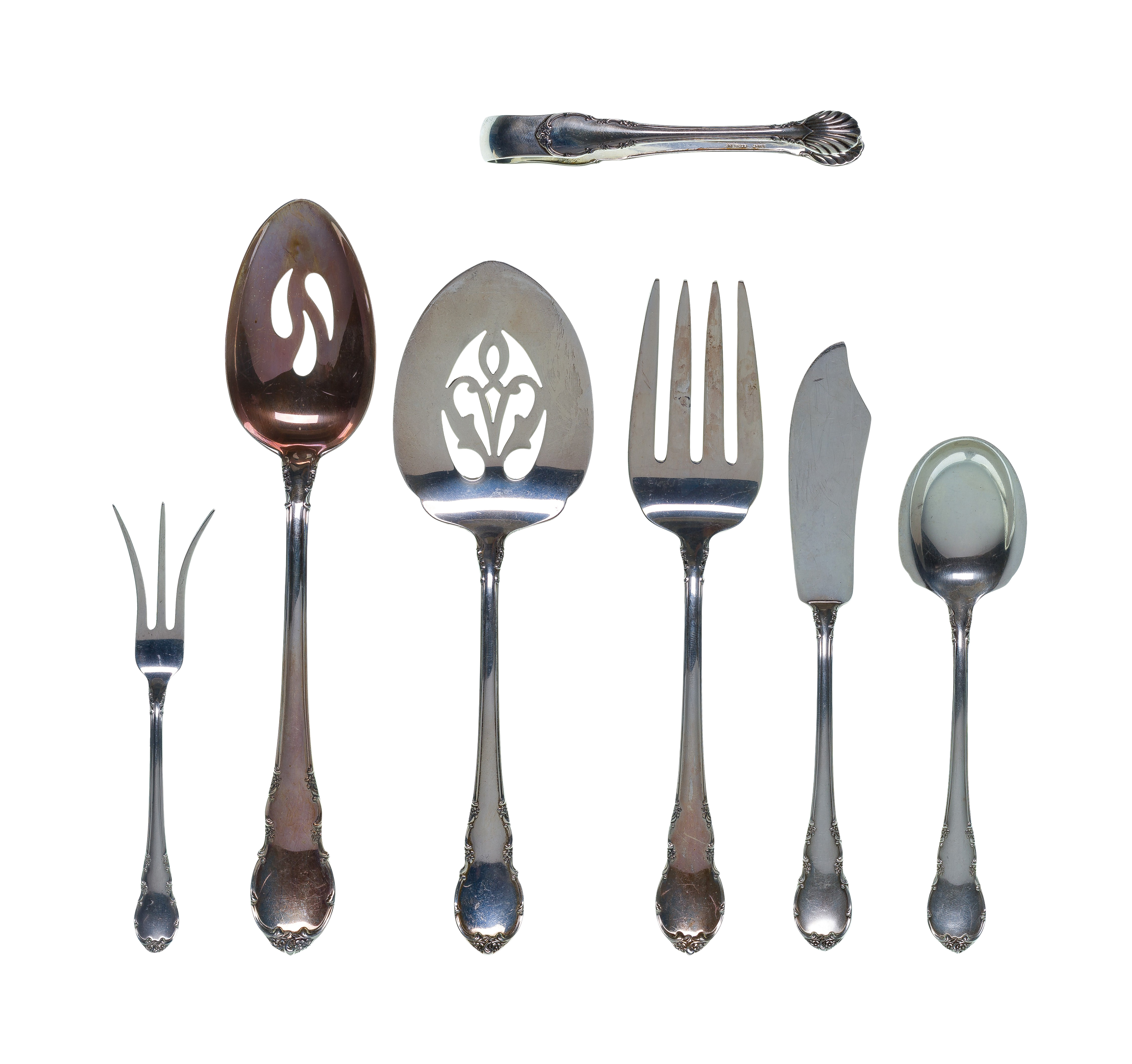 (99) items including (12) 8 3/4-inch dinner knives, (12) 6 1/4-inch weighted butter knives, (12) 7 1/4-inch dinner forks, (12) 6 3/8-inch salad forks, (12) 6-inch cocktail forks, (12) 6-inch teaspoons, (8) 6 3/8-inch round soup spoons, (12) 6 3/8-inch oval soup spoons and (7) serving utensils (all marked ‘sterling’)