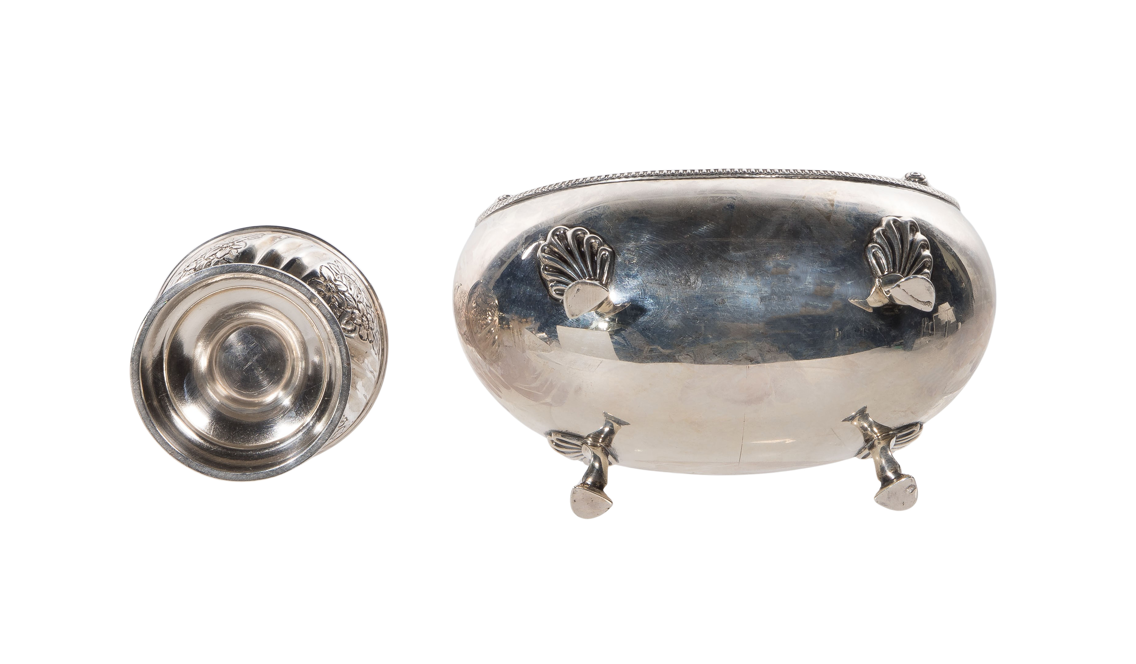 (2) items including a sugar caster by Harrison Bros. and Houson and an oval boat form footed bowl having faint hallmark (both having lion passant)