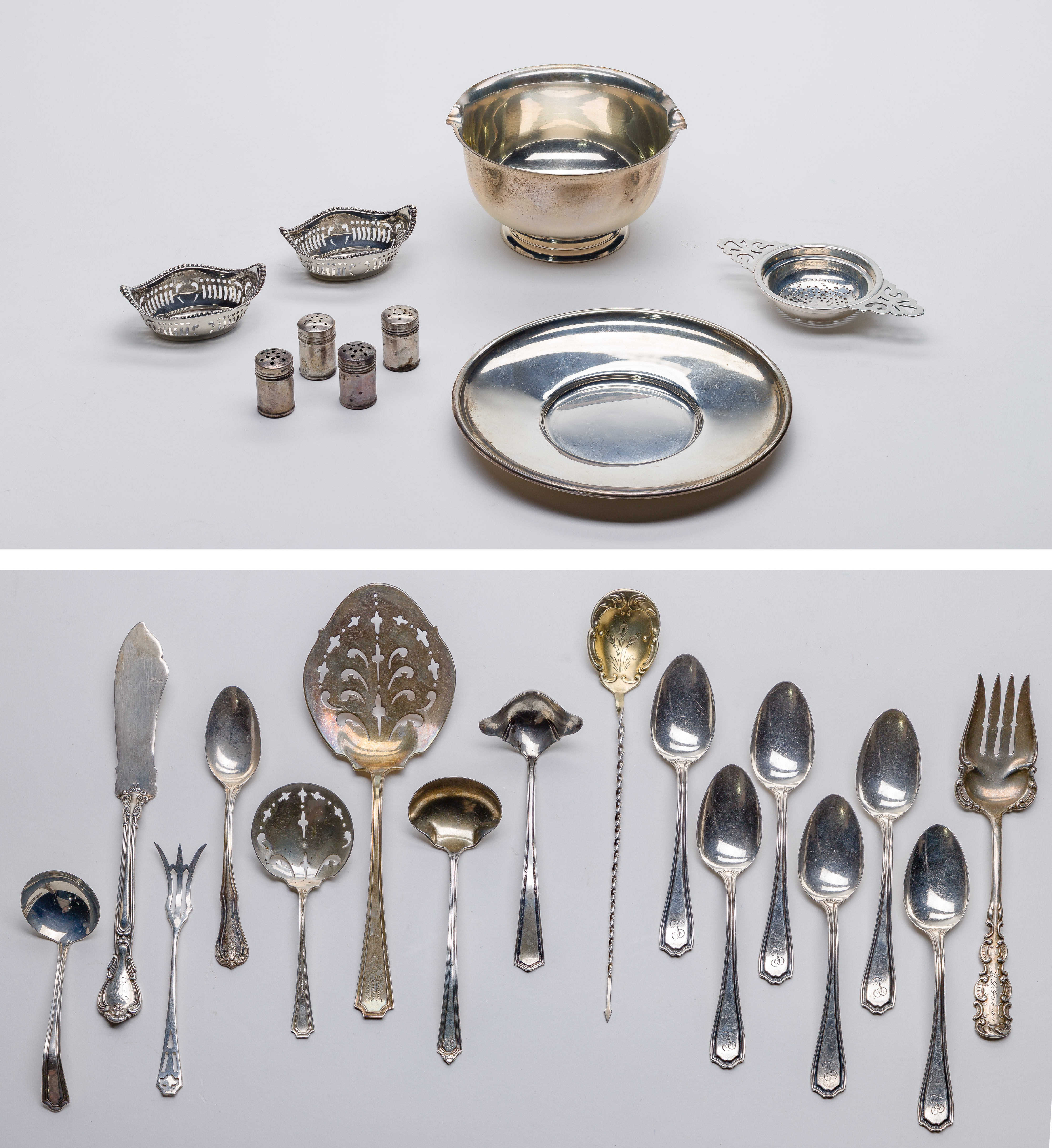 (25) items including a sauce bowl and saucer, a tea strainer, spoons, a butter knife, forks and salt and pepper shakers (all marked ‘sterling’ / ‘925’)