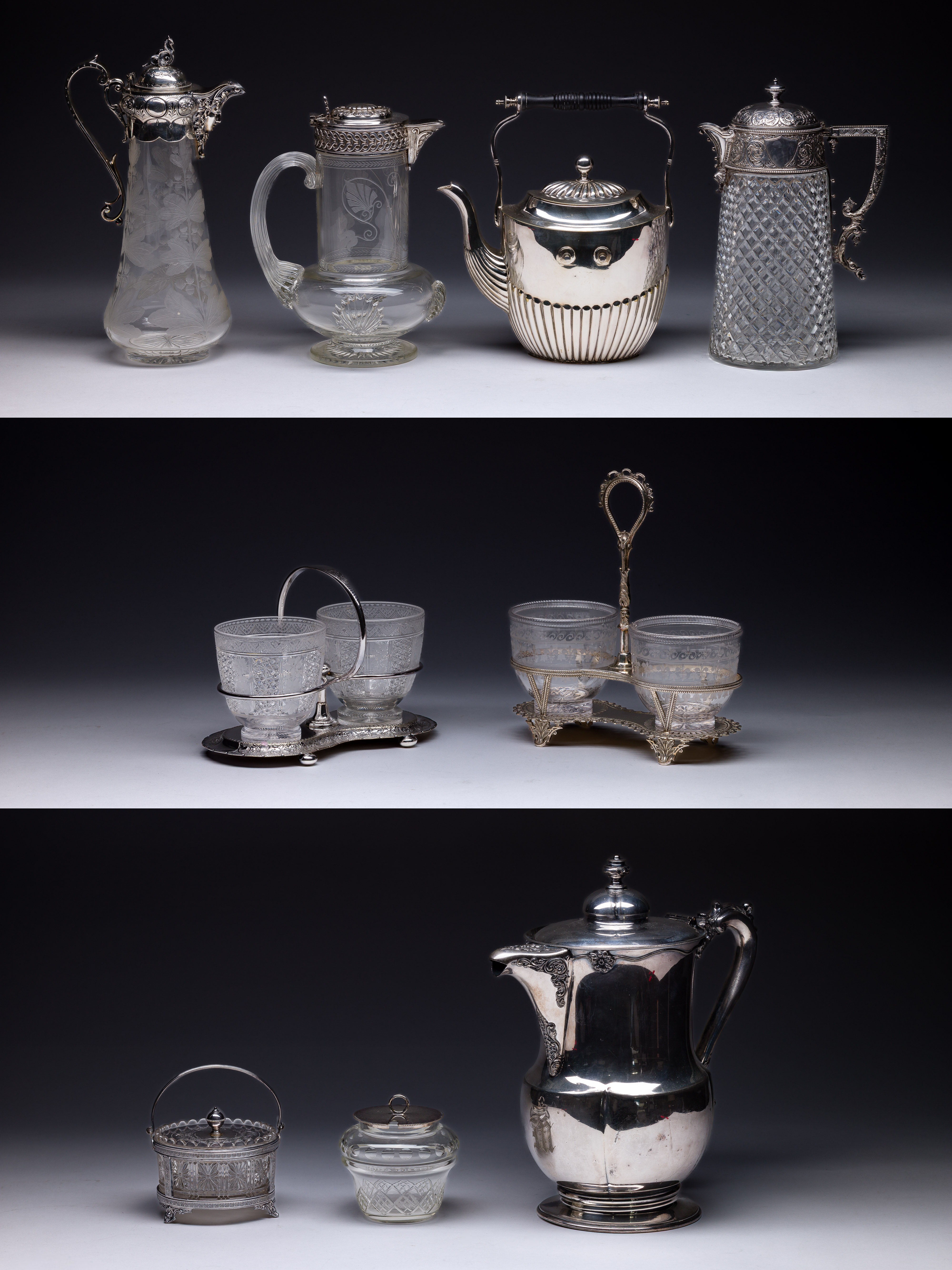 (9) items including a water pitcher, (2) etched glass flagons, a cut glass flagon, (2) condiment caddies, each having trays, two cut and etched glass bowls, a hot water pot and (2) pressed glass lidded jars