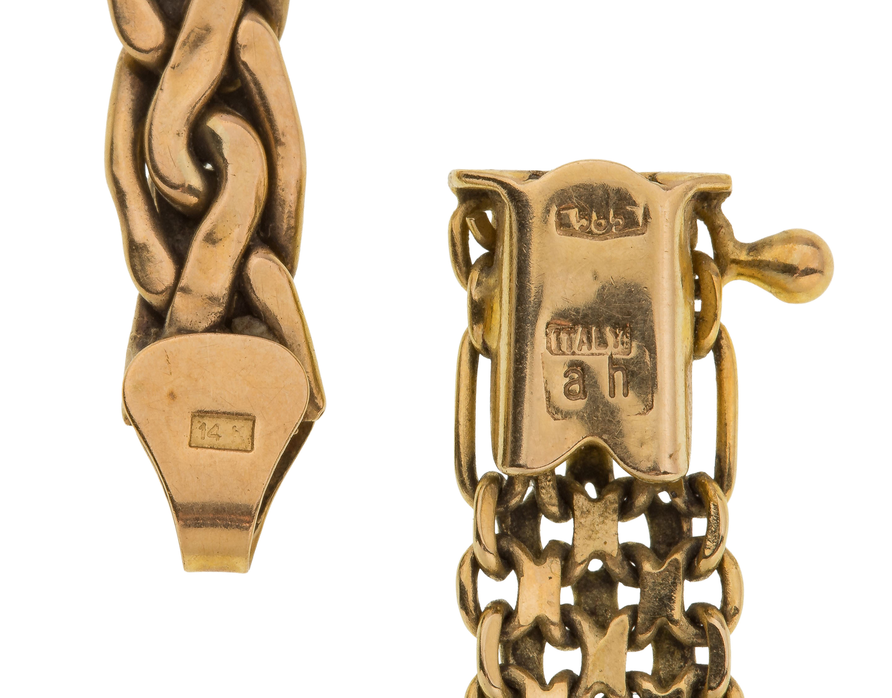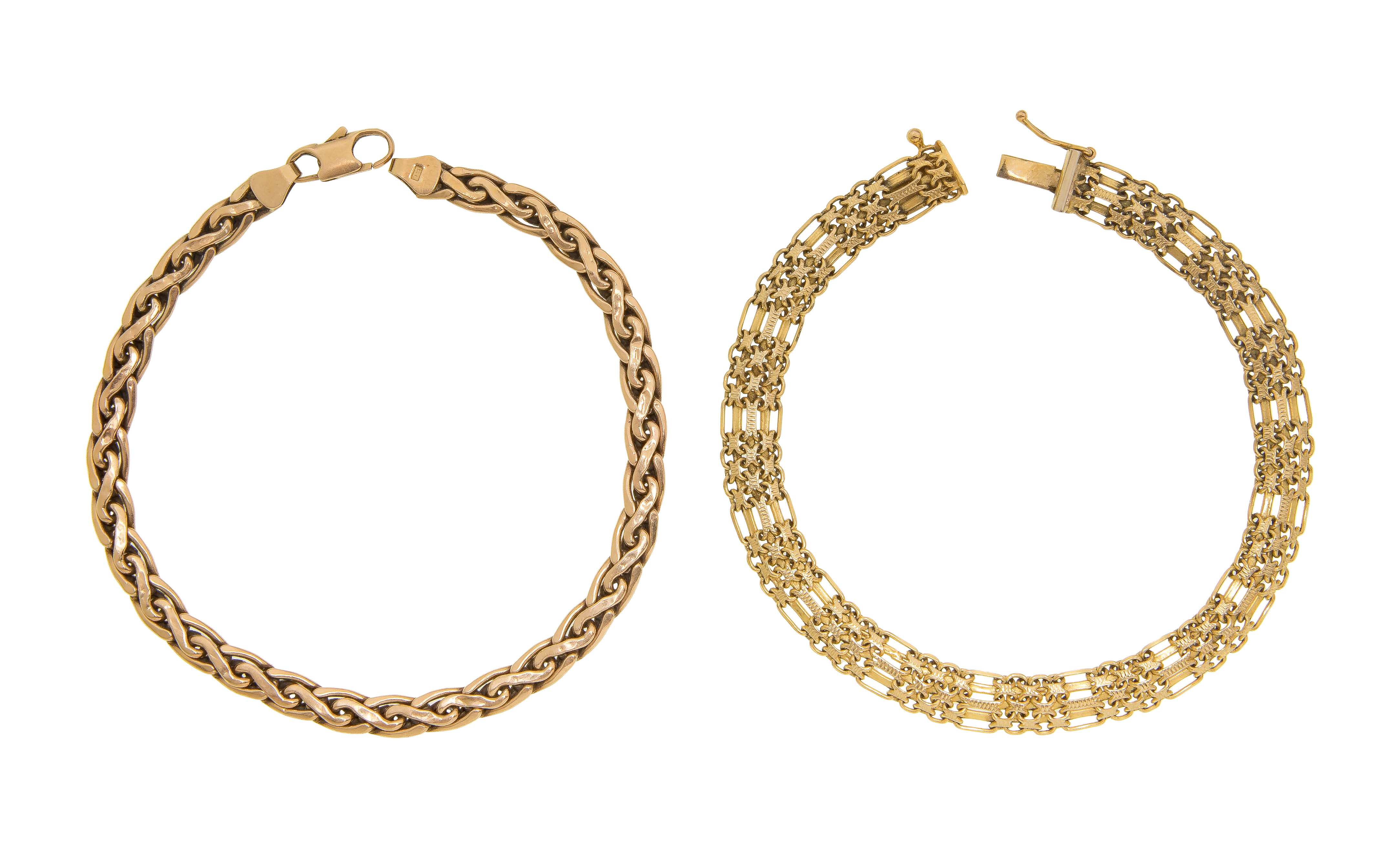 (2) items including a Byzantine style link and a woven bar and panel style link (marked ’14k’ / ‘585’)