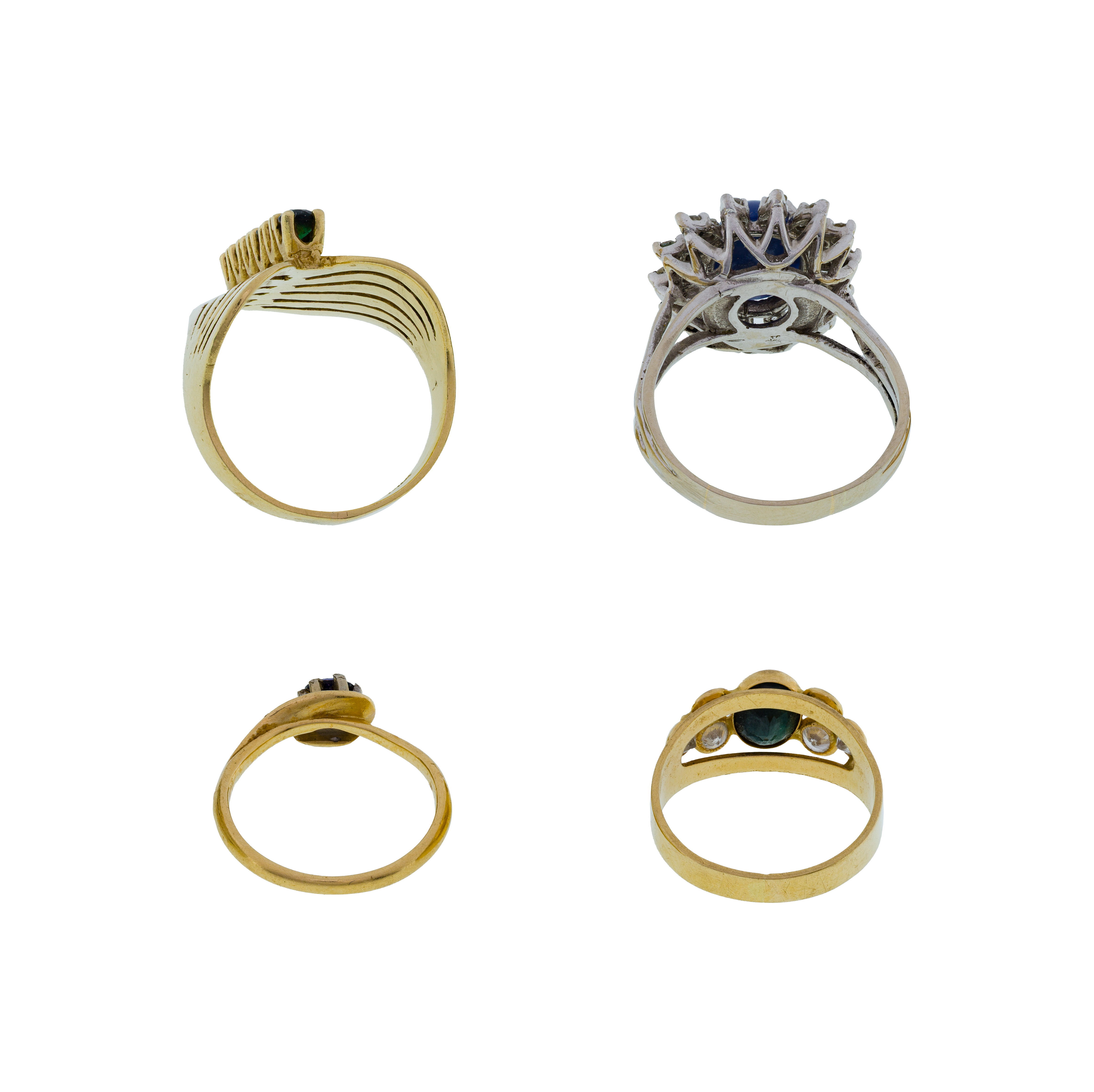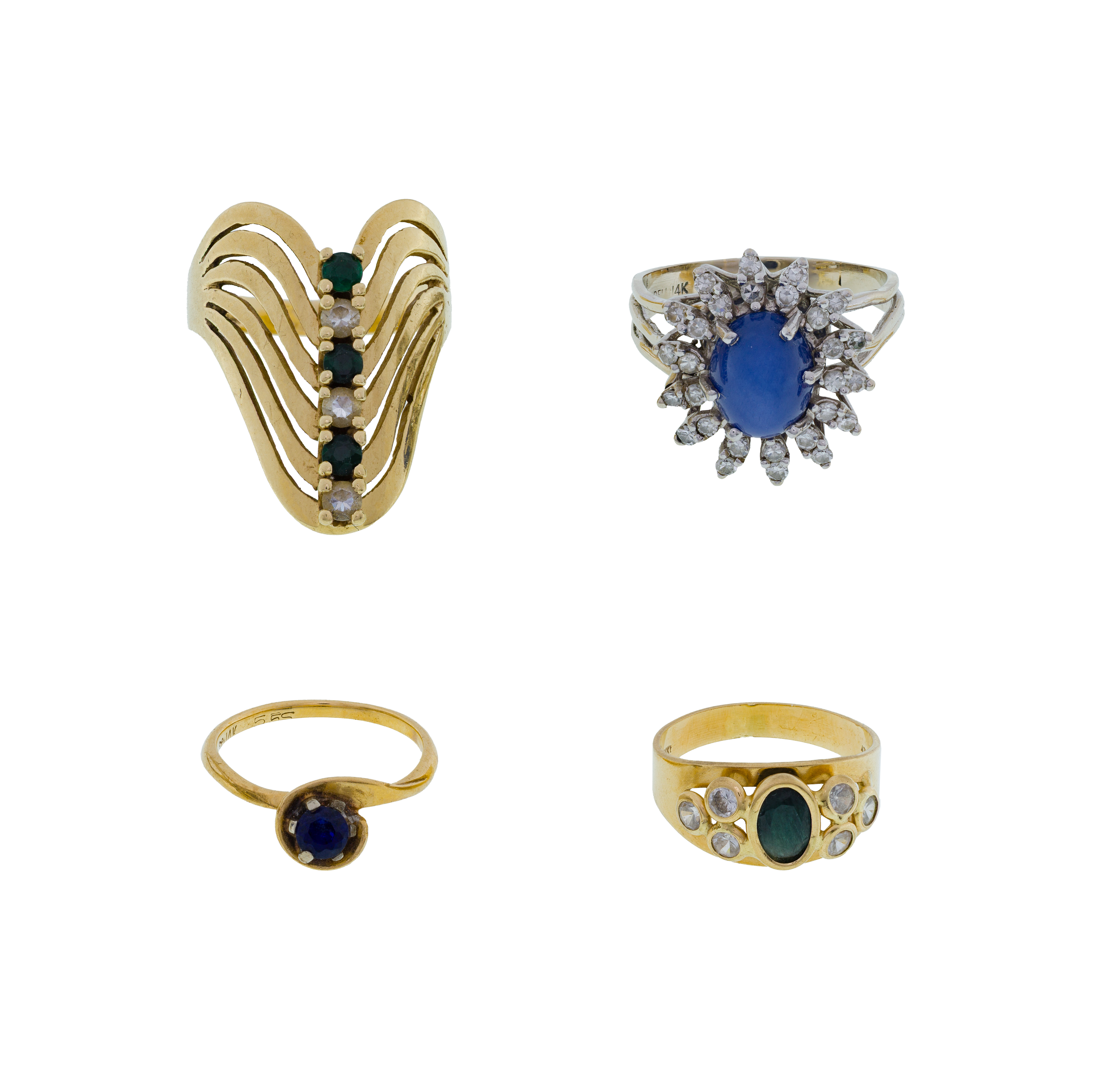 (4) items including a V-shaped emerald and diamond modern cocktail ring, a solitaire sapphire, an oval cut sapphire in a bezel setting flanked by diamond accents and an oval cut star sapphire surrounded by round cut diamond accents (most marked ’14k’)