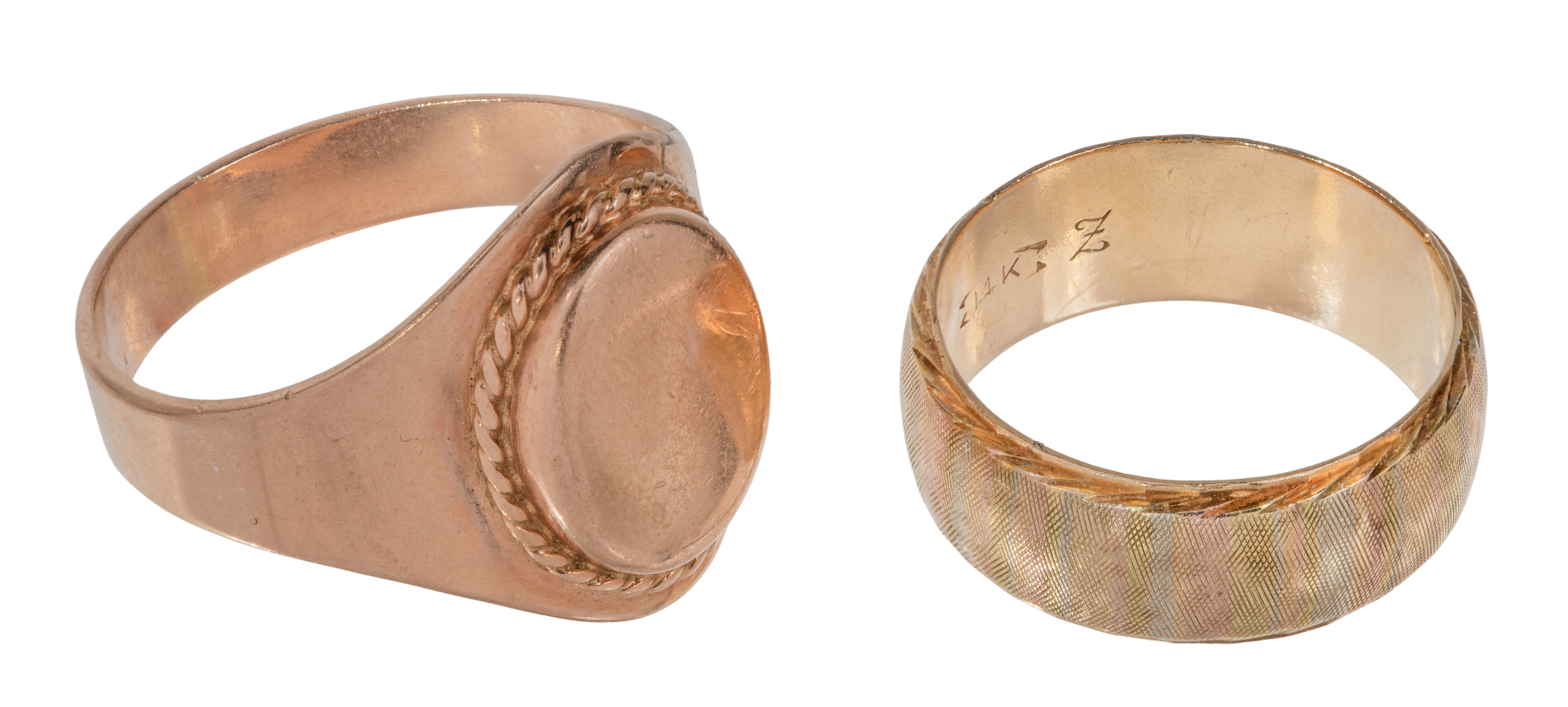 (2) items including a tri-color gold band and a rose gold signet style (marked ’14k’ / ‘583’)