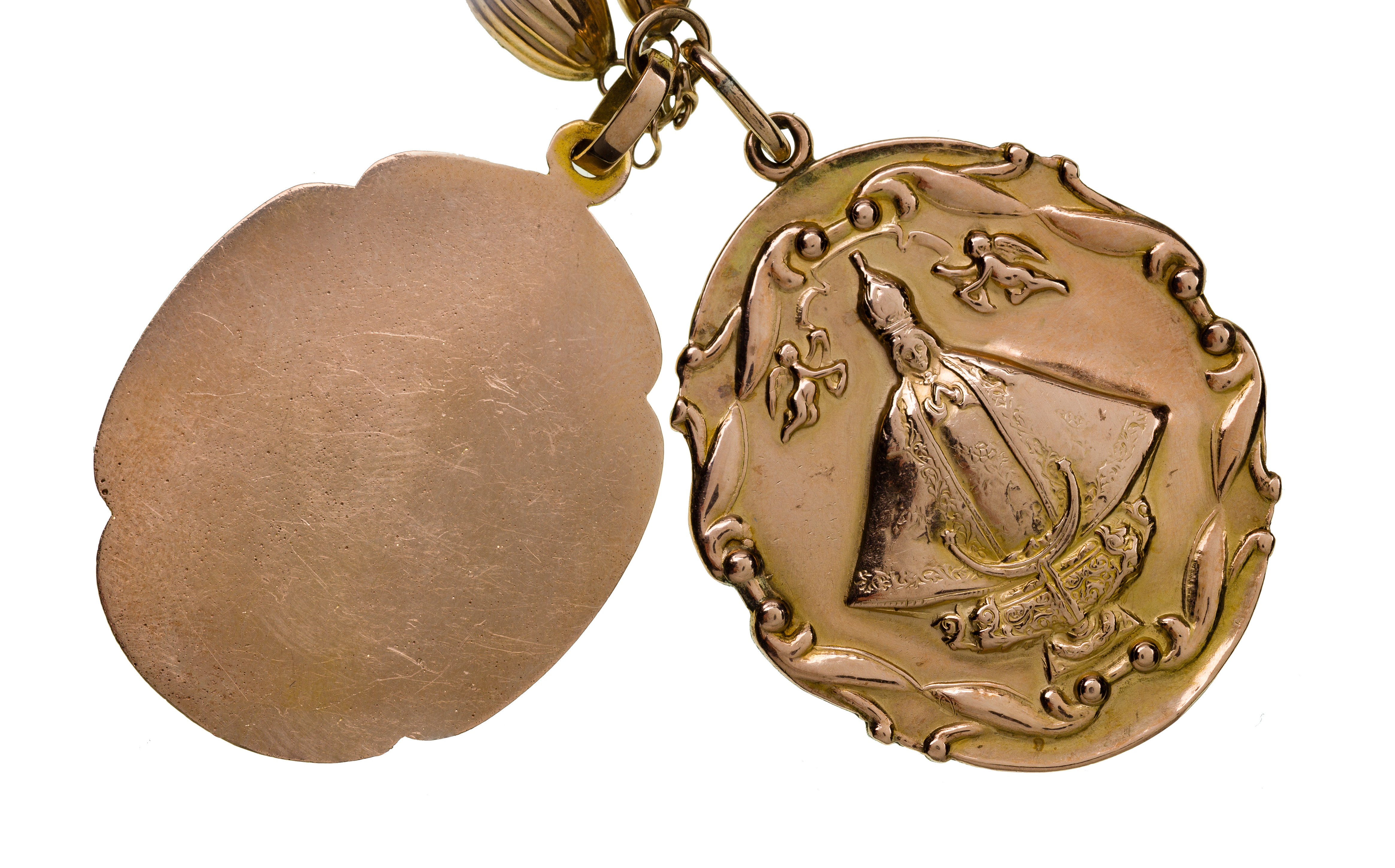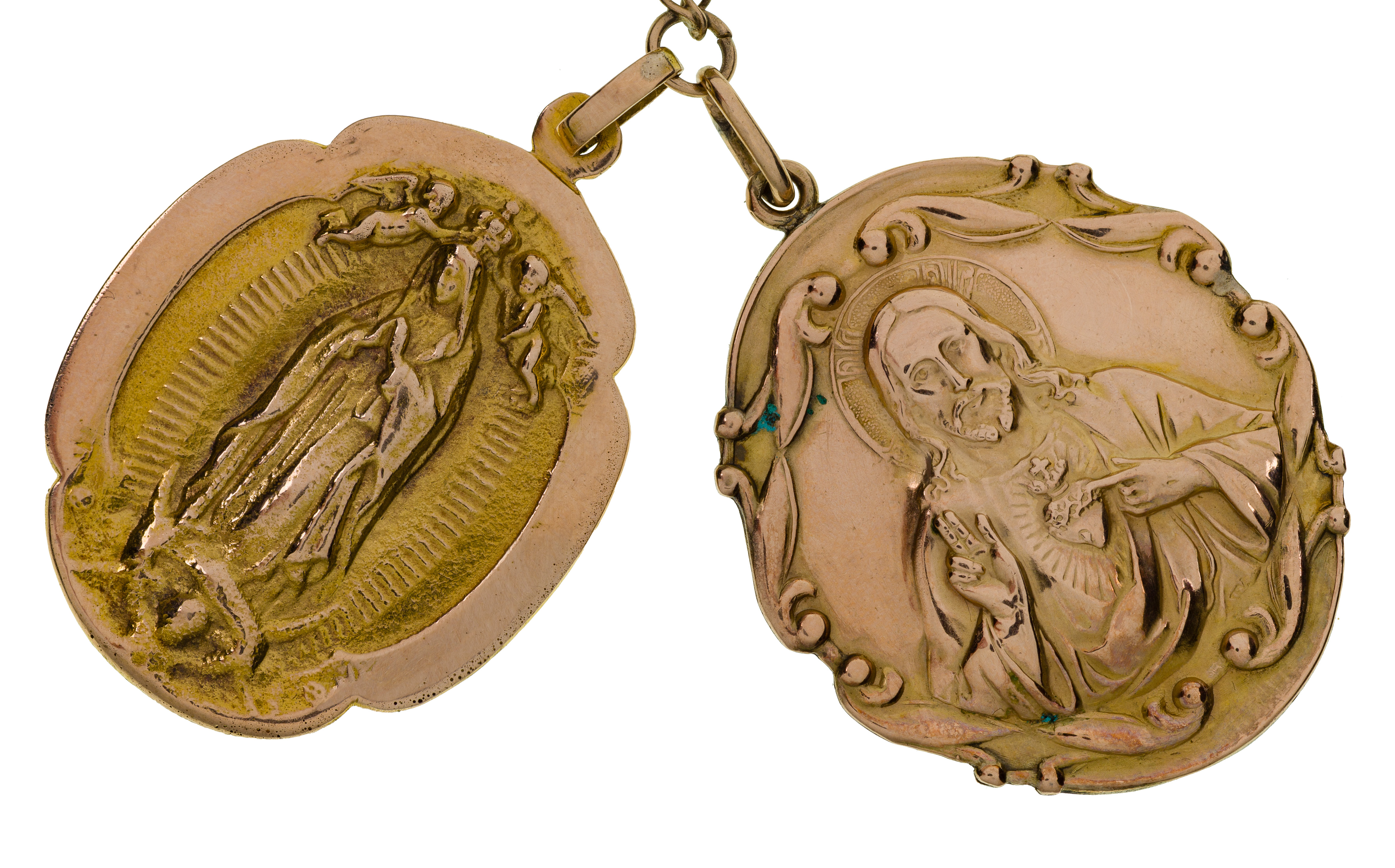 (2) miraculous medals / pendants on a necklace having fluted elongated beads (necklace marked ’10k’, pendants unmarked 10k)