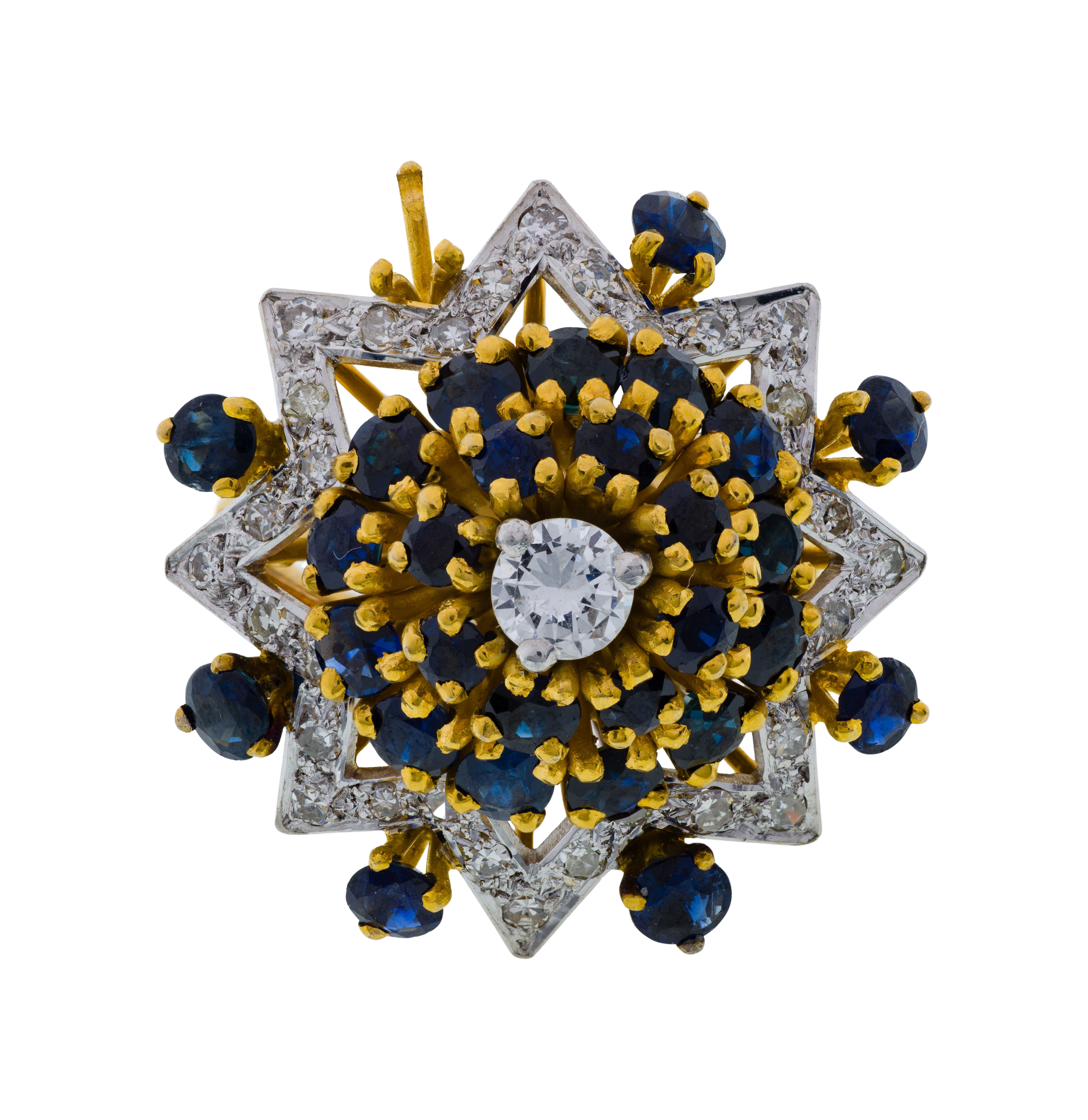 A domed cocktail ring having a center diamond surrounded by tiers of sapphires and a diamond accented star (unmarked 18k)