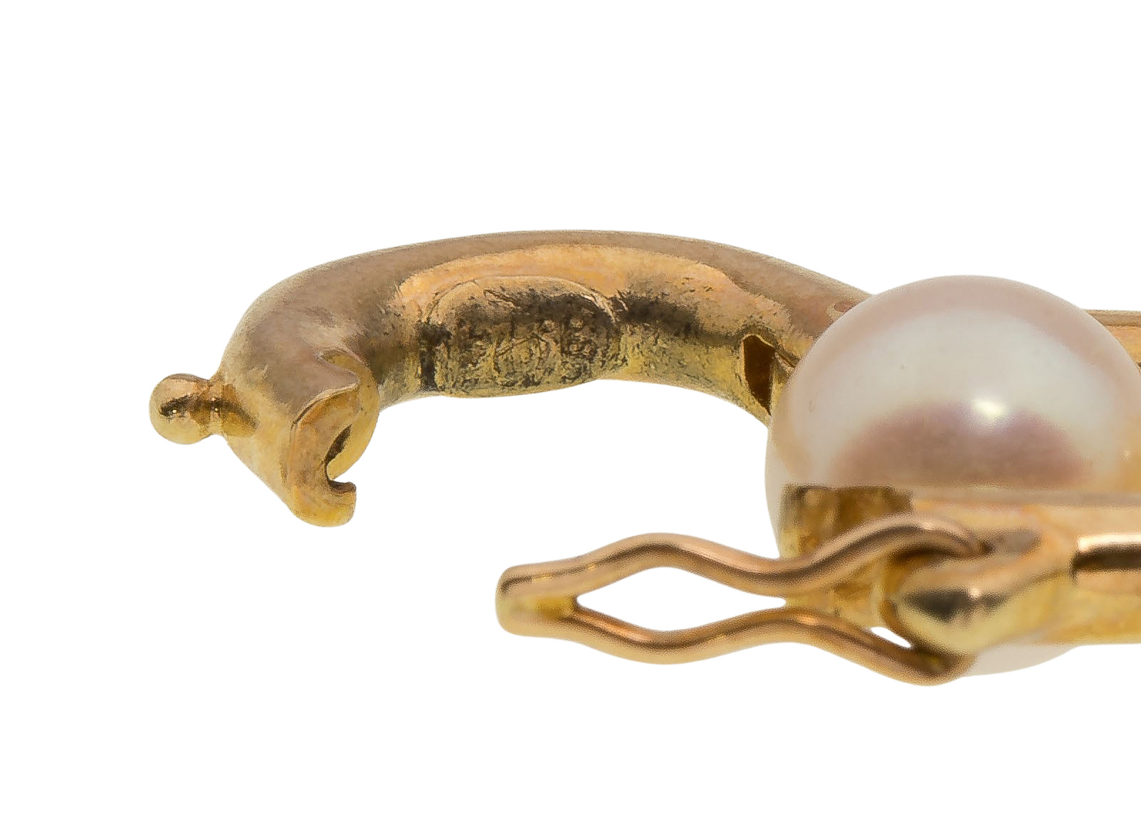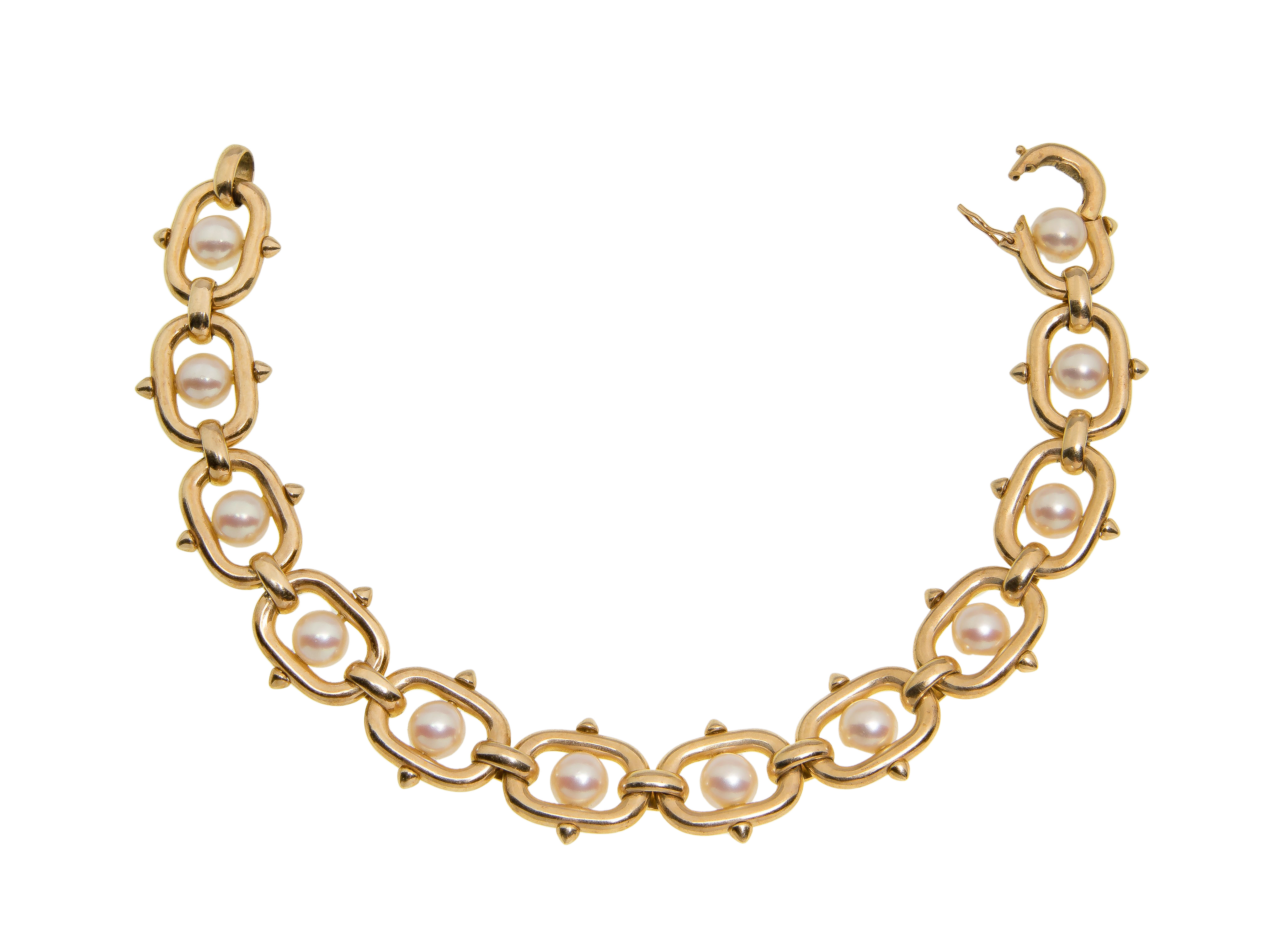 An oval link style bracelet having an approximately 6mm floating pearl in the center of each link (marked ‘585’)
