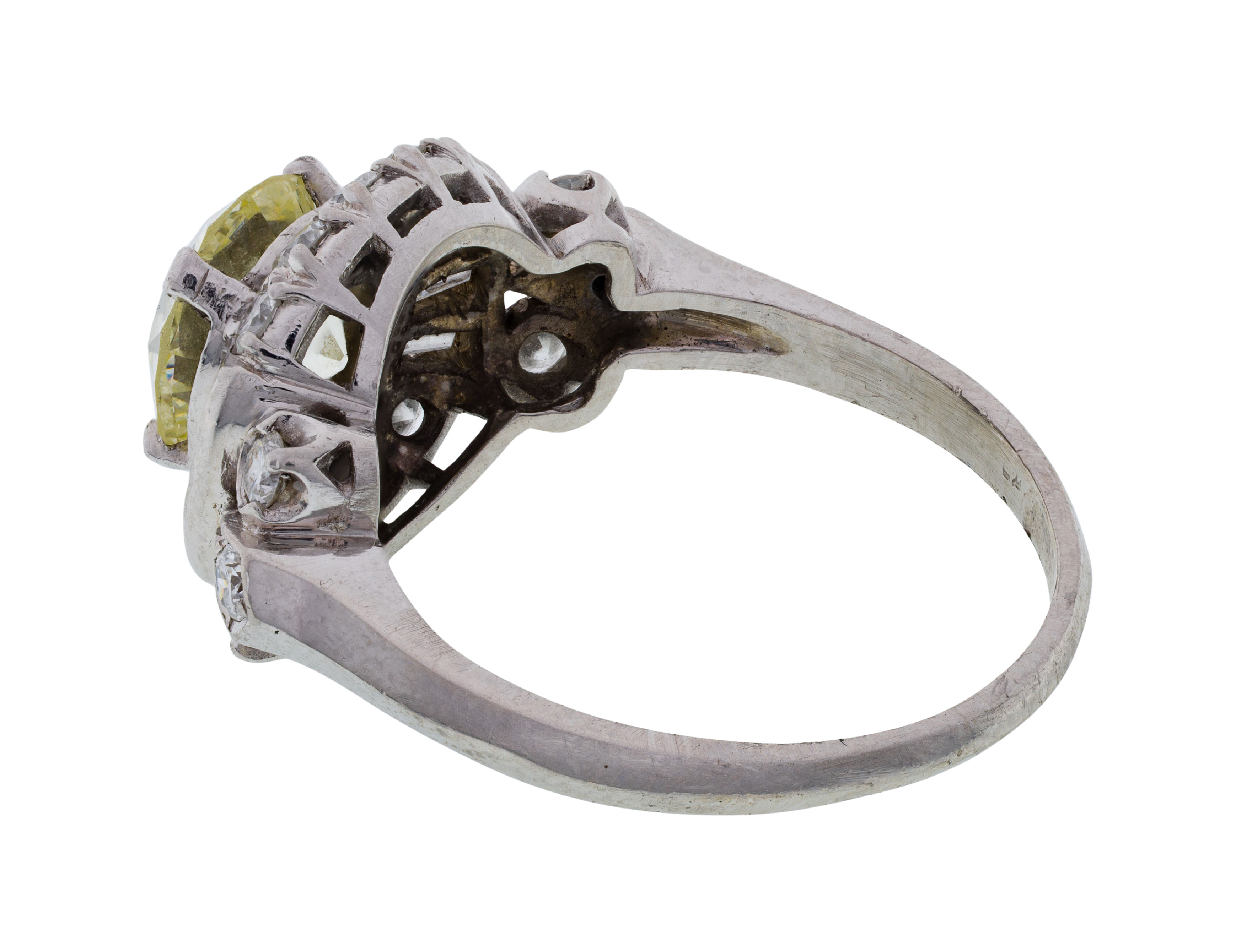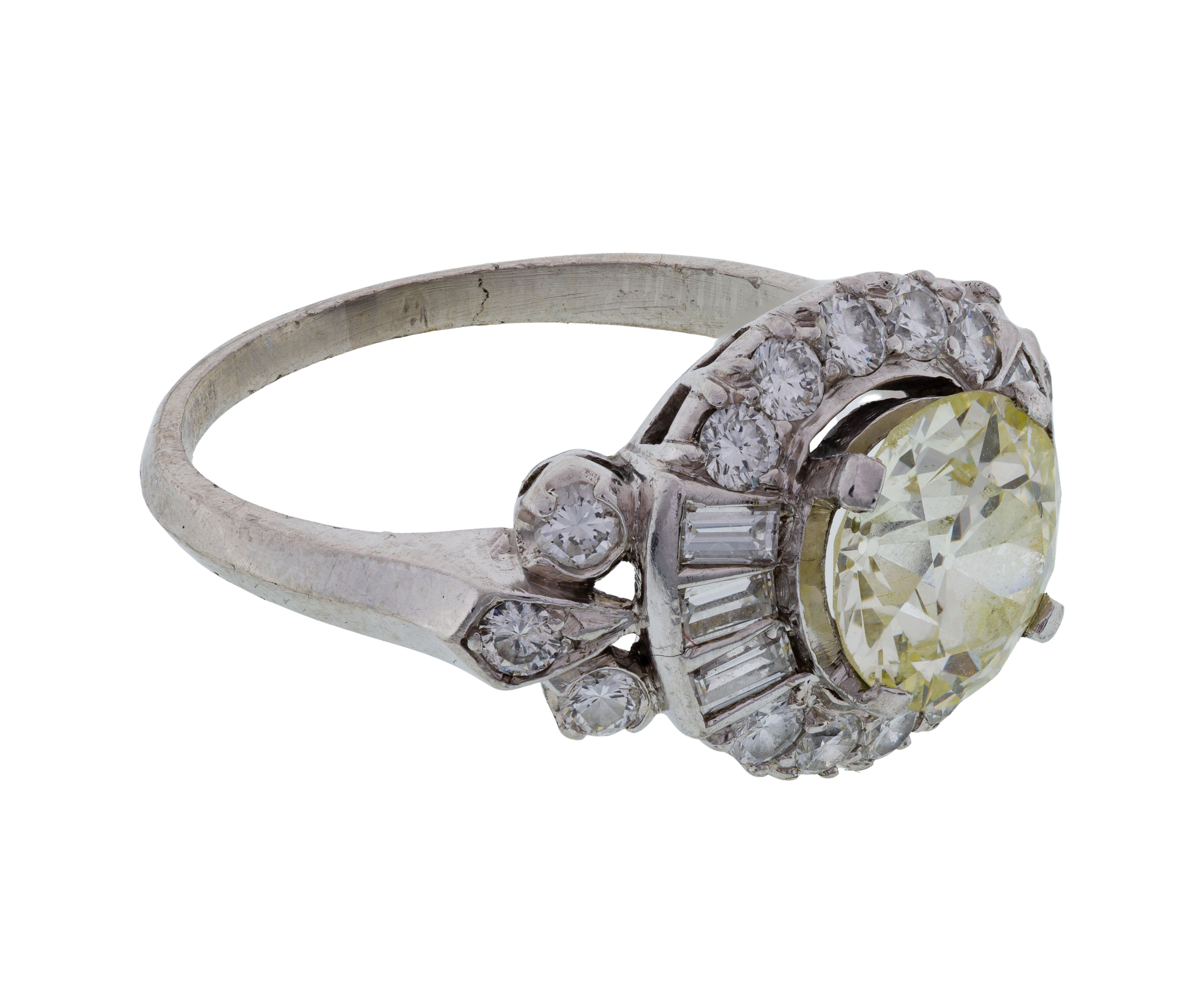 overall light wear consistent with normal use, edges on lower shank rough, florescence noted on (1) baguette diamond, unmarked but XRF tested as 100% platinum