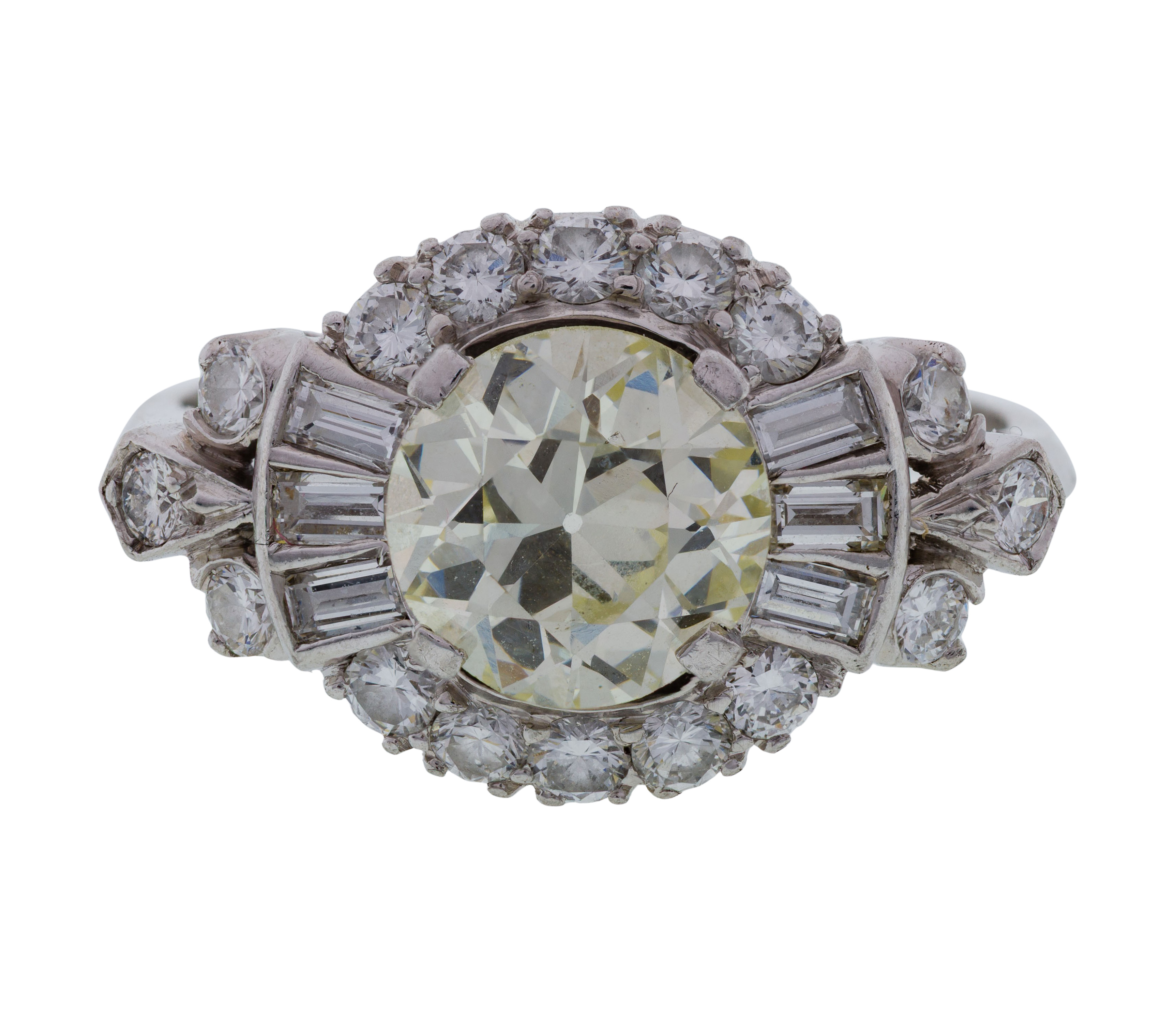 A round cut center diamond weighing approximately 1.76 carats, N/O color, SI clarity, surrounded by baguette and round cut diamonds in an architectural geometric design setting (unmarked platinum)